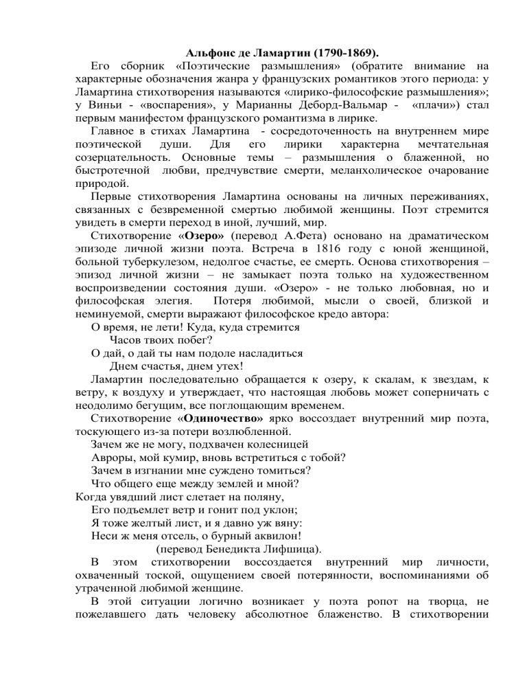Альфонс де Ламартин (1790-1869). Его сборник «Поэтические размышления» (обратите внимание на характерные обозначения жанра у французских романтиков этого периода: у Ламартина стихотворения называются «лирико-философские размышления»; у Виньи - «воспарения», у Марианны Деборд-Вальмар - «плачи») стал первым манифестом французского романтизма в лирике. Главное в стихах Ламартина - сосредоточенность на внутреннем мире поэтической души. Для его лирики характерна мечтательная созерцательность. Основные темы – размышления о блаженной, но быстротечной любви, предчувствие смерти, меланхолическое очарование природой. Первые стихотворения Ламартина основаны на личных переживаниях, связанных с безвременной смертью любимой женщины. Поэт стремится увидеть в смерти переход в иной, лучший, мир. Стихотворение «Озеро» (перевод А.Фета) основано на драматическом эпизоде личной жизни поэта. Встреча в 1816 году с юной женщиной, больной туберкулезом, недолгое счастье, ее смерть. Основа стихотворения – эпизод личной жизни – не замыкает поэта только на художественном воспроизведении состояния души. «Озеро» - не только любовная, но и философская элегия. Потеря любимой, мысли о своей, близкой и неминуемой, смерти выражают философское кредо автора: О время, не лети! Куда, куда стремится Часов твоих побег? О дай, о дай ты нам подоле насладиться Днем счастья, днем утех! Ламартин последовательно обращается к озеру, к скалам, к звездам, к ветру, к воздуху и утверждает, что настоящая любовь может соперничать с неодолимо бегущим, все поглощающим временем. Стихотворение «Одиночество» ярко воссоздает внутренний мир поэта, тоскующего из-за потери возлюбленной. Зачем же не могу, подхвачен колесницей Авроры, мой кумир, вновь встретиться с тобой? Зачем в изгнании мне суждено томиться? Что общего еще между землей и мной? Когда увядший лист слетает на поляну, Его подъемлет ветр и гонит под уклон; Я тоже желтый лист, и я давно уж вяну: Неси ж меня отсель, о бурный аквилон! (перевод Бенедикта Лифшица). В этом стихотворении воссоздается внутренний мир личности, охваченный тоской, ощущением своей потерянности, воспоминаниями об утраченной любимой женщине. В этой ситуации логично возникает у поэта ропот на творца, не пожелавшего дать человеку абсолютное блаженство. В стихотворении «Отчаяние» Ламартин пишет: «Рассудок мой смятен – ты мог, в том нет сомненья, - но ты не захотел». В творчестве Ламартина возникает образ «жестокого бога». Но за серией «отчаянных» стихов следуют покаянные. В них даны отречения от гордыни и бунтарства – стихотворения «Молитва», «Бог». Но они не создают впечатления однообразного благочестия. Поэма «Человек» построена на полемике с Байроном. В представлении Ламартина, Байрон – великий человек, но, как и все люди, ограничен в своих возможностях. Удел людей – «все ведать и исполнять». Сам поэт тоже хотел понять смысл жизни, тайны природы. Теперь он убежден, что человеку постигнуть это не дано. Человек живет для страдания и должен смириться с этим, понять, что в страдании его предназначение в мире, как «вода – течет, ветер - несется, солнце – жжет, а человек – страдает». Ламартин является самым последовательным продолжателем идей Шатобриана, он защищает христианское мироощущение и утверждает могущество вездесущего Бога. Стихотворения Ламартина отлича