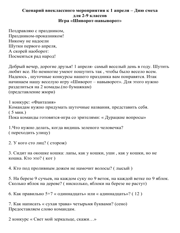 Сценарий внеклассного мероприятия к 1 апреля – Дню смеха для 2-9 классов Игра «Шиворот-навыворот» Поздравляю с праздником, Праздником-проказником! Никому не надоели Шутки первого апреля, А скорей наоборот: Посмеяться рад народ! Добрый вечер, дорогие друзья! 1 апреля- самый веселый день в году. Шутить любят все. Но немногие умеют пошутить так , чтобы было весело всем. Надеюсь , шуточные конкурсы нашего праздника вам понравятся. Итак начинаем нашу веселую игру «Шиворот – навыворот». Для этого нужно разделиться на 2 комады.(по бумажкам) (представление жюри) 1 конкурс: «Фантазия» Командам нужно придумать шуточные названия, представить себя. ( 5 мин.) Пока команды готовятся-игра со зрителями: « Дурацкие вопросы» 1.Что нужно делать, когда видишь зеленого человечка? ( переходить улицу) 2. У кого сто лиц? ( сторож) 3. Сидит на окошке кошка: лапы, как у кошки, уши , как у кошки, но не кошка. Кто это? ( кот ) 4. Кто под проливным дожем не намочит волосы? ( лысый ) 5. На березе 9 сучьев, на каждом суку по 9 веток, на каждой ветке по 9 яблок. Сколько яблок на дереве? ( нисколько, яблоки на березе не растут) 6. Как правильно 5+7 « одиннадцать» или « адиннадцать»? ( 12 ) 7. Как написать « сухая трава» четырьмя буквами? (сено) Предоставляем слово командам. 2 конкурс « Свет мой зеркальце, скажи…» Участники обоих команд садятся друг против друга. У каждого есть лист бумаги и карандаш. За 2 мин. каждый должен нарисовать портрет сидящего напротив человека.( Затем рисунки собираются, перемешиваются и отдаются командам) Каждый должен найти свой портрет. Жюри оценивает, насколько похожи портреты на оригиналы. Выигрывает та команда, чьи портреты имеют большое сходство. Игра со зрителями. Вы , несомненно любите остросюжетные произведения. Вот сюжет одного из них: во время прогулки неожиданно найден клад. По случаю находки состоялся праздник , который был омрачен появлением коварного злодея. Жизнь героини оказалась в опасности, но в последний момент появляется герой и убивает злодея. Все заканчивается свадьбой. Как зовут героиню произведения? ( Муха- Цокотуха) Свинья , собака , ворона , заяц. Эти животные известны всем малышам. Назовите имена этих животных. ( Хрюша, Филя, Каркуша, Степашка) Красный, желтый, зеленый, оранжевый, синий, голубой. Какого цвета в данном списке не хватает? ( фиолетовый .Радуга) 3 конкурс « Рукавицы и пуговицы» Из команд принимают участие по 2 человека (мальчик и девочка). Мальчикам даются рукавицы, девочки надевают халаты с пуговицами. Кто быстрее с помощью рукавиц застегнет пуговицы. 4 конкурс « Перевертыши» На листках бумаги записаны названия музыкальных групп, передач, названия книг. Кто быстрее расшифрует все эти названия, тот побеждает.Команды сами зачитывают задания и ответы. ( 2-3 мин.) Игра со зрителями «Пугало» Встанем все. Поднимите вверх правую руку, помашите, левую руку, помашите.Разведите руки в стороны, покачайте ими. Вытяните руки вперед, помашите ими. Поздравляю, вы прошли курсы огородных пугал, безработица вам не страшна. (итоги конкурса) 5 конкурс «Раздень ежика» Под соснами , под елками, Лежит клубок с иголками.(Еж) Следующий конкурс называется «Раздень ежика» Вызываются по 1 человеку из команд. Ведущий встает на стул, держа в руках 2 нитки с привязанными яблоками. Оба яблока утыканы спичками. Задача игроков заключается в том, чтобы зубами, без помощи рук, вытащит