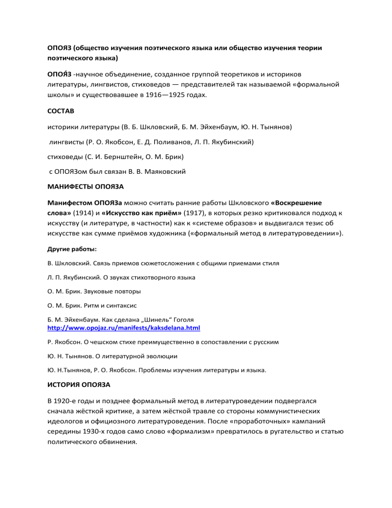 ОПОЯЗ (общество изучения поэтического языка или общество изучения теории поэтического языка) ОПОЯ́З -научное объединение, созданное группой теоретиков и историков литературы, лингвистов, стиховедов — представителей так называемой «формальной школы» и существовавшее в 1916—1925 годах. СОСТАВ историки литературы (В. Б. Шкловский, Б. М. Эйхенбаум, Ю. Н. Тынянов) лингвисты (Р. О. Якобсон, Е. Д. Поливанов, Л. П. Якубинский) стиховеды (С. И. Бернштейн, О. М. Брик) с ОПОЯЗом был связан В. В. Маяковский МАНИФЕСТЫ ОПОЯЗА Манифестом ОПОЯЗа можно считать ранние работы Шкловского «Воскрешение слова» (1914) и «Искусство как приём» (1917), в которых резко критиковался подход к искусству (и литературе, в частности) как к «системе образов» и выдвигался тезис об искусстве как сумме приёмов художника («формальный метод в литературоведении»). Другие работы: В. Шкловский. Связь приемов сюжетосложения с общими приемами стиля Л. П. Якубинский. О звуках стихотворного языка О. М. Брик. Звуковые повторы О. М. Брик. Ритм и синтаксис Б. М. Эйхенбаум. Как сделана „Шинель“ Гоголя http://www.opojaz.ru/manifests/kaksdelana.html Р. Якобсон. О чешском стихе преимущественно в сопоставлении с русским Ю. Н. Тынянов. О литературной эволюции Ю. Н.Тынянов, Р. О. Якобсон. Проблемы изучения литературы и языка. ИСТОРИЯ ОПОЯЗА В 1920-е годы и позднее формальный метод в литературоведении подвергался сначала жёсткой критике, а затем жёсткой травле со стороны коммунистических идеологов и официозного литературоведения. После «проработочных» кампаний середины 1930-х годов само слово «формализм» превратилось в ругательство и статью политического обвинения. В то же время, за рубежом формальный метод оказал влияние на появление структурализма (через посредство Пражского лингвистического кружка, в котором принял участие эмигрировавший Якобсон) и постструктурализма, а также на развитие семиотики/семиологии за рубежом и, позднее, в СССР и постсоветской России и других новых независимых государствах ВИКТОР ШКЛОВСКИЙ. «ИСКУССТВО КАК ПРИЕМ» В этой статье были впервые сформулированы ключевые для русского формализма понятия прием, остранение и автоматизация. Целью искусства является дать ощущение вещи, как видение, а не как узнавание; приемом искусства является прием „остранения“ вещей и прием затрудненной формы, увеличивающий трудность и долготу восприятия, так как воспринимательный процесс в искусстве самоцелен и должен быть продлен; искусство есть способ пережить деланье вещи, а сделанное в искусстве не важно. Прием остранения у Л. Толстого состоит в том, что он не называет вещь ее именем, а описывает ее, как в первый раз виденную, а случай — как в первый раз произошедший, при чем он употребляет в описании вещи не те названия ее частей, которые приняты, а называет их так, как называются соответственные части в других вещах. Методом остранения пользовался Толстой постоянно: в одном из случаев (Холстомер) рассказ ведется от лица лошади, и вещи остранены не нашим, а лошадиным их восприятием. ...существует два вида ритма. Ритм прозаический, ритм рабочей песни, дубинушки, с одной стороны заменяет команду при необходимости: „ухнуть разом“, с другой стороны облегчает работу, автоматизируя ее. И действительно, идти под музыку легче, чем без нее, но идти легче и под оживленный разговор, когда акт ходьбы уходит из нашего сознания. 