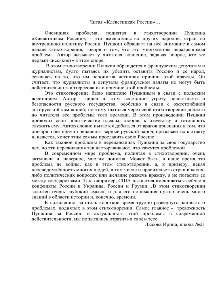 Читая «Клеветникам России»… Очевидная проблема, поднятая в стихотворении Пушкина «Клеветникам России», - это вмешательство других народов, стран во внутреннюю политику России. Пушкин обращает на неё внимание в самом начале стихотворения, говоря о том, что это многолетняя неразрешимая проблема. Автор вызывает у читателя волнение, задавая вопрос, кто же первый «иссякнет» в этом споре. В этом стихотворении Пушкин обращается к французским депутатам и журналистам, будто пытаясь их убедить оставить Россию и её народ, ссылаясь на то, что им непонятна истинная причина этой вражды. Он считает, что журналисты и депутаты французской палаты не могут быть действительно заинтересованы в причине этой проблемы. Это стихотворение было написано Пушкиным в связи с польским восстанием. Автор видел в этом восстании угрозу целостности и безопасности русского государства, особенно в связи с ожесточённой антирусской кампанией, поэтому пытался через своё стихотворение донести до читателя все проблемы того времени. В этом произведении Пушкин приводит свои политические идеалы, любовь к отечеству и готовность служить ему. Автор словно пытается добиться от врагов признания в том, что они зря и без причин ненавидят верный русский народ, призывает их к ответу и, кажется, хочет этим самым прославить свою Россию. Как таковой проблемы в переживаниях Пушкина за своё государство нет, но эти переживания так настораживают, что кажутся проблемой. В современном мире проблема, поднятая в стихотворении, очень актуальна и, наверное, многим понятна. Может быть, в наше время это проблема не войны, как в этом стихотворении, а, к примеру, некая неосведомлённость многих людей, в том числе и правительств стран в какихлибо политических вопросах или желание разжечь вражду, а не погасить ее между государствами. Так, например, США пытаются вмешиваться сейчас в конфликты России и Украины, России и Грузии…В этом стихотворении заложен очень глубокий смысл, и для его понимания нужно очень много знаний в области истории и, конечно, времени. К сожалению, за столь короткое время трудно развёрнуто написать о проблемах, поднятых в этом стихотворении. Самое главное - тревожность Пушкина за Россию и актуальность этой проблемы в современной действительности, мы попытались отразить в своём эссе. Лысова Ирина, школа №21