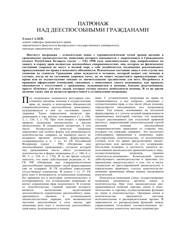 ПАТРОНАЖ НАД ДЕЕСПОСОБНЫМИ ГРАЖДАНАМИ Елена САЛЕЙ, доцент кафедры гражданского права юридического факультета Белорусского государственного университета, кандидат юридических наук Институт патронажа – относительно новое с терминологической точки зрения явление в гражданском законодательстве, появление которого связывается с закреплением в Гражданском кодексе Республики Беларусь (далее — ГК) 1998 года дополнительных мер, направленных на защиту и охрану прав полностью дееспособных совершеннолетних лиц, которые по физическому состоянию здоровья не могут в полной мере о себе позаботиться, полноценно реализовывать принадлежащие им права и исполнять обязанности. Психическое состояние лица в этом случае под сомнение не ставится. Гражданин лишь нуждается в человеке, который окажет ему помощь в случаях, когда он по состоянию здоровья хочет, но не может осуществить принадлежащие ему права или их осуществление связано со значительными трудностями для него. Потребность в правовом оформлении отношений, связанных с появлением такого помощника, как правило, связывается с отсутствием у гражданина, нуждающегося в помощи, близких родственников, просто «близких» для него людей, которые готовы оказать необходимую помощь. В то же время наличие таких лиц не является препятствием к установлению патронажа. П од патронажем понимается регулярное (постоянное) оказание помощи в осуществлении прав, их защите и исполнении обязанностей совершеннолетнему дееспособному гражданину, нуждающемуся в ней по состоянию своего здоровья. Такое определение является традиционным и уже вполне устоявшимся [1, с. 106; 2, с. 126; 3, с. 78]. При этом вопрос о правовой природе патронажа неоднозначен и весьма дискуссионен. В специальной литературе, в том числе белорусской, зачастую патронаж определяют как особую форму или разновидность попечительства, опираясь на имевшую место до недавнего времени легальную формулировку, содержавшуюся в п. 1 ст. 41 ГК Российской Федерации (далее - РФ) «Патронаж над дееспособными гражданами», согласно которой над гражданином могло «быть установлено попечительство в форме патронажа» [1, с. 106; 4, с. 99; 5, с. 124; 6, с. 176]. В то же время следует заметить, что ныне действующая редакция ст. 41 ГК РФ «Патронаж над совершеннолетними дееспособными гражданами» такой формулировки уже не содержит. В ГК подобное определение отсутствовало изначально. В пункте 1 ст. 37 ГК речь идет о возможности установления патронажа без привязки его к категории «попечительство» и подчеркивается, что установление патронажа не влечет ограничения прав подопечного. В отличие от попечительства, главной задачей которого является восполнение недостающей дееспособности ограниченно дееспособного лица, признанного таковым в установленном законодательством порядке, или являющегося частично дееспособным в силу закона, при патронаже речь идет о полностью дееспособных гражданах, нуждающихся в помощ- нике. С установлением патронажа их права не ограничиваются, а все вопросы, связанные с осуществлением прав, в том числе объем помощи, определяются находящимся под патронажем лицом. Тем самым, основываясь на легальной формулировке и с учетом целевой направленности сравниваемых категорий, считаем, что патронаж следует рассматривать как отдельный правовой институт, закрепляющий са