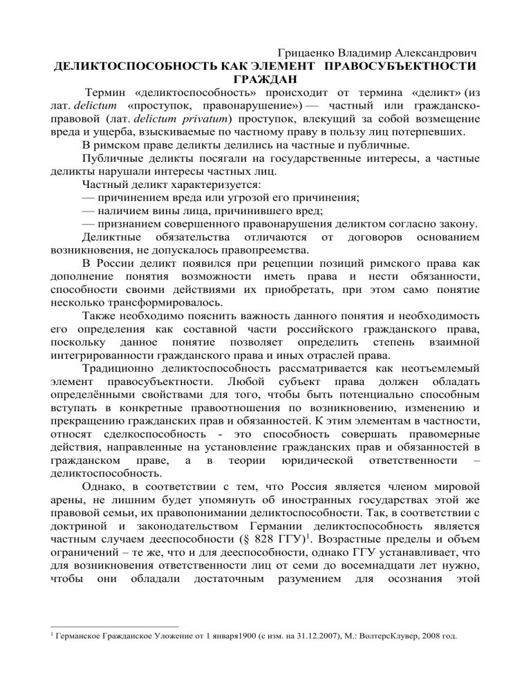 Грицаенко Владимир Александрович ДЕЛИКТОСПОСОБНОСТЬ КАК ЭЛЕМЕНТ ПРАВОСУБЪЕКТНОСТИ ГРАЖДАН Термин «деликтоспособность» происходит от термина «деликт» (из лат. delictum «проступок, правонарушение») — частный или гражданскоправовой (лат. delictum privatum) проступок, влекущий за собой возмещение вреда и ущерба, взыскиваемые по частному праву в пользу лиц потерпевших. В римском праве деликты делились на частные и публичные. Публичные деликты посягали на государственные интересы, а частные деликты нарушали интересы частных лиц. Частный деликт характеризуется: — причинением вреда или угрозой его причинения; — наличием вины лица, причинившего вред; — признанием совершенного правонарушения деликтом согласно закону. Деликтные обязательства отличаются от договоров основанием возникновения, не допускалось правопреемства. В России деликт появился при рецепции позиций римского права как дополнение понятия возможности иметь права и нести обязанности, способности своими действиями их приобретать, при этом само понятие несколько трансформировалось. Также необходимо пояснить важность данного понятия и необходимость его определения как составной части российского гражданского права, поскольку данное понятие позволяет определить степень взаимной интегрированности гражданского права и иных отраслей права. Традиционно деликтоспособность рассматривается как неотъемлемый элемент правосубъектности. Любой субъект права должен обладать определёнными свойствами для того, чтобы быть потенциально способным вступать в конкретные правоотношения по возникновению, изменению и прекращению гражданских прав и обязанностей. К этим элементам в частности, относят сделкоспособность - это способность совершать правомерные действия, направленные на установление гражданских прав и обязанностей в гражданском праве, а в теории юридической ответственности – деликтоспособность. Однако, в соответствии с тем, что Россия является членом мировой арены, не лишним будет упомянуть об иностранных государствах этой же правовой семьи, их правопонимании деликтоспособности. Так, в соответствии с доктриной и законодательством Германии деликтоспособность является частным случаем дееспособности (§ 828 ГГУ)1. Возрастные пределы и объем ограничений – те же, что и для дееспособности, однако ГГУ устанавливает, что для возникновения ответственности лиц от семи до восемнадцати лет нужно, чтобы они обладали достаточным разумением для осознания этой 1 Германское Гражданское Уложение от 1 января1900 (с изм. на 31.12.2007), М.: ВолтерсКлувер, 2008 год. ответственности (абз. 3 § 828 ГГУ). Такого же мнения придерживаются и в Швейцарии (ст. 16 ШГУ)1. В праве же Италии, Швейцарии, Бельгии, Японии, канадской провинции Квебек, штата США Луизианы и т.п. содержатся более определенные условия относительно деликтоспособности концепция абсолютной деликтоспособности, которую можно оспаривать в суде. Достижение деликтоспособности или определенного уровня развития сознания, которое предполагается у всех лиц, законодательно закрепляется в качестве предпосылки ответственности лиц за вред. Представляется, что закрепление в законе или судебном прецеденте требования об определенном уровне сознания причинителя вреда способствует стабильному развитию права и не позволит прийти к результату, при 