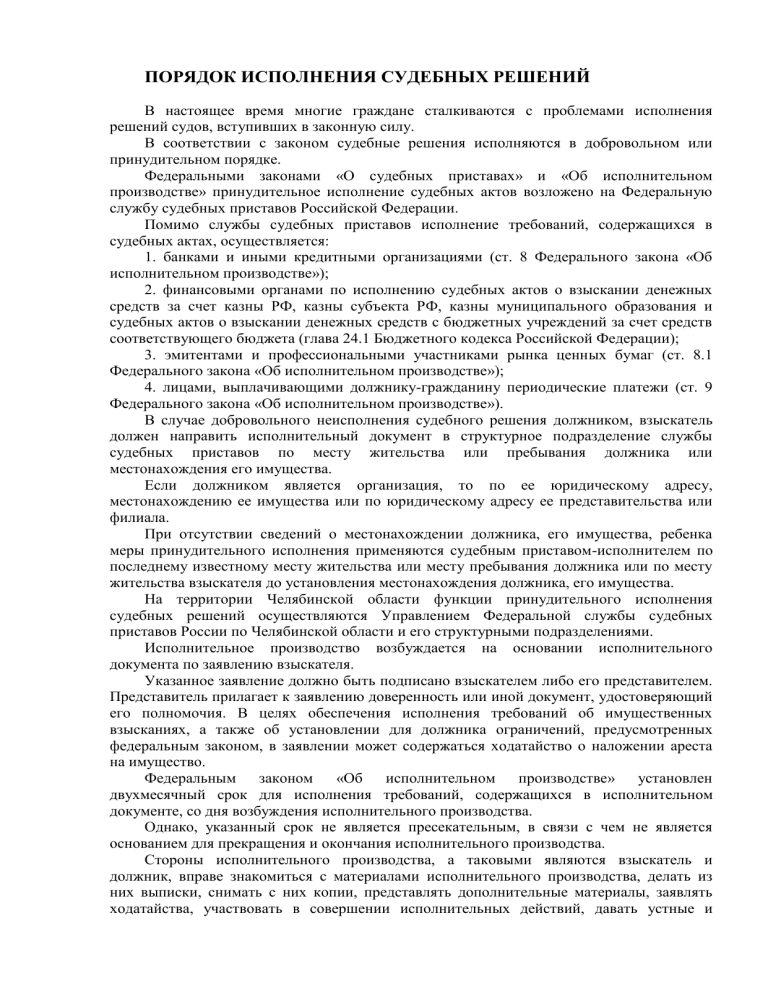 ПОРЯДОК ИСПОЛНЕНИЯ СУДЕБНЫХ РЕШЕНИЙ В настоящее время многие граждане сталкиваются с проблемами исполнения решений судов, вступивших в законную силу. В соответствии с законом судебные решения исполняются в добровольном или принудительном порядке. Федеральными законами «О судебных приставах» и «Об исполнительном производстве» принудительное исполнение судебных актов возложено на Федеральную службу судебных приставов Российской Федерации. Помимо службы судебных приставов исполнение требований, содержащихся в судебных актах, осуществляется: 1. банками и иными кредитными организациями (ст. 8 Федерального закона «Об исполнительном производстве»); 2. финансовыми органами по исполнению судебных актов о взыскании денежных средств за счет казны РФ, казны субъекта РФ, казны муниципального образования и судебных актов о взыскании денежных средств с бюджетных учреждений за счет средств соответствующего бюджета (глава 24.1 Бюджетного кодекса Российской Федерации); 3. эмитентами и профессиональными участниками рынка ценных бумаг (ст. 8.1 Федерального закона «Об исполнительном производстве»); 4. лицами, выплачивающими должнику-гражданину периодические платежи (ст. 9 Федерального закона «Об исполнительном производстве»). В случае добровольного неисполнения судебного решения должником, взыскатель должен направить исполнительный документ в структурное подразделение службы судебных приставов по месту жительства или пребывания должника или местонахождения его имущества. Если должником является организация, то по ее юридическому адресу, местонахождению ее имущества или по юридическому адресу ее представительства или филиала. При отсутствии сведений о местонахождении должника, его имущества, ребенка меры принудительного исполнения применяются судебным приставом-исполнителем по последнему известному месту жительства или месту пребывания должника или по месту жительства взыскателя до установления местонахождения должника, его имущества. На территории Челябинской области функции принудительного исполнения судебных решений осуществляются Управлением Федеральной службы судебных приставов России по Челябинской области и его структурными подразделениями. Исполнительное производство возбуждается на основании исполнительного документа по заявлению взыскателя. Указанное заявление должно быть подписано взыскателем либо его представителем. Представитель прилагает к заявлению доверенность или иной документ, удостоверяющий его полномочия. В целях обеспечения исполнения требований об имущественных взысканиях, а также об установлении для должника ограничений, предусмотренных федеральным законом, в заявлении может содержаться ходатайство о наложении ареста на имущество. Федеральным законом «Об исполнительном производстве» установлен двухмесячный срок для исполнения требований, содержащихся в исполнительном документе, со дня возбуждения исполнительного производства. Однако, указанный срок не является пресекательным, в связи с чем не является основанием для прекращения и окончания исполнительного производства. Стороны исполнительного производства, а таковыми являются взыскатель и должник, вправе знакомиться с материалами исполнительного производства, делать из них выписки, снимать с них копии, представля