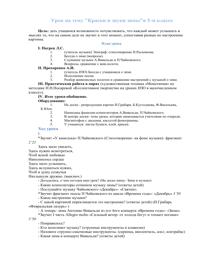 Урок на тему "Краски и звуки зимы"в 5-м классе Цель: дать учащимся возможность почувствовать, что каждый может услышать в мыслях то, что на самом деле не звучит в этот момент, сопоставив разные по настроению картины. План урока. I. Пагрец Л.С. 1. 2. 3. 4. (учитель музыки) Эпиграф: стихотворение Н.Рыленкова. Беседа о зиме (вопросы). Слушание музыки А.Вивальди и П.Чайковского. Вопросы, сравнение с жив.полотн. II. Прохоренко А.И. 1. 2. 3. (учитель ИЗО) Беседа с учащимися о зиме. Исполнение песни. Разбор живописных полотен и сравнение настроений с музыкой о зиме. III. Практическая работа в парах (художественная техника «Монотипия» по методике Н.Н.Носаревой «Коллективное творчество на уроках ИЗО в малочисленном классе»). IV. Итог урока-обобщение. Оборудование: 1. К.Юон. 2. 3. 4. 5. На доске - репродукции картин И.Грабаря, Б.Кустодиева, Ф.Васильева, Написаны фамилии композиторов А.Вивальди, П.Чайковского. В центре доски- тема урока, которая записывается учителями по очереди. Магнитофон с дисками, кассетой фонограммы. У учащихся: листы бумаги, клей, краски. Ход урока I. *Звучит «У камелька» П.Чайковского (Стихотворение- на фоне музыки)- фрагмент 2’21 Здесь мало увидеть, Здесь нужно всмотреться, Чтоб ясной любовью Наполнилось сердце Здесь мало услышать, Здесь вслушаться нужно, Чтоб в душу созвучья Нахлынули дружно. (выключ.) - Догадались, о чем сегодня наш урок? (На доске пишу- Зима в музыке) - Какие композиторы сочиняли музыку зимы? (ответы детей) - Послушайте музыку Чайковского «Декабрь»- «Святки». *Звучит фрагмент пьесы П.Чайковского из цикла «Времена года»- «Декабрь» 3’50 - Какое настроение музыки? - С какой картиной перекликается это настроение? (ответы детей) (И.Грабарь «Февральская лазурь» ) - А теперь- зима Антонио Вивальди из его 4ого концерта «Времена года»- «Зима». *Звучит I часть Allegro molto «Сильный ветер- от холода бегут и топают ногами» 3’50 - Понравилось? - Кто исполняет музыку? (струнные инструменты и клавесин) - Назовите струнно-смычковые инструменты. (скрипка, виолончель, альт, контрабас) - Какая зима в концерте Вивальди? (ответы детей) - Послушайте, какой эпиграф к этой части взял композитор: Морозной гладью стелется дорога, И человек, иззябшими ногами Протаптывая путь, стуча зубами, Бежит, чтобы согреться хоть немного. - Какой темп? (быстрый) - Динамика? (громко, усиливается и затихает) - С какой картиной можно сравнить настроение этого музыкального произведения? (К.Юон «Вид Троицкой Лавры») II. Красота природы, смена времен года, а каждое из них- осень, зима, весна и летонеповторимое, особенное, всегда были источником вдохновения для поэтов, музыкантов, художников! Есть живописцы, которые все свое творчество посвятили изображению природы. - Как называется картина, на которой изображена природа? (пейзаж) - А художники, которые изображают природу? (пейзажисты) Это замечательные выдающиеся мастера пейзажа Константин Юон, Иван Шишкин, Исаак Левитан, Василий Поленов и многие другие. Сегодня на уроке мы будем говорить только о зиме. Перед вами репродукции (на доске названия) известных мастеров живописи: 1. 2. 3. 4. И.Грабарь «Февральская лазурь», Б.Кустодиев «Масленница», Ф.Васильев «Оттепель», К.Юон «Вид Троицкой Лавры». - Что объединяет эти репродукции? - Поднимите руки те, кто любит зиму. Почему? (ответы детей) *Исполните песню «Новогодний карнавал» Хороша наша русская зима! Огромное снежное 