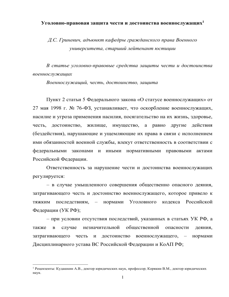 Уголовно-правовая защита чести и достоинства военнослужащих1 Д.С. Гриневич, адъюнкт кафедры гражданского права Военного университета, старший лейтенант юстиции В статье уголовно-правовые средства защиты чести и достоинства военнослужащих Военнослужащий, честь, достоинство, защита Пункт 2 статьи 5 Федерального закона «О статусе военнослужащих» от 27 мая 1998 г. № 76-ФЗ, устанавливает, что оскорбление военнослужащих, насилие и угроза применения насилия, посягательство на их жизнь, здоровье, честь, достоинство, жилище, имущество, а равно другие действия (бездействия), нарушающие и ущемляющие их права в связи с исполнением ими обязанностей военной службы, влекут ответственность в соответствии с федеральными законами и иными нормативными правовыми актами Российской Федерации. Ответственность за нарушение чести и достоинства военнослужащих регулируется: – в случае умышленного совершения общественно опасного деяния, затрагивающего честь и достоинство военнослужащего, которое привело к тяжким последствиям, – нормами Уголовного кодекса Российской Федерации (УК РФ); – при условии отсутствия последствий, указанных в статьях УК РФ, а также в случае затрагивающего незначительной честь и общественной достоинство опасности военнослужащего, – деяния, нормами Дисциплинарного устава ВС Российской Федерации и КоАП РФ; Рецензенты: Кудашкин А.В., доктор юридических наук, профессор; Корякин В.М., доктор юридических наук. 1 1 – независимо от квалификации деяния, затрагивающего честь и достоинство военнослужащего, – нормами гражданского законодательства. В настоящей статье автор остановится на некоторых вопросах уголовно-правовой защиты нематериальных благ военнослужащих. Военнослужащие, обладая двойным (общим и специальным) правовым статусом, могут защищать личную честь и достоинство на общих основаниях, указанных в УК РФ предусматривающих ответственность за клевету (ст. 129) и оскорбление (ст.130). Кроме того, законодатель предусмотрел повышенную защиту таких нематериальных благ как: честь и достоинство военнослужащих, путем криминализации таких деяний как, нарушение уставных правил взаимоотношений между военнослужащими при отсутствии между ними отношений подчиненности (ст. 335 УК РФ) и оскорбление военнослужащего (ст. 336 УК РФ). Для проведения дальнейшего исследования необходимо отграничить преступления против чести и достоинства военнослужащих от дисциплинарных проступков, посягающих на этот же объект. Решение вопроса о преступном характере правонарушения зависит от способа описания в законе признаков преступления. В данном случае имеется в виду описание того или иного преступления в диспозиции статей гл. 33 УК Российской Федерации. Если в статьях гл. 33 УК Российской Федерации указаны точно определяемые (конкретные) признаки преступления, например, причинение средней тяжести вреда здоровью при сопротивлении начальнику (ст. 333 УК РФ), то определение преступности деяния, как правило, не вызывает сложности. При установлении в содеянном всех конкретно описанных признаков в той или иной норме гл. 33 УК РФ следует относить данное правонарушение к воинскому преступлению, т.е. признать за ним свойство уголовно-правовой противоправности. 2 В отдельных нормах преступление против военной службы характеризуется не строго определенными, а