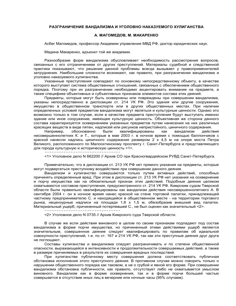 РАЗГРАНИЧЕНИЕ ВАНДАЛИЗМА И УГОЛОВНО НАКАЗУЕМОГО ХУЛИГАНСТВА А. МАГОМЕДОВ, М. МАКАРЕНКО Асбег Магомедов, профессор Академии управления МВД РФ, доктор юридических наук. Мадина Макаренко, адъюнкт той же академии. Разнообразие форм вандализма обусловливает необходимость рассмотрения вопросов, связанных с его отграничением от других преступлений. Материалы судебной и следственной практики показывают, что решение данной проблемы всегда вызывает у правоприменителей затруднения. Наибольшие сложности возникают, как правило, при разграничении вандализма и уголовно наказуемого хулиганства. Указанные преступления совпадают по основному непосредственному объекту, в качестве которого выступает система общественных отношений, связанных с обеспечением общественного порядка. Поэтому при их разграничении необходимо акцентировать внимание на предмете, а также специфике объективных и субъективных признаков элементов состава этих деяний. Предметы, которые могут быть осквернены или повреждены при совершении вандализма, указаны непосредственно в диспозиции ст. 214 УК РФ. Это здания или другие сооружения, имущество в общественном транспорте или в других общественных местах. При наличии определенных условий предметом вандализма могут являться и культурные ценности. Однако это возможно только в том случае, если в качестве предмета преступления будут выступать именно здание или иное сооружение, имеющее культурную ценность. Объективная же сторона данного состава характеризуется осквернением указанных предметов путем нанесения на них различных красящих веществ в виде пятен, надписей или рисунков непристойного, циничного содержания. Например, обоснованно были квалифицированы как вандализм действия несовершеннолетних К. и Т., которые в мае 2003 г. в ночное время с помощью баллончиков с краской нанесли надпись циничного содержания размером 2 x 4,5 м на опоре моста Петра Великого, расположенного по Малоохтинскому проспекту г. Санкт-Петербурга и представляющего для города культурную и историческую ценность <1>. -------------------------------<1> Уголовное дело N 662200 // Архив СО при Красногвардейском РУВД Санкт-Петербурга. Примечательно, что в диспозиции ст. 213 УК РФ нет прямого указания на предметы, которые могут подвергаться преступному воздействию при совершении данного деяния. Вандализм и хулиганство совершаются только путем активных действий, способных причинять определенный вред. При этом в диспозиции ст. 213 УК РФ нет указания на осквернение и порчу имущества как на обязательный признак этих действий. Подобные деяния целиком охватываются составом преступления, предусмотренного ст. 214 УК РФ. Кимрским судом Тверской области были правильно квалифицированы как вандализм действия несовершеннолетнего А. В сентябре 2004 г. он в ночное время нанес краской на стене торговой палатки, принадлежащей частному предпринимателю С. и находящейся в общественном месте - на территории торгового рынка, нецензурные надписи на площади 1,8 x 1,5 м, обезобразив внешний вид палатки. Материальный ущерб, причиненный потерпевшей С., не был оценен как значительный <2>. -------------------------------<2> Уголовное дело N 0735 // Архив Кимрского суда Тверской области. В случае же если действия виновного в целом по своим признакам подпадают под состав вандализма в форме порчи имущества, но причиненный
