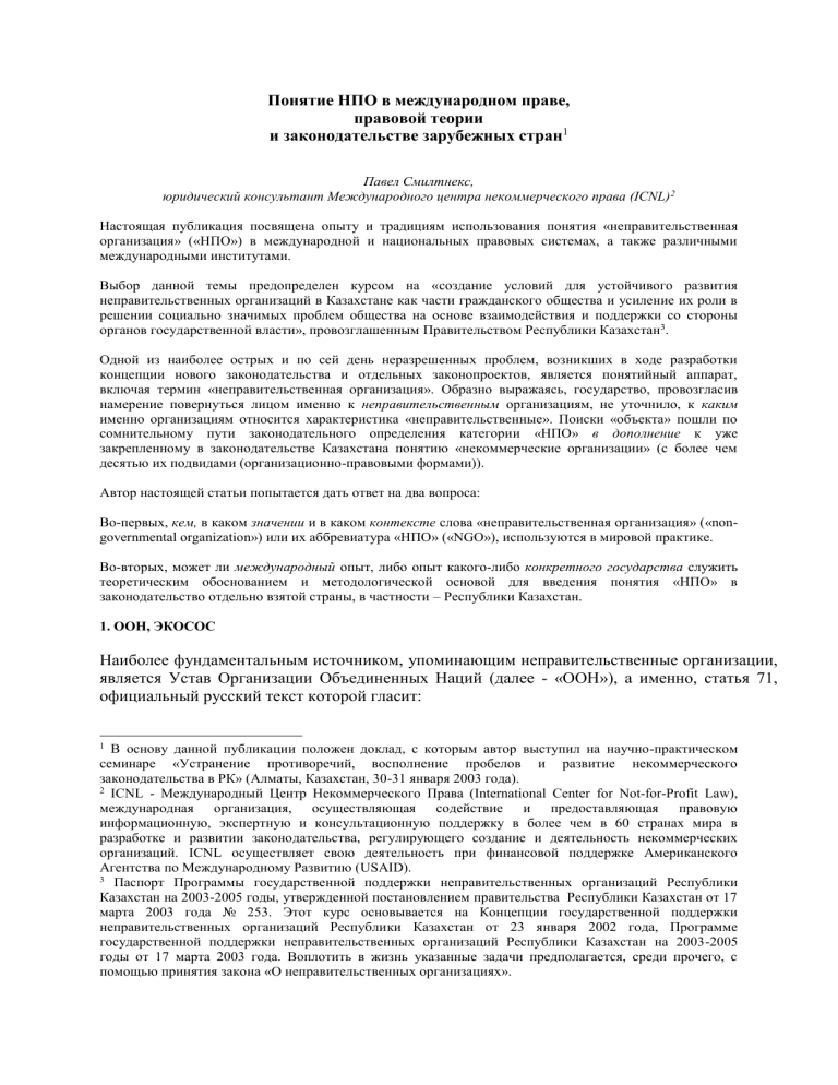 Понятие НПО в международном праве, правовой теории и законодательстве зарубежных стран1 Павел Смилтнекс, юридический консультант Международного центра некоммерческого права (ICNL) 2 Настоящая публикация посвящена опыту и традициям использования понятия «неправительственная организация» («НПО») в международной и национальных правовых системах, а также различными международными институтами. Выбор данной темы предопределен курсом на «создание условий для устойчивого развития неправительственных организаций в Казахстане как части гражданского общества и усиление их роли в решении социально значимых проблем общества на основе взаимодействия и поддержки со стороны органов государственной власти», провозглашенным Правительством Республики Казахстан3. Одной из наиболее острых и по сей день неразрешенных проблем, возникших в ходе разработки концепции нового законодательства и отдельных законопроектов, является понятийный аппарат, включая термин «неправительственная организация». Образно выражаясь, государство, провозгласив намерение повернуться лицом именно к неправительственным организациям, не уточнило, к каким именно организациям относится характеристика «неправительственные». Поиски «объекта» пошли по сомнительному пути законодательного определения категории «НПО» в дополнение к уже закрепленному в законодательстве Казахстана понятию «некоммерческие организации» (с более чем десятью их подвидами (организационно-правовыми формами)). Автор настоящей статьи попытается дать ответ на два вопроса: Во-первых, кем, в каком значении и в каком контексте слова «неправительственная организация» («nongovernmental organization») или их аббревиатура «НПО» («NGO»), используются в мировой практике. Во-вторых, может ли международный опыт, либо опыт какого-либо конкретного государства служить теоретическим обоснованием и методологической основой для введения понятия «НПО» в законодательство отдельно взятой страны, в частности – Республики Казахстан. 1. ООН, ЭКОСОС Наиболее фундаментальным источником, упоминающим неправительственные организации, является Устав Организации Объединенных Наций (далее - «ООН»), а именно, статья 71, официальный русский текст которой гласит: В основу данной публикации положен доклад, с которым автор выступил на научно-практическом семинаре «Устранение противоречий, восполнение пробелов и развитие некоммерческого законодательства в РК» (Алматы, Казахстан, 30-31 января 2003 года). 2 ICNL - Международный Центр Некоммерческого Права (International Center for Not-for-Profit Law), международная организация, осуществляющая содействие и предоставляющая правовую информационную, экспертную и консультационную поддержку в более чем в 60 странах мира в разработке и развитии законодательства, регулирующего создание и деятельность некоммерческих организаций. ICNL осуществляет свою деятельность при финансовой поддержке Американского Агентства по Международному Развитию (USAID). 3 Паспорт Программы государственной поддержки неправительственных организаций Республики Казахстан на 2003-2005 годы, утвержденной постановлением правительства Республики Казахстан от 17 марта 2003 года № 253. Этот курс основывается на Концепции государственной поддержки неправительственных организаций Республики Казахстан от 23 января 2002 года, Программе государстве