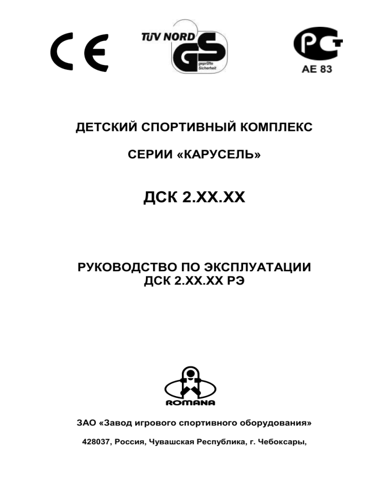ДЕТСКИЙ СПОРТИВНЫЙ КОМПЛЕКС СЕРИИ «КАРУСЕЛЬ» ДСК 2.ХХ.ХХ РУКОВОДСТВО ПО ЭКСПЛУАТАЦИИ ДСК 2.ХХ.ХХ РЭ ЗАО «Завод игрового спортивного оборудования» 428037, Россия, Чувашская Республика, г. Чебоксары, Содержание РЭ № 1 2 3 Стр 3.1 3.2 3.3 4 5 5.1 5.2 6 6.1 6.2 6.3 6.4 6.5 6.6 7 7.1 7.2 7.3 8 8.1 8.2 8.3 9 10 11 12 13 14 НАЗНАЧЕНИЕ ТЕХНИЧЕСКИЕ ХАРАКТЕРИСТИКИ УСТРОЙСТВО Состав изделия Сведения по применённым материалам Отличия модификаций изделий КОМПЛЕКТНОСТЬ ИНСТРУКЦИЯ ПО УСТАНОВКЕ Эксплуатационные ограничения Размещение КОМПЛЕКСА в помещении ИНСТРУКЦИЯ ПО СБОРКЕ Подготовка к сборке, инструменты и приспособления Меры безопасности Последовательность сборки узлов Последовательность монтажа КОМПЛЕКСА Указания по размещению навесного оборудования Контроль правильности монтажа ИНСТРУКЦИЯ ПО ОБСЛУЖИВАНИЮ И УХОДУ Осмотр и проверка металлоконструкций КОМПЛЕКСА Осмотр и проверка навесных спортивных снарядов Регулировка и испытания ИНСТРУКЦИЯ ПО ЭКСПЛУАТАЦИИ Меры безопасности Указания по эксплуатации Рекомендации по спортивным упражнениям ТРАНСПОРТИРОВКА И ХРАНЕНИЕ УТИЛИЗАЦИЯ ГАРАНТИЙНЫЕ ОБЯЗАТЕЛЬСТВА СВИДЕТЕЛЬСТВО ОБ УПАКОВЫВАНИИ СВИДЕТЕЛЬСТВО О ПРИЁМКЕ ОТМЕТКА О ПРОДАЖЕ Адрес предприятия изготовителя Настоящее руководство по эксплуатации (РЭ) служит для ознакомления с правилами сборки, монтажа, безопасной эксплуатации, обслуживания, транспортировки и хранения изделия «Детский спортивный комплекс» серии «Карусель» (далее – КОМПЛЕКС). РЭ распространяется на модели и исполнения КОМПЛЕКСОВ: модель ДСК 2.01.ХХ – исполнения 2.01.01 …. 2.01.08; модель ДСК 2.02.ХХ – исполнения 2.02.01 …. 2.01.08; модель ДСК 2.03.ХХ – исполнения 2.03.01 …. 2.01.08; Безопасность КОМПЛЕКСА подтверждена сертификатом соответствия Госстандарта России. Сертификат соответствия № РОСС RU.АЕ83.Н06295. 1. НАЗНАЧЕНИЕ 1.1 «Детский спортивный комплекс» серии «Карусель» (далее КОМПЛЕКС) модели ДСК 2.0Х.ХХ применяется при выполнении спортивных и игровых упражнений детьми старше 4-х лет, с общей нагрузкой не более 100кг. 1.2 КОМПЛЕКС предназначен для эксплуатации внутри жилых помещений, с высотой помещений от 2,4м до 2,9м. 2 2. ТЕХНИЧЕСКИЕ ХАРАКТЕРИСТИКИ Основные технические характеристики приведены в таблице 1. Таблица 1 Величина, для моделей ДСК Нормируемые параметры ДСК 2.01. ХХ ДСК 2.02. ХХ ДСК 2.03. ХХ длина 1,10 0,75 0,60 Габаритные ширина 0,55 размеры, м высота от 2,40 до 2,90 Вес нетто, кг, не более 35 Максимальная нагрузка, кг 100 Минимальный возраст ребенка, лет 4 Срок службы, лет (не менее). 5 3. УСТРОЙСТВО 3.1 Состав изделия. 3.1.1 КОМПЛЕКС представляет собой сборно-разборную каркасную конструкцию из металлических труб, закрепленную между полом и потолком враспор. 3.1.2 Основными составными элементами КОМПЛЕКСА являются: вертикальная «шведская лестница»; горизонтальная неподвижная верхняя рама. 3.1.3 Для выполнения спортивных упражнений и проведения игр на элементы КОМПЛЕКСА могут устанавливаться навесные и встраиваемые спортивные снаряды, указанные в таблице 2: Таблица 2 № Обозначение Наименование Место установки 1 ВО-91.02 Канат 2 ВО-91.03 Кольца гимнастические верхняя рама 4 5 6 7 8 9 ВО-91.05 ВО-92.01 ВО-92.02 ВО-92.03 ВО-92.04 ВО-92.05 Лестница веревочная Турник навесной Брусья навесные Турник-брусья комбинированные Щит баскетбольный Доска гимнастическая шведская лестница 3.2 Сведения по применённым материалам. 3.2.1 Металлические каркасы КОМПЛЕКСА и встраиваемых спортив