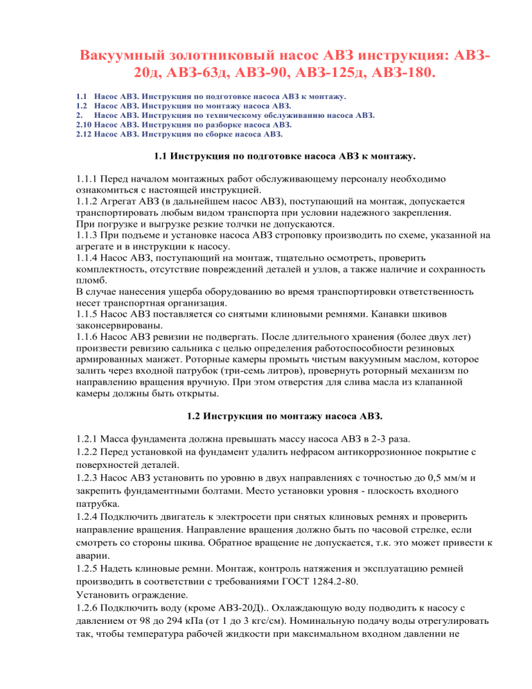 Вакуумный золотниковый насос АВЗ инструкция: АВЗ20д, АВЗ-63д, АВЗ-90, АВЗ-125д, АВЗ-180. 1.1 Насос АВЗ. Инструкция по подготовке насоса АВЗ к монтажу. 1.2 Насос АВЗ. Инструкция по монтажу насоса АВЗ. 2. Насос АВЗ. Инструкция по техническому обслуживанию насоса АВЗ. 2.10 Насос АВЗ. Инструкция по разборке насоса АВЗ. 2.12 Насос АВЗ. Инструкция по сборке насоса АВЗ. 1.1 Инструкция по подготовке насоса АВЗ к монтажу. 1.1.1 Перед началом монтажных работ обслуживающему персоналу необходимо ознакомиться с настоящей инструкцией. 1.1.2 Агрегат АВЗ (в дальнейшем насос АВЗ), поступающий на монтаж, допускается транспортировать любым видом транспорта при условии надежного закрепления. При погрузке и выгрузке резкие толчки не допускаются. 1.1.3 При подъеме и установке насоса АВЗ строповку производить по схеме, указанной на агрегате и в инструкции к насосу. 1.1.4 Насос АВЗ, поступающий на монтаж, тщательно осмотреть, проверить комплектность, отсутствие повреждений деталей и узлов, а также наличие и сохранность пломб. В случае нанесения ущерба оборудованию во время транспортировки ответственность несет транспортная организация. 1.1.5 Насос АВЗ поставляется со снятыми клиновыми ремнями. Канавки шкивов законсервированы. 1.1.6 Насос АВЗ ревизии не подвергать. После длительного хранения (более двух лет) произвести ревизию сальника с целью определения работоспособности резиновых армированных манжет. Роторные камеры промыть чистым вакуумным маслом, которое залить через входной патрубок (три-семь литров), провернуть роторный механизм по направлению вращения вручную. При этом отверстия для слива масла из клапанной камеры должны быть открыты. 1.2 Инструкция по монтажу насоса АВЗ. 1.2.1 Масса фундамента должна превышать массу насоса АВЗ в 2-3 раза. 1.2.2 Перед установкой на фундамент удалить нефрасом антикоррозионное покрытие с поверхностей деталей. 1.2.3 Насос АВЗ установить по уровню в двух направлениях с точностью до 0,5 мм/м и закрепить фундаментными болтами. Место установки уровня - плоскость входного патрубка. 1.2.4 Подключить двигатель к электросети при снятых клиновых ремнях и проверить направление вращения. Направление вращения должно быть по часовой стрелке, если смотреть со стороны шкива. Обратное вращение не допускается, т.к. это может привести к аварии. 1.2.5 Надеть клиновые ремни. Монтаж, контроль натяжения и эксплуатацию ремней производить в соответствии с требованиями ГОСТ 1284.2-80. Установить ограждение. 1.2.6 Подключить воду (кроме АВЗ-20Д).. Охлаждающую воду подводить к насосу с давлением от 98 до 294 кПа (от 1 до 3 кгс/см). Номинальную подачу воды отрегулировать так, чтобы температура рабочей жидкости при максимальном входном давлении не превышала наибольшей величины, указанной в таблице характеристик насоса АВЗ. 1.2.7 На выходе из откачиваемого объема, но не ближе 800 мм от входа в насос, нужно установить сетчатый фильтр. Рекомендуемая схема установки фильтра приведена в подробной инструкции насоса АВЗ. 1.2.8 Присоединить выходной трубопровод к выходному патрубку агрегата. Трубопровод должен иметь в непосредственной близости от места присоединения к агрегату колено с углом загиба не менее 90° и сильфонную развязку. 1.2.9 Залить вакуумное масло в насос через заливочное отверстие в маслоотделителе. Для двухступенчатых насосов (кроме АВЗ-20Д) следует предварительно выкрутить сливную пр
