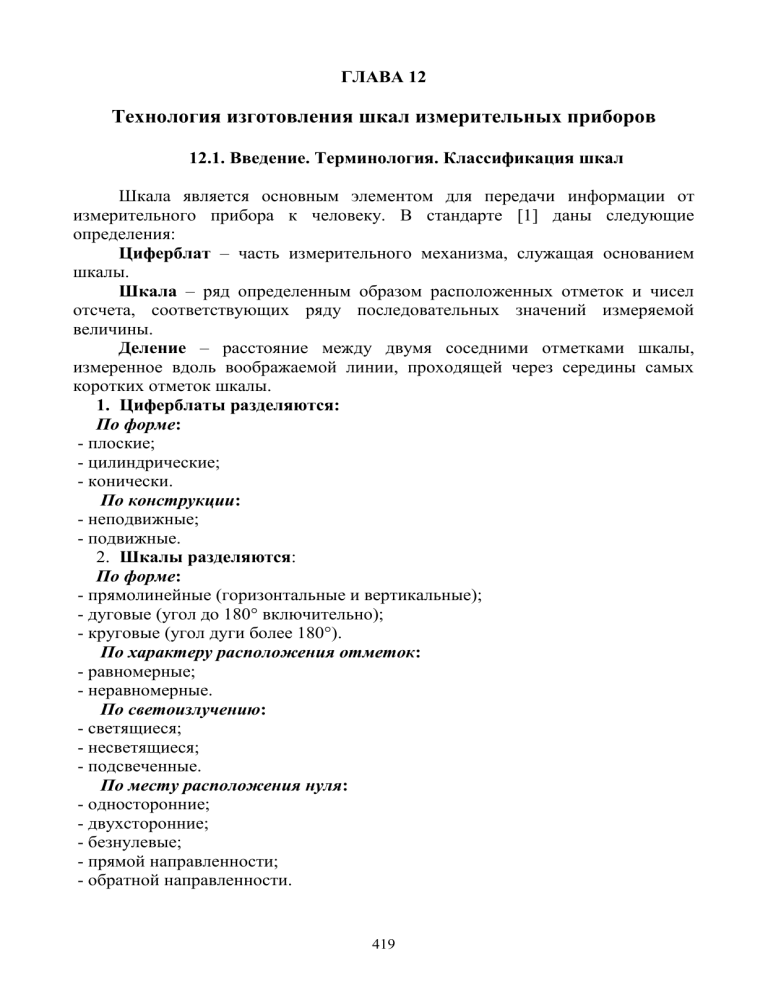 ГЛАВА 12 Технология изготовления шкал измерительных приборов 12.1. Введение. Терминология. Классификация шкал Шкала является основным элементом для передачи информации от измерительного прибора к человеку. В стандарте [1] даны следующие определения: Циферблат – часть измерительного механизма, служащая основанием шкалы. Шкала – ряд определенным образом расположенных отметок и чисел отсчета, соответствующих ряду последовательных значений измеряемой величины. Деление – расстояние между двумя соседними отметками шкалы, измеренное вдоль воображаемой линии, проходящей через середины самых коротких отметок шкалы. 1. Циферблаты разделяются: По форме: - плоские; - цилиндрические; - конически. По конструкции: - неподвижные; - подвижные. 2. Шкалы разделяются: По форме: - прямолинейные (горизонтальные и вертикальные); - дуговые (угол до 180° включительно); - круговые (угол дуги более 180°). По характеру расположения отметок: - равномерные; - неравномерные. По светоизлучению: - светящиеся; - несветящиеся; - подсвеченные. По месту расположения нуля: - односторонние; - двухсторонние; - безнулевые; - прямой направленности; - обратной направленности. 419 По количеству строк в одной шкале: - однострочные; - строчные; - многострочные. Шкалы прямой направленности – это шкалы с положением нулевой отметки слева или сверху от средней линии. Нулевая отметка на шкалах обратной направленности располагается справа или снизу от средней лини. Кроме того, шкалы по характеру зависимости можно разделить на равномерные – с пропорциональным или линейным характером зависимости а f x и неравномерные – с нелинейным характером зависимости а f x . Равномерная шкала имеет одинаковую цену деления, причем отношение наибольшей длины деления к наименьшей на всем протяжении у практически равномерной е превышает 1,3 [1]. Неравномерная шкала, как правило, имеет неодинаковую цену деления на всем протяжении. Технические требования, которые необходимо учитывать при проектировании шкал приведены в [1]. Цвет лицевой стороны циферблатов предпочтителен белый. Изготавливаются также циферблаты черного, желтовато-зеленовато-голубого цвета и других оттенков. Функциональные участки шкал, отдельные отметки или цифры при необходимости их выделения выполняются в виде штрихов или полос яркого цвета, причем красным цветом обозначается участок аварийного значения параметра, желтым – участок выхода параметра из нормы, зеленым – участок нормального значения параметра. Шкала по всей длине разделяется отметками А на ряд основных интервалов, основные интервалы делятся отметками В, С и Д на промежуточные интервалы (рис. 12.1). Интервал между соседними отметками образует деление шкалы. Для увеличения точности считывания рекомендуется проектировать шкалы с одинаковой шириной отметок А, В и С. Рис. 12.1 Шкала измерительного прибора 420 Для увеличения скорости считывания шкалы проектируют с отметками А, В и С различной ширины. Ширина наименьшей отметки должна быть не более ширины конца стрелки. Длина деления шкалы в миллиметрах для приборов с одинаковой ценой деления на всем протяжении шкалы определяется по формуле: l LK A , 100 (12.1) где L - длина шкалы в мм; K - класс точности; A - коэффициент, показывающий сколько раз расстояние по шкале, соответствующе пределу допускаемой основной погрешности, укладывается в одном 