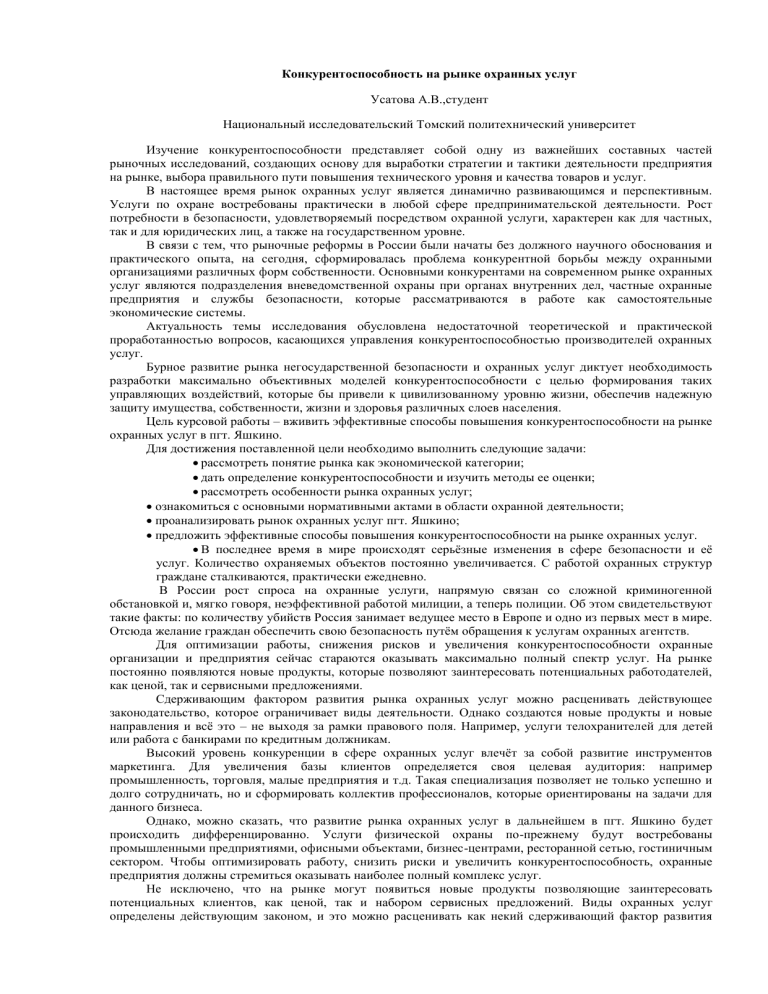Конкурентоспособность на рынке охранных услуг Усатова А.В.,студент Национальный исследовательский Томский политехнический университет Изучение конкурентоспособности представляет собой одну из важнейших составных частей рыночных исследований, создающих основу для выработки стратегии и тактики деятельности предприятия на рынке, выбора правильного пути повышения технического уровня и качества товаров и услуг. В настоящее время рынок охранных услуг является динамично развивающимся и перспективным. Услуги по охране востребованы практически в любой сфере предпринимательской деятельности. Рост потребности в безопасности, удовлетворяемый посредством охранной услуги, характерен как для частных, так и для юридических лиц, а также на государственном уровне. В связи с тем, что рыночные реформы в России были начаты без должного научного обоснования и практического опыта, на сегодня, сформировалась проблема конкурентной борьбы между охранными организациями различных форм собственности. Основными конкурентами на современном рынке охранных услуг являются подразделения вневедомственной охраны при органах внутренних дел, частные охранные предприятия и службы безопасности, которые рассматриваются в работе как самостоятельные экономические системы. Актуальность темы исследования обусловлена недостаточной теоретической и практической проработанностью вопросов, касающихся управления конкурентоспособностью производителей охранных услуг. Бурное развитие рынка негосударственной безопасности и охранных услуг диктует необходимость разработки максимально объективных моделей конкурентоспособности с целью формирования таких управляющих воздействий, которые бы привели к цивилизованному уровню жизни, обеспечив надежную защиту имущества, собственности, жизни и здоровья различных слоев населения. Цель курсовой работы – вживить эффективные способы повышения конкурентоспособности на рынке охранных услуг в пгт. Яшкино. Для достижения поставленной цели необходимо выполнить следующие задачи: рассмотреть понятие рынка как экономической категории; дать определение конкурентоспособности и изучить методы ее оценки; рассмотреть особенности рынка охранных услуг; ознакомиться с основными нормативными актами в области охранной деятельности; проанализировать рынок охранных услуг пгт. Яшкино; предложить эффективные способы повышения конкурентоспособности на рынке охранных услуг. В последнее время в мире происходят серьёзные изменения в сфере безопасности и её услуг. Количество охраняемых объектов постоянно увеличивается. С работой охранных структур граждане сталкиваются, практически ежедневно. В России рост спроса на охранные услуги, напрямую связан со сложной криминогенной обстановкой и, мягко говоря, неэффективной работой милиции, а теперь полиции. Об этом свидетельствуют такие факты: по количеству убийств Россия занимает ведущее место в Европе и одно из первых мест в мире. Отсюда желание граждан обеспечить свою безопасность путём обращения к услугам охранных агентств. Для оптимизации работы, снижения рисков и увеличения конкурентоспособности охранные организации и предприятия сейчас стараются оказывать максимально полный спектр услуг. На рынке постоянно появляются новые продукты, которые позволяют заи