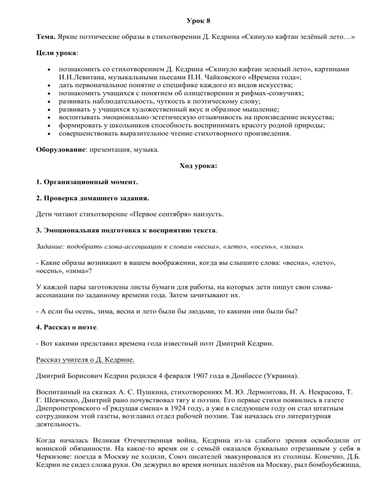 Д. Кедрин. «Скинуло кафтан зеленый лето...». План урока