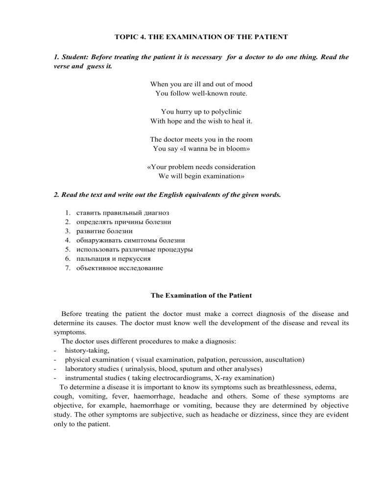 TOPIC 4. THE EXAMINATION OF THE PATIENT 1. Student: Before treating the patient it is necessary for a doctor to do one thing. Read the verse and guess it. When you are ill and out of mood You follow well-known route. You hurry up to polyclinic With hope and the wish to heal it. The doctor meets you in the room You say «I wanna be in bloom» «Your problem needs consideration We will begin examination» 2. Read the text and write out the English equivalents of the given words. 1. 2. 3. 4. 5. 6. 7. ставить правильный диагноз определять причины болезни развитие болезни обнаруживать симптомы болезни использовать различные процедуры пальпация и перкуссия объективное исследование The Examination of the Patient Before treating the patient the doctor must make a correct diagnosis of the disease and determine its causes. The doctor must know well the development of the disease and reveal its symptoms. The doctor uses different procedures to make a diagnosis: - history-taking, - physical examination ( visual examination, palpation, percussion, auscultation) - laboratory studies ( urinalysis, blood, sputum and other analyses) - instrumental studies ( taking electrocardiograms, X-ray examination) To determine a disease it is important to know its symptoms such as breathlessness, edema, cough, vomiting, fever, haemorrhage, headache and others. Some of these symptoms are objective, for example, haemorrhage or vomiting, because they are determined by objective study. The other symptoms are subjective, such as headache or dizziness, since they are evident only to the patient. 3. Write out all the doctor’s actions from the text “The Examination of the Patient” Example: make a diagnosis, … 4.Write out the names of the symptoms from the text “The Examination of the Patient”. Translate them into Russian. Symptoms: headache – головная боль, … 5. Answer the questions using the information from the text “The Examination of the Patient”. 1. 2. 3. 4. What is it necessary to do before treating the patient? What must the doctor know? What procedures does the doctor use? What groups of symptoms do you know? 6.Speak English 1.Скажите, что вы врач. Каждый день вы осматриваете и лечите пациентов. Вы определяете причину болезни и обнаруживаете симптомы. После этого вы ставите диагноз и начинаете лечение. 2.Вы – врач. Скажите, что вы используете различные процедуры, чтобы поставить диагноз. Вы собираете анамнез, проводите пальпацию и перкуссию. Вы обдумываете результаты лабораторных исследований. Когда у вас есть все данные, вы ставите диагноз. 3.Вы – студент медицинского колледжа. Скажите, что вы изучаете различные заболевания. Приведите примеры объективных и субъективных симптомов. 7. Speak about the examination of the patient 8. Put the sentences in the logical order and make up a story about the examination of Mr. Brown. Pay attention to the new words. 1. 2. 3. 4. 5. 6. 7. doctor’s consulting room – кабинет врача take the pulse – измерять пульс measure blood pressure – измерять давление prescribe medicines – выписывать лекарства acute bronchitis – острый бронхит mild form – лёгкая форма dry rales – сухие хрипы The nurse saw that the temperature was 38. The patient had to take medicines 3 times a day. Mr. Brown came to the doctor in the polyclinic. The doctor administered a bed regimen. A nurse asked him to take the temperature. They were normal. The man entered the doctor’s consulting room. The doctor began his examination – he took the pulse of the patient and measured his blood pressure. He prescribed some medicines and a cough mixture. The man was told to come in a week. He made a diagnosis of acute bronchitis in a mild form. The doctor listened to the lungs and revealed dry rales. 9.Answer the questions about your visit to a doctor. 1. 2. 3. 4. 5. 6. 7. 8. Do you often go to the doctor’s examination? Do you have an experienced doctor in the polyclinic? Does the doctor ask you about your complaints? Why does he do it? Why is it necessary to determine the cause of the disease? What does the doctor do during the examination? Do you follow a bed regimen? Do you take prescribed medicines? Do you thank your doctor for help? 10 .Translate into English 1. Во время осмотра врач слушает легкие. 2. У каждого терапевта есть свой кабинет. 3. У пациента сухие хрипы в легких. 4. Врач определил болезнь – бронхит в легкой форме. 5. Пациент жаловался на головную боль, и врач измерил его АД. 6. Врач наблюдает за развитием болезни. 7. Опытный врач лечит своих пациентов с вниманием и заботой. 8. Врач спортивной команды измерил пульс спортсмена. 9. Пациент жалуется на головокружение. 10. Врач осмотрел больного и обнаружил кровотечение. 11.Study the information below and role-play a dialogue between a doctor and his patient. 11.1.Study the new words 1. What’s the matter with you? – Что с вами?
