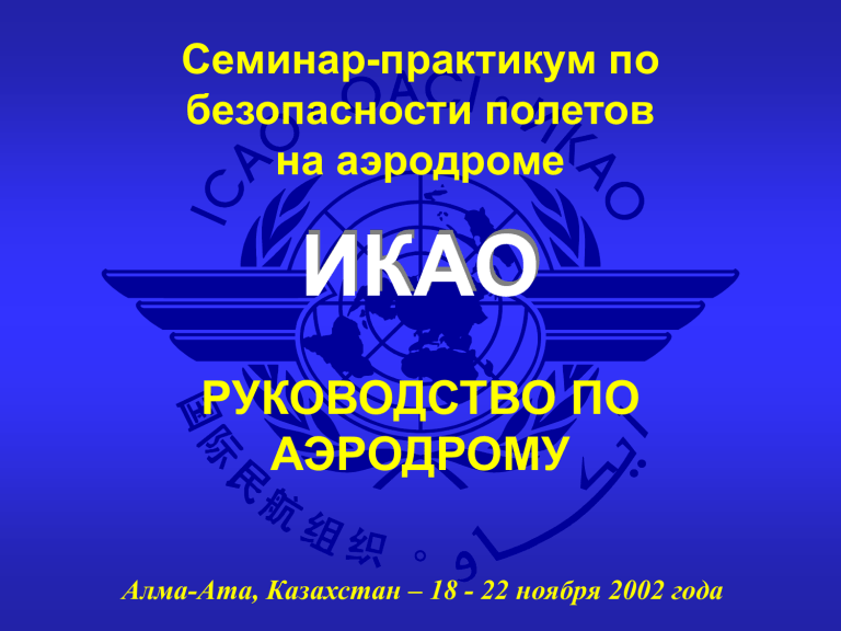 Семинар-практикум по безопасности полетов на аэродроме ИКАО РУКОВОДСТВО ПО АЭРОДРОМУ Алма-Ата, Казахстан – 18 - 22 ноября 2002 года Общий обзор ВВЕДЕНИЕ ЦЕЛИ РУКОВОДСТВА СТРУКТУРА РУКОВОДСТВА И ЕГО СОДЕРЖАНИЕ С ЧЕГО НАЧАТЬ РАБОТУ НАД РУКОВОДСТВОМ? РУКОВОДСТВО ПО АЭРОДРОМУ – «ЖИВОЙ ДОКУМЕНТ» ДЕЙСТВИЯ ВГА, СВЯЗАННЫЕ С РУКОВОДСТВОМ ПО АЭРОДРОМУ ПОДВЕДЕНИЕ ИТОГОВ Семинар по безопасности на аэродромах – Алма-Ата, Казахстан, 18 – 22 ноября 2002 года 2 ВВЕДЕНИЕ Руководство по аэродрому – это документ аэродрома, эквивалентный руководству по производству полетов, используемому авиакомпаниями Семинар по безопасности на аэродромах – Алма-Ата, Казахстан, 18 – 22 ноября 2002 года 3 ЦЕЛИ РУКОВОДСТВА (1) Наличие руководства по аэродрому является основополагающим условием процесса сертификации В нем содержатся все необходимые сведения, касающиеся местонахождения аэродрома, его средств, служб, оборудования, эксплуатационных процедур, организации и управления, включая систему обеспечения безопасности Семинар по безопасности на аэродромах – Алма-Ата, Казахстан, 18 – 22 ноября 2002 года 4 ЦЕЛИ РУКОВОДСТВА (2) Сведения, представленные в руководстве по аэродрому, должны наглядно показывать, что данный аэродром соответствует стандартам и практике сертификации при отсутствии явных недостатков, которые могут отрицательно сказаться на безопасности полетов воздушных судов Такое руководство представляет собой справочный документ, в котором содержится контрольный перечень подлежащих соблюдению стандартов по сертификации аэродромов и оговаривается уровень обслуживания в контролируемой зоне аэродрома Семинар по безопасности на аэродромах – Алма-Ата, Казахстан, 18 – 22 ноября 2002 года 5 ЦЕЛИ РУКОВОДСТВА (3) Сведения, представленные в руководстве по аэродрому, дадут возможность ВГА оценить пригодность аэродрома для предполагаемых полетов воздушных судов и сделать вывод относительно способности заявителя быть владельцем сертификационного документа аэродрома Это руководство представляет собой основной справочник по проведению на месте инспекционных проверок, связанных с выдачей сертификационного документа аэродрома и последующих проверок состояния безопасности Семинар по безопасности на аэродромах – Алма-Ата, Казахстан, 18 – 22 ноября 2002 года 6 ЦЕЛИ РУКОВОДСТВА (4) Руководство представляет собой справочный документ, согласованный между эксплуатантом аэродрома и ВГА и касающийся стандартов, условий и уровня обслуживания, которые должны обеспечиваться на аэродроме Семинар по безопасности на аэродромах – Алма-Ата, Казахстан, 18 – 22 ноября 2002 года 7 ЦЕЛИ РУКОВОДСТВА (5) В нем содержатся все инструкции, информация и указания, необходимые для того, чтобы дирекция аэродрома и эксплуатационный персонал могли выполнять свои обязанности в соответствии с национальными правилами и требованиями самого аэродрома Руководство по аэродрому - это документ, которым аэродромы пользуются для того, чтобы продемонстрировать ведомству гражданской авиации, что эксплуатация аэродрома планируется в соответствии с национальными правилами. Исходя из этого, ВГА оценивает руководство, и такая оценка является одним из критериев, на основании которого ведомство выдает данному аэродрому сертификационный документ Семинар по безопасности на аэродромах – Алма-Ата, Казахст