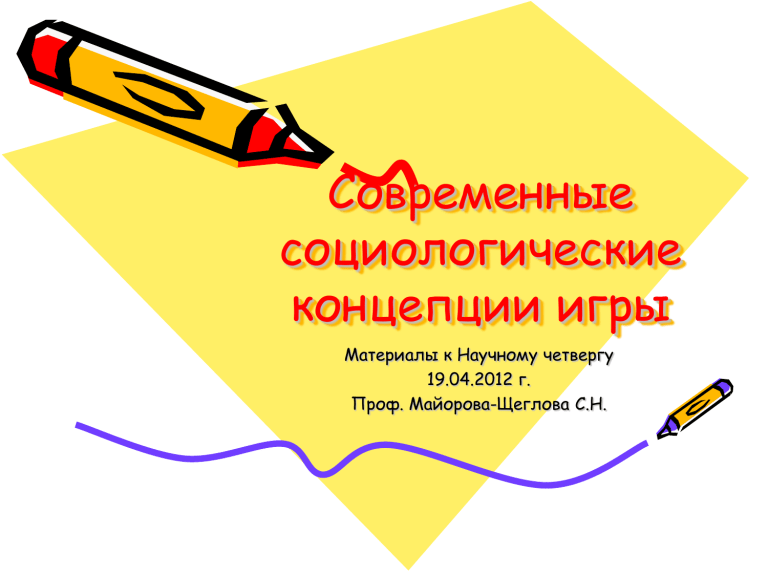 Современные социологические концепции игры Материалы к Научному четвергу 19.04.2012 г. Проф. Майорова-Щеглова С.Н. американский социолог Дж. Мид, основоположник символического интеракционизма • Рассматривает игру как главный фактор первичной социализации. • Соответственно, он выделяет начальную стадию в развитии личности индивида, обозначенную им как стадия игры, на которой ребенок играет чужие роли (учитель, доктор, продавец), и соревновательную стадию, предполагающую адекватное исполнение ребенком своей собственной роли, а главное - развитие социальной способности оценивать себя глазами других. В итоге благодаря игре индивид начинает жить в одном мире с другими людьми. Классическое осмысление форм игры в социальной жизни Г. Зиммеля • Предложил концепцию общительности, в которой подчеркнул зависимость игры от лиц, между которыми она происходит, обеспечение расслабления, отвлечения с одной стороны и извлечение пользы путем распространения обаяния с другой. Э. Берн • Люди включаются в игровую деятельность по трем основным причинам. 1. «Сенсорный голод»: «Что бы ни говорили о стремлении человека избегать напряженных ситуаций, большинство живых организмов, включая человека, желает и ищет их». 2. Желание быть признанным, замеченным, что может быть достигнуто только с помощью других людей. 3. «Структурный голод», под которым он понимал стремление людей объединиться в организации. Тех, кто умеет структурировать свое время и деятельность, общество считает положительными, и наличие подобного опыта в будущем может привести к тому, что это будут наиболее востребованные и высокооплачиваемые члены. И. Хейзинги • Социальные игры (зрелища, музыка, маскарады, турниры) присущи только человеку. Игра олицетворяют собой свободную деятельность человека. Они не могут осуществляться «по принуждению». Игре свойственна страсть, то, что Хейзинга назвал «напряжением». Новая социологическая парадигма играизации российского общества С.А. Кравченко • 1) внедрение принципов игры, эвристических элементов в прагматические жизненные стратегии, что позволяет индивидам посредством саморефлексии достаточно эффективно выполнять основные социальные роли, адаптироваться к «обществу в действии», • 2) новую, формирующуюся парадигму рациональности, характерную для современных условий неопределенности, распространения институциональных рисков; • 3) фактор конструирования и поддержания виртуальной реальности неравновесного типа. Отличия • Игра – для детей • Играизация как процесс, деятельность– для всех возрастов Основные понятия концепции играизации • Игровая симуляция деятельности • Симулякр Политическая активность политический активизм – Виртуальное общение с властью симулякр Президента Функции игры в современном обществе • вид деятельности, связанной с престижем, повышением статуса; • вхождение в новую роль; • эффект интерактивности, неожиданности, азарт ожидания непредвиденных ситуаций; принятие решений в условиях неопределенности; • использование нормативных правил в диапазоне своего понимания; • демонстрация своих возможностей; • преодоление сопротивления, приобретение роли победителя; • оперативное выявление последствий принятых решений; • контакты с партнерами.