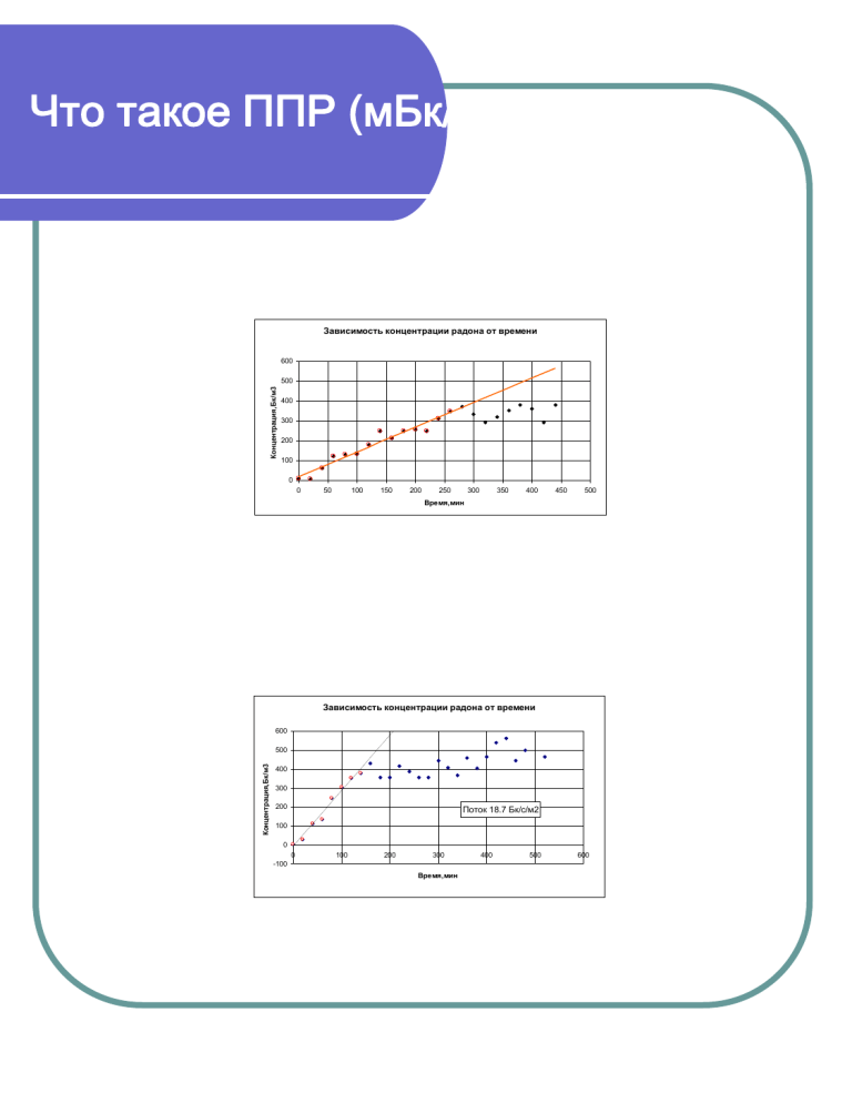 Что такое ППР (мБк/м2·c-1)? Зависимость концентрации радона от времени 600 Концентрация,Бк/м3 500 400 300 200 100 0 0 50 100 150 200 250 300 350 400 450 500 Время,мин Зависимость концентрации радона от времени 600 Концентрация,Бк/м3 500 400 300 200 Поток 18.7 Бк/с/м2 100 0 0 100 200 300 -100 Время,мин 400 500 600 Измерение ППР Для измерений используются электретные детекторы и СИ на основе электростатического осаждения ДПР радона на ППД Интеркалибровка, Прага (Седлек), 16 сентября 1996 При измерении необходимо учитывать: место (градиент в помещении, геологические данные, топографические данные) вариабильность во времени (сезон, погодные условия, утро-вечер, лунные циклы) Международный опыт Прогноз ОА радона в здании Чешский опыт ППР или концентрация? Предлагается использовать произведение концентрации радона в почве и проницаемости почвы. Должны учитываться такие характеристики почвы: концентрация Ra, Rn, коэффициент эманации, пористость, проницаемость, распределение зерен по размеру. Для поверхности с крупнозернистой структурой метод измерения потока является единственно подходящим При отсутствии барьера 16 мБк/м2с-1 соответствует 60 Бк/м3 в здании при вентиляции помещения 0,3 час-1 Международный опыт Вительстоун (Австралия). Экономический подход к измерениям Среди существующих зданий в Австралии только в незначительном числе зданий обнаружены опасные концентрации радона, поэтому неэкономично проводить измерения во всех зданиях. Предполагается проводить узкопрофильный радиометрический мониторинг: - излучение на 100 м, - излучение Bi-214 (оценка концентрации Ra). При 25 % влажности вода осаждается на поверхности зерен и не блокирует поры. Работает механизм прямой отдачи: 65 мкм в воздухе и 100 нм в воде. Международный опыт Энтони Неро (США) Стратегия радонового мониторинга Лаборатория Лоуренса Беркли в рамках программы по мониторингу разработали статистически обоснованный подход к классификации штатов. Проектирование «радоновых потенциалов» стало основным направлением. Поверхностные концентрации Ra аналогичны при 60% дисперсии ГС экспрессным значениям. Невозможно корректно обработать экспериментальный материал при малой статистике концентрации Ra. Международный опыт Б.-М.Ек (Швеция). Влияние процессов замораживания и таяния на содержание Rn в почве. Неплотный слой снега не помеха для высвобождения Rn. Если толщина замерзшего слоя велика, таяние почвы продолжается до июня-июля. при измерениях необходимо учитывать процесс задержки, а не просто лето-зима. При замерзании почвы диффузия Rn усиливается. Корреляции измерений в подвале и помещении. Лунные циклы Изменение ОА радона с глубиной и влажностью почвы Отсутствие влияния замерзания на ОА радона в почве Международный опыт Eнc Вегад (Германия) В течение 2 лет обследовано 10 холмов. На вершине скорость выхода радона больше, чем концентрация радона в почве. В других местах значения между потоком и концентрацией коррелируют. На склонах крупнозернистая почва Rn . Вывод: концентрация радона максимальна в нижних частях холма, которые заселены. Необходимо избегать выпуклых прогибов. Методика для почвенного радона: в почве шприцом с глубины 0,8м отбирают пробу в камеру Лукаса и ожидают 3,5 часа до наступления равновесия радона и RaC’. Методика для ППР: диаметр 25 см, h=14,4 см на 2 см. Пробы отбирались через 20 мин. Влажность определяли при помощи весового анали