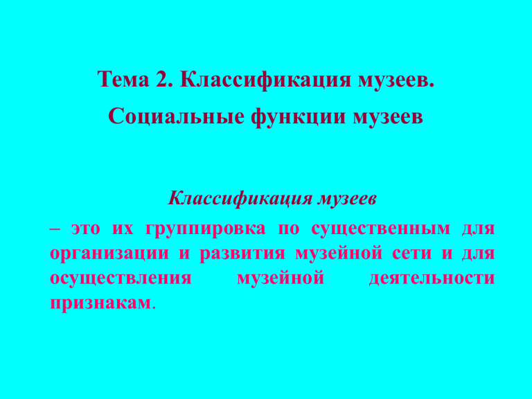Тема 2. Классификация музеев. Социальные функции музеев Классификация музеев – это их группировка по существенным для организации и развития музейной сети и для осуществления музейной деятельности признакам. Современное музееведение знает несколько систем классификации музеев: по масштабам деятельности ; по форме собственности; по административно-территориальному признаку ; по признаку осуществления научнодокументационной функции; по типу; по профилю. Классификации музеев 1. по масштабам деятельности музеи центральные, региональные, местные 2. по форме собственности государственные, ведомственные, общественные, частные 3. по административно-территориальному признаку республиканские, краевые, областные, городские, районные и т.п. 4. по признаку осуществления научнодокументационной функции музеи коллекционные, музеи ансамблевые Классификация по типам Тип музея – категория в классификации музеев по выполнению этими учреждениями социальных функций и приоритета этих функций в деятельности музея. В соответствии с этой классификацией музеи делят на: исследовательские, учебные, просветительские. Классификация музеев по профилю. Профиль музея – отношение музея к профильной дисциплине, комплексу наук, виду искусства, отрасли культуры или производства. Может также включать территориальные, хронологические границы, в рамках которых музей документирует социальные феномены. Классификация музеев по профилю 1. Исторические музеи: а) общеисторические (вся история человечества); б) национальной истории (история отдельных стран); в) региональной истории (история отдельных регионов); г) истории отдельных периодов или исторических событий, феноменов (историко-революционные, истории декабризма, истории религии или атеизма и т.п.); д) узкоспециализированные музеи (археологические, этнографические, нумизматические, военно-исторические и т.д.). Классификация музеев по профилю (продолжение) 2. Музеи отдельных отраслей культуры (в узком смысле слова): а) художественные музеи; б) литературные музеи; в) музыкальные музеи; г) театральные музеи; д) музеи физкультуры и спорта Классификация музеев по профилю (продолжение) 3. Педагогические музеи ; 4. Естественнонаучные музеи; 5. Промышленные музеи: а) музеи торговли, промышленности и ремесел; б) музеи техники (музеи отдельных отраслей); в) музеи отдельных предприятий; 6. Сельскохозяйственные музеи; 7. Комплексные. Комплексные музеи – музеи, собрания которых документируют социально значимые феномены, относящиеся к разным профильным дисциплинам. В их коллекциях представлены источники всех видов по различным отраслям знания. Деятельность музея может быть представлена комплексом как гуманитарных и естественнонаучных (как в краеведческих музеях), так и только гуманитарных (историкохудожественные, литературно-художественные и т.п. музеи), или только естественнонаучных дисциплин (музеи науки и техники, политехнические музеи и т.п.). Наиболее распространенный в РФ вид комплексного музея – краеведческий. Социальные функции музеев: 1. Научно-документационная; 2. Охранная; 3. Научно-исследовательская; 4. Образовательная (или образовательно-воспитательная, или культурно-просветительная); 5. Рекреационная; 1. Научно-документационная функция связана с реализацией музеем процессов документирования явлений, п