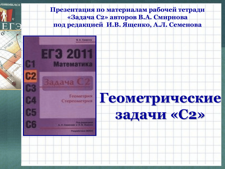 Презентация по материалам рабочей тетради «Задача С2» авторов В.А. Смирнова под редакцией И.В. Ященко, А.Л. Семенова Геометрические задачи «С2» Тренировочная работа №2 Расстояние от точки до плоскости Повторение: А М Н Расстояние от точки до плоскости, не содержащей эту точку, есть длина перпендикуляра, проведенного из этой точки на данную плоскость. Повторение: Если прямая параллельна плоскости, то все точки прямой равноудалены от этой плоскости. a Расстояние от произвольной точки прямой до плоскости называется расстоянием между прямой и параллельной ей плоскостью. a II Повторение: Если две плоскости параллельны, то все точки одной плоскости равноудалены от другой плоскости. II Расстояние от произвольной точки одной из параллельных плоскостей до другой плоскости называется расстоянием между параллельными плоскостями. Повторение: Расстояние от точки М до плоскости : 1) Равно расстоянию до плоскости от произвольной точки Р, лежащей на прямой а, которая проходит ч/з точку М и параллельна плоскости ; 2) Равно расстоянию до плоскости от произвольной точки Р, лежащей на плоскости , которая проходит ч/з точку М и параллельна плоскости ; 3) Находится с помощью координатно – векторного метода; Устно: Найдите расстояние от вершины куба до плоскости любой грани, в которой не лежит эта вершина, если ребро куба равно 5 D1 А1 С1 Подсказка В1 Н D А А С В Расстояние от точки до плоскости – длина перпендикуляра Устно: Дан прямоугольный параллелепипед ABCДA1B1C1Д1, найдите расстояние между прямой А1С1 и плоскостью АВС . D1 С1 Подсказка А1 В1 a d С D А n a II В Расстояние от произвольной точки прямой до плоскости называется расстоянием между прямой и параллельной ей плоскостью Устно: Дан прямоугольный параллелепипед ABCДA1B1C1Д1, найдите расстояние между прямой ДД1 и плоскостью АСС1 . D1 С1 Подсказка А1 В1 a d С D А n a II В Расстояние от произвольной точки прямой до плоскости называется расстоянием между прямой и параллельной ей плоскостью Устно: Дан прямоугольный параллелепипед ABCДA1B1C1Д1, найдите расстояние между плоскостями АВВ1 иДСС1. D1 С1 А1 Подсказка В1 d D II С n А В Расстояние от произвольной точки одной из параллельных плоскостей до другой плоскости называется расстоянием между параллельными плоскостями. В единичном кубе АВСДА1В1С1Д1 найдите расстояние от точки А до плоскости ВДА1. №1 1) Построим плоскость AА1С1С С1 перпендикулярную плоскости ДВА1. D1 А1 В1 1 М D 1 А ВД ДВА1 ВД АС ДВА1 АА 1С1С ВД АА 1 2 2 С О 1 В проведем из точки А перпендикуляр. АМ – искомое расстояние. 2) Найдем искомое расстояние через вычисление площади треугольника AА1О. Ответ: 3 3 Критерии оценивания выполнения задания С2 баллы Критерии оценивания 2 Правильный ход решения. Приведена верная последовательность всех шагов решения: 1) верно построен отрезок, длина которого является искомым расстоянием; 2) найдена длина построенного отрезка. Все построения и вычисления выполнены верно. Получен верный ответ. 1 Правильно построен чертеж, указан отрезок, длина которого является искомым расстоянием. При нахождении длины отрезка допущены вычислительная ошибка и/или описка. В результате этой ошибки или описки может быть получен неверный ответ. 0 1) Ход решения правильный, но оно не доведено до конца, или решение отсутствует. Нет ответа 2) Ход решения правильный, но имеются существенные ошибки в вычислениях, приведшие к неправильному 