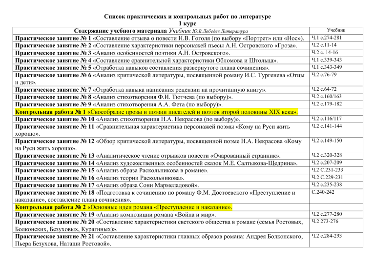Список практических и контрольных работ по литературе 1 курс Содержание учебного материала Учебник Ю.В.Лебедев Литература Практическое занятие № 1 «Составление отзыва о повести Н.В. Гоголя (по выбору «Портрет» или «Нос»). Практическое занятие № 2 «Составление характеристики персонажей пьесы А.Н. Островского «Гроза». Практическое занятие № 3 «Анализ особенностей поэтики А.Н. Островского». Практическое занятие № 4 «Составление сравнительной характеристики Обломова и Штольца». Практическое занятие № 5 «Отработка навыков составления развернутого плана сочинения». Практическое занятие № 6 «Анализ критической литературы, посвященной роману И.С. Тургенева «Отцы и дети». Практическое занятие № 7 «Отработка навыка написания рецензии на прочитанную книгу». Практическое занятие № 8 «Анализ стихотворения Ф.И. Тютчева (по выбору)». Практическое занятие № 9 «Анализ стихотворения А.А. Фета (по выбору)». Контрольная работа № 1 «Своеобразие прозы и поэзии писателей и поэтов второй половины XIX века». Практическое занятие № 10 «Анализ стихотворения Н.А. Некрасова (по выбору)». Практическое занятие № 11 «Сравнительная характеристика персонажей поэмы «Кому на Руси жить хорошо». Практическое занятие № 12 «Обзор критической литературы, посвященной поэме Н.А. Некрасова «Кому на Руси жить хорошо». Практическое занятие № 13 «Аналитическое чтение отрывков повести «Очарованный странник». Практическое занятие № 14 «Анализ художественных особенностей сказок М.Е. Салтыкова-Щедрина». Практическое занятие № 15 «Анализ образа Раскольникова в романе». Практическое занятие № 16 «Анализ теории Раскольникова». Практическое занятие № 17 «Анализ образа Сони Мармеладовой». Практическое занятие № 18 «Подготовка к сочинению по роману Ф.М. Достоевского «Преступление и наказание», составление плана сочинения». Контрольная работа № 2 «Основные идеи романа «Преступление и наказание». Практическое занятие № 19 «Анализ композиции романа «Война и мир». Практическое занятие № 20 «Составление характеристики светского общества в романе (семья Ростовых, Болконских, Безуховых, Курагиных)». Практическое занятие № 21 «Составление характеристики главных образов романа: Андрея Болконского, Пьера Безухова, Наташи Ростовой». Учебник Ч.1 с.274-281 Ч.2 с.11-14 Ч.2 с. 14-16 Ч.1 с.339-343 Ч.1 с.343-349 Ч.2 с.76-79 Ч.2 с.64-72 Ч.2 с.160/163 Ч.2 с.179-182 Ч.2 с.116/117 Ч.2 с.141-144 Ч.2 с.149-150 Ч.2 с.320-328 Ч.2 с.207-209 Ч.2 С.231-233 Ч.2 С.229-231 Ч.2 с.235-238 С.240-242 Ч.2 с.277-280 Ч.2 273-276 Ч.2 с.284-293 Практическое занятие № 22 «Подготовка к сочинению, разработка плана и структуры сочинения по роману Л.Н. Толстого «Война и мир». Практическое занятие № 23 «Написание сочинения по роману Л.Н. Толстого «Война и мир». Контрольная работа № 3 «Художественный мир Л.Н. Толстого». Практическое занятие № 24 «Аналитическое чтение «Маленькой трилогии А.П. Чехова». Практическое занятие № 25 «Анализ рассказа «Ионыч». Практическое занятие № 26 «Характеристика персонажей пьесы «Вишневый сад». Практическое занятие № 27 «Отработка навыка написания рецензии на прочитанное произведение». Ч.2 с.293-297 Ч.2 с.280-284 Ч.2 с.352-355 Ч.2 с.355-357 Ч.2 с.368-375 Ч.2 с.349-352