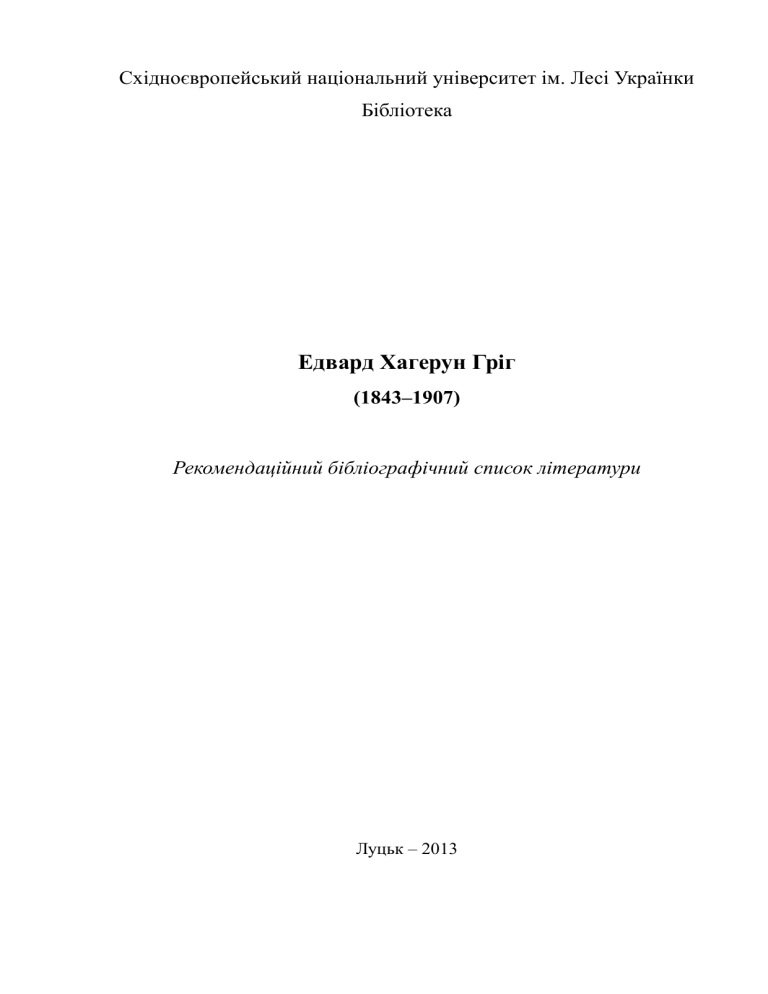 Східноєвропейський національний університет ім. Лесі Українки Бібліотека Едвард Хагерун Гріг (1843–1907) Рекомендаційний бібліографічний список літератури Луцьк – 2013 1. Асафьев Б. Григ / Б. Асафьев .– Изд. 4-е. – Л. : Музыка, 1986. – 36 с. 2. Бас Л. Мелодії мерця : [про творчість Е. Гріга] // Розповіді про композиторів / Л. Бас. – К., 1980. – С. 33–56. 3. Безклубенко С. Д. Мистецтво: терміни і поняття. У 2 т. Т. 1 : А-Л : енциклопед. вид. / С. Д. Безклубенко. – К. : Ін-т культурології АМУ, 2008. – 240 с. 4. Бенестад Ф. Эдвард Григ человек и художник : пер. с норв. / Ф. Бенестад, Д. Шельдеруп-Эббе. – М. : Радуга, 1986. – 376 с. 5. Блок В. Об Эдварде Григе и не только о нем / В. Блок // Музыкальная академия. – М., 1994. – № 4. 6. Булучевский Ю. С. Краткий музыкальный словарь для учащихся / Ю. С. Булучевский, В. С. Фомин. – Изд. 10-е. – Л. : Музыка, 1990. – 342 с. 7. Власов В. Эдвард Григ / В. Власов // Музыкальная жизнь. – 1968. – № 11. 8. Е. Гріг (1843–1907) // Муз. шк. – 2012. – № 10. – С. 23–28. 9. Едвард Хагерун Гріг (1843–1907) // Дит. садок. – 2011. – Серп. (Чис. 30/31). – С. 25. 10.Григ Эдвард // Творческие портреты композиторов : попул. справ. / ред. О. Гусева. – М., 1989. – С. 129–132. 11.Григ Эдвард // Современный словарь-справочник по искусству / науч. ред. и сост. А. А. Мелик-Пашаев. – М., 2000. – С. 172. 12.Григ Э. Девушке с гор: Цикл песен [ноты] / Э. Григ. – М. : Музыка, 1960. – 17 с. 13.Григ Э. Заход солнца: Цикл песен [ноты] / Э. Григ. – М. : Музыка, 1960. – 20 с. 14.Григ Э. Избранные лирические пьесы [ноты] / Э. Григ. – М. : Сов. композитор, 2007. – 48 с. 15.Григ Э. Концерт (ля-минор) для фортепиано с оркестром / Э. Григ. – СПб. : Композитор, 2006. – 51 с. 16.Григ Э. Листок из альбома / Э. Григ. – К. : Муз. Украина, 1971. – 48 с. 17.Григ Э. Норвежский танец / Э Григ. – М. : Музгиз, 1963. – 15 с. 18.Григ Э. Пер Гюнт: Две сонаты для фортепиано / Э. Григ. – СПб. : Композитор, 2007. – 47 с. 19.Гриндэ Н. История норвежской музыки : пер. с норвеж. / Н. Гриндэ. – Л. : Музыка, 1982. – 188 с. 20.Гуревич Е. Л. Норвежская музыка и творчество Эдварда Грига // История зарубежной музыки : популяр. лекции : для студентов высш. и средних пед. учеб. заведений / Е. Л. Гуревич. – 2-е изд., стер. – М. : Академия, 2000. – С. 256–268. 21.Друскин М. С. Григ и норвежская культура // Зарубежная музыкальная культура второй половины XIX века / М. С. Друскин. – М., 1964. 22.Друскін М. Історія зарубіжної музики / М. Друскін. – М. : Музика, 1967. – 69 c. 23.Кашкадамова Н. Б. Історія фортеп’янного мистецтва 19 сторіччя : підручник / Н. Б. Кашкадамова. – Т. : АСТОН, 2006. – 386 с. 24.Коган Г. У врат мастерства. Робота пианиста / Г. Коган. – М. : Сов. Композитор, 1958. – 114 с. 25.Кремлев Ю. А. Едвард Григ / Ю. А. Кремлев. – М. : Музгиз, 1958. – 237 с. 26.Левашева О. Едвард Григ / О. Левашева. – Изд. 2-е. – М. : Музыка, 1975. – 408 с. 27.Либерман Е. Робота над фортепианной техникой / Е. Либерман. – М. : Классика -ХХІ, 2003. – 165 с. 28.Михеева Л. В. Музыкальный словарь в рассказах / Л. В. Михеева. – М. : Сов. композитор, 1984. – 168 с. 29.Мохов Н. «Вечно молодой побег на древе романтизма» : [беседы об Э. Григе] / Н. Мохов // Муз. жизнь. – 1990. – № 7. – С. 19–20. 30.Музыкальная энциклопедия. Т. 2 : ГОНДОЛЬЕРА-КОРСОВ / гл. ред. Ю. В. Келдыш. – М. : Сов. энцикл. : Сов. композитор, 1974. – 958 с. 31.Музыкальный энциклопедический словарь / редкол.: Г. В. Келдыш [и др.]. – М. : Сов. энцикл., 1990. – 672 с. 32.Музыканты мира : библиогр. слов. / сост.: М. В. Есипова, О. В. Фраёнова. – М. : Науч. изд-во "Большая Рос. энцикл.", 2001. – 518 с. 33.Нейгауз Г. Об искустве фортепианной игры: Записки педагога / Г. Нейгауз. – М. : Музыка 1988. – 240 с. 34.Николаев А. Очерки по 