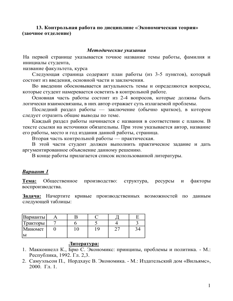 13. Контрольная работа по дисциплине «Экономическая теория» (заочное отделение) Методические указания На первой странице указывается точное название темы работы, фамилия и инициалы студента, название факультета, курса Следующая страница содержит план работы (из 3-5 пунктов), который состоит из введения, основной части и заключения. Во введении обосновывается актуальность темы и определяются вопросы, которые студент намеревается осветить в контрольной работе. Основная часть работы состоит из 2-4 вопросов, которые должны быть логически взаимосвязаны, в них автор отражает суть излагаемой проблемы. Последний раздел работы — заключение (обычно краткое), в котором следует отразить общие выводы по теме. Каждый раздел работы начинается с названия в соответствии с планом. В тексте ссылки на источники обязательны. При этом указывается автор, название его работы, место и год издания данной работы, страница. Вторая часть контрольной работы — практическая. В этой части студент должен выполнить практическое задание и дать аргументированное объяснение данному решению. В конце работы прилагается список использованной литературы. Вариант 1 Тема: Общественное воспроизводства. производство: структура, ресурсы и факторы Задача: Начертите кривые производственных возможностей по данным следующей таблицы: Варианты Тракторы Миномет ы А 7 0 В 6 10 С 5 19 Д 4 27 Е 3 34 Литература: 1. Макконнелл К., Брю С. Экономикс: принципы, проблемы и политика. - М.: Республика, 1992. Гл. 2,3. 2. Самуэльсон П., Нордхаус В. Экономика. - М.: Издательский дом «Вильямс», 2000. Гл. 1. 1 3. Экономика: Учебник / Под ред. А. С. Булатова. – М.: Юристъ, 2001. Гл. 1,2,3. 4. Экономическая теория: Учеб. для студ. высш. учеб. заведений / Под ред. В.Д. Камаева. – 6-е изд., перераб. и доп. – М.: Гуманит. изд. центр ВЛАДОС, 2000. Гл. 2,3. 5. Экономическая теория. Учебник. / Под ред. Николаевой И.П. - М.: Проспект, 1998. 6. Курс экономической теории. Учебник. / Под ред. Чепурина М.Н. и Киселевой Е.А. Киров, 2003, гл. 3, 4. Вариант 2 Тема: Экономическая система: понятие, типы, модели. Задача. При цене билета на стадион 5 ден. ед. его посетило 40 тысяч болельщиков футбола. Когда цена билета поднялась до 10 ден .ед., число болельщиков сократилось до 10 тысяч человек. Если считать функцию спроса на билеты линейной, то сколько болельщиков придут на стадион при цене билета 4 ден. ед.? Литература 1. Макконнелл К., Брю С. Экономикс: принципы, проблемы и политика. - М.: Республика, 1992. Гл. 2,3. 2. Самуэльсон П., Нордхаус В. Экономика. - М.: Издательский дом «Вильямс», 2000. Гл. 1. 3. Экономика: Учебник / Под ред. А. С. Булатова. – М.: Юристъ, 2001. Гл. 1,2,3. 4. Экономическая теория: Учеб. для студ. высш. учеб. заведений / Под ред. В.Д. Камаева. – 6-е изд., перераб. и доп. – М.: Гуманит. изд. центр ВЛАДОС, 2000. Гл. 2,3. 5. Экономическая теория. Учебник. / Под ред. Николаевой И.П. - М.: Проспект, 1998. 6. Курс экономической теории. Учебник. / Под ред. Чепурина М.Н. и Киселевой Е.А. Киров, 2003, гл. 3, 4. Вариант 3 Тема: Общая характеристика рыночной экономики 2 Задача. Внутренний спрос на товар в стране описывается функцией Q = 1000 50 Р, а внешний спрос (экспорт) - функцией Q = 2500 -250 Р, где Р - цена за единицу товара в ден.ед. Определите, сколько единиц товара будет продано, если цена на товар установится на уровне 11 ден.ед.? Литература 1. Макконнелл К., Брю С. Экономикс: принципы, проблемы и политика. - М.: Республика, 1992. Гл. 2,3,5. 2. Самуэльсон П., Нордхаус В. Эк