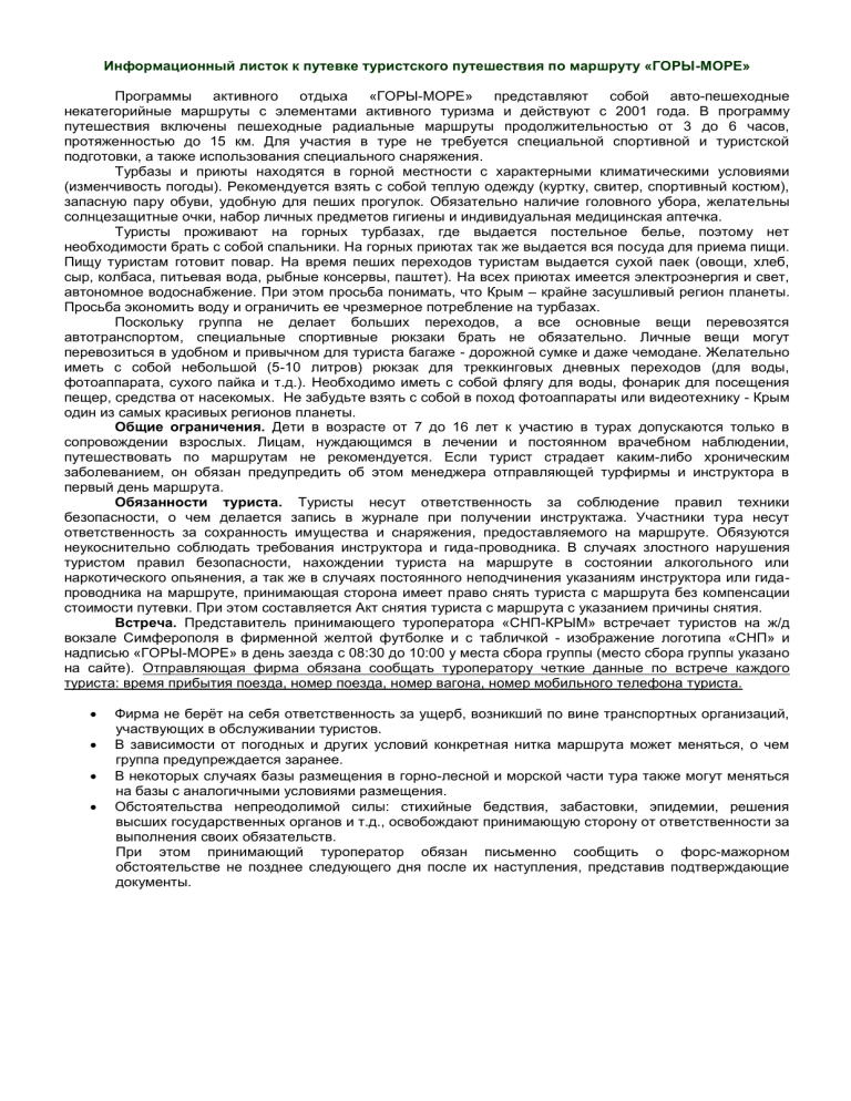 Информационный листок к путевке туристского путешествия по маршруту «ГОРЫ-МОРЕ» Программы активного отдыха «ГОРЫ-МОРЕ» представляют собой авто-пешеходные некатегорийные маршруты с элементами активного туризма и действуют с 2001 года. В программу путешествия включены пешеходные радиальные маршруты продолжительностью от 3 до 6 часов, протяженностью до 15 км. Для участия в туре не требуется специальной спортивной и туристской подготовки, а также использования специального снаряжения. Турбазы и приюты находятся в горной местности с характерными климатическими условиями (изменчивость погоды). Рекомендуется взять с собой теплую одежду (куртку, свитер, спортивный костюм), запасную пару обуви, удобную для пеших прогулок. Обязательно наличие головного убора, желательны солнцезащитные очки, набор личных предметов гигиены и индивидуальная медицинская аптечка. Туристы проживают на горных турбазах, где выдается постельное белье, поэтому нет необходимости брать с собой спальники. На горных приютах так же выдается вся посуда для приема пищи. Пищу туристам готовит повар. На время пеших переходов туристам выдается сухой паек (овощи, хлеб, сыр, колбаса, питьевая вода, рыбные консервы, паштет). На всех приютах имеется электроэнергия и свет, автономное водоснабжение. При этом просьба понимать, что Крым – крайне засушливый регион планеты. Просьба экономить воду и ограничить ее чрезмерное потребление на турбазах. Поскольку группа не делает больших переходов, а все основные вещи перевозятся автотранспортом, специальные спортивные рюкзаки брать не обязательно. Личные вещи могут перевозиться в удобном и привычном для туриста багаже - дорожной сумке и даже чемодане. Желательно иметь с собой небольшой (5-10 литров) рюкзак для треккинговых дневных переходов (для воды, фотоаппарата, сухого пайка и т.д.). Необходимо иметь с собой флягу для воды, фонарик для посещения пещер, средства от насекомых. Не забудьте взять с собой в поход фотоаппараты или видеотехнику - Крым один из самых красивых регионов планеты. Общие ограничения. Дети в возрасте от 7 до 16 лет к участию в турах допускаются только в сопровождении взрослых. Лицам, нуждающимся в лечении и постоянном врачебном наблюдении, путешествовать по маршрутам не рекомендуется. Если турист страдает каким-либо хроническим заболеванием, он обязан предупредить об этом менеджера отправляющей турфирмы и инструктора в первый день маршрута. Обязанности туриста. Туристы несут ответственность за соблюдение правил техники безопасности, о чем делается запись в журнале при получении инструктажа. Участники тура несут ответственность за сохранность имущества и снаряжения, предоставляемого на маршруте. Обязуются неукоснительно соблюдать требования инструктора и гида-проводника. В случаях злостного нарушения туристом правил безопасности, нахождении туриста на маршруте в состоянии алкогольного или наркотического опьянения, а так же в случаях постоянного неподчинения указаниям инструктора или гидапроводника на маршруте, принимающая сторона имеет право снять туриста с маршрута без компенсации стоимости путевки. При этом составляется Акт снятия туриста с маршрута с указанием причины снятия. Встреча. Представитель принимающего туроператора «СНП-КРЫМ» встречает туристов на ж/д вокзале Симферополя в фирмен