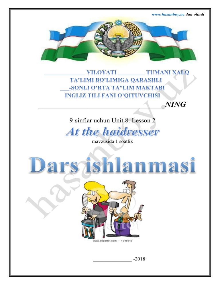 www.hasanboy.uz dan olindi _______________________________NING 9-sinflar uchun Unit 8. Lesson 2 mavzusida 1 soatlik _______________ -2018 www.hasanboy.uz dan olindi Date_____ Form_____ Subject: English Theme: At the hairdresser Aims: Educational: Developing: Socio-cultural: Up bringing: - to enable PP to talk about running a small business; to enable PP to tell the hairdresser how they would like their hair; to revise and practise asking for the spelling of words - to practise reading for detailed information; to raise awareness of issues in running a small business (homework) - to revise and practise greetings and responding to greetings on the Telephone; - to enrich pupils’ knowledge of our tradition and nation Learning outcomes for English competence C1, C2, C3, C4, C5, C6: At the end of the lesson pupils will be able to talk about running a small business; to tell the hairdresser how they would like their hair Type of the lesson: Mixed, group work, pair-work, individual work Method of the lesson: nontraditional, mixed Equipment of the lesson: Textbook “Fly High 9”, pictures, internet, computers, projector TECHNOLOGICAL MAP OF THE LESSON: № Part of the lesson Tasks Time 1 Organizational Moment -to greet pupils. - to check up the register 5 min 2 Repeating last lesson - to give pupils some questions about last lesson. – to ask words from previous lesson 5 min 3 Explaining new theme - to explain to pupils new vocabulary and theme 20 min 4 Consolidating new theme. - to consolidate new theme and new words of the theme. 10 min 5 Marking. - To mark pupils 6 Homework. - Giving homework. 5 min Procedure of the lesson: I. Organizing moment: Motivation, Greeting, checking attendance, season, weather, checking the preparation for the lesson. www.hasanboy.uz dan olindi II. Asking homework: - Check for homework given on past lesson. - Ask pupils all new words learnt on previous lesson. III. Pre-activity: Activity 1a Look at the picture and answer. Objective: to establish the context and prepare for reading and listening PP look at the picture and answer the question. Key: 1 At the hairdresser. 2 She is having her hair cut. 1 Where is it? 2 What is the girl having done? IV. Main part Activity 1b Listen to the conversation and write when the appointment is. Objective: to listen for detail Ask PP to copy the Appointments book page into their Ex.Bks. if they have not already done so. Ask PP to listen to the conversation and complete the page in the Appointments book. CD script Receptionist: Good morning. Legends hairdressers. How can I help you? Lucy: Good morning. I’d like to make an appointment to have my hair cut. Receptionist: OK. When do you want to come? I’m afraid next week is completely booked. I can fit you in on Monday 12th March at 10.00 in the morning. Lucy: Monday is OK, but not in the morning I’m afraid. Could I come in the afternoon? Receptionist: Yes, OK. What about 3 o’clock? Lucy: Yes, that’s fine. Receptionist: Could I have your name, please? Lucy: Yes, my name’s Whitfield. Receptionist: Could you spell that for me, please? Lucy: W-H-I-T-F-I-E-L-D. Receptionist: Thank you. So, Monday 12th at 3 o’clock. Lucy: Yes. Thanks very much. Goodbye. Receptionist: Thank you. Goodbye. Activity 1c Work in pairs. Pupil A use this page. Pupil B use page 84. Objective: to revise and practise making telephone calls This is a normal information gap activity. PP work in pairs and do the activity. When they finish they can compare their Appointment books. www.hasanboy.uz dan olindi Pupil A use this page. Pupil B use page 84.You are the hairdresser. Expect a phone call from a customer. Pupil B: telephone the hairdresser and make an appointment. Name: John Ducane You want: hair/cut on Tuesday You can’t come in the afternoon. Activity 2a Find in the Wordlist and translate. Objectives: to prepare for the next activity; to practise working with the Wordlist PP find the words in the Wordlist and translate them (or, if you prefer, you can simply tell PP). Then practise the pronunciation of the words with PP. PP say the words after you in chorus/rows and individually. parting colour chart hairspray perm blow dry Language Note Perm is short for ‘permanent wave’ and is the normal term used. Activity 2b. Read the text about Lydia and answer the questions Objective : to practise reading for detail and general information a fringe www.hasanboy.uz dan olindi This is Lydia. She is nineteen. She is tall and slim. She has curly brown hair and blue eyes. She lives with her parents. Lydia is a hairdresser. She loves her job! She always gets up at 7.30 and she has a shower. After that, she has a cup of coffee and a piece of toast. She usually gets the bus to work, but sometimes her Mum gives her a lift. She cuts hair and styles it. Ladies are always happy with their hairdo: they never complain! Lydia wants to buy her own salon and so she saves her money. She has lunch at one o’clock, usually just a sandwich. She leaves work at six and gets home half an hour later. Her Mum always cooks dinner. In the evening, Lydia watches TV and goes to bed at about eleven o’clock. She never stays up late! She goes out on Saturday nights with her friends. They go into town. They usually have a pizza and often they go to a bar afterwards. Lydia hasn’t got a boyfriend at the moment. But she really fancies someone! His name is Mark. He is twenty one and very handsome! He works in the garage opposite the hairdresser’s. Lydia sees him every day. They always smile at each other. She hopes that very soon, he will ask her out. Let’s wish Lydia the best of luck with Mark! 1. How old is Lydia? 2. Who does she live with? 3. Is she short? 4. What colour is her hair? 5. What colour are her eyes? 6. What is her job? 7. Does she hate her job? 8. What time does she get up every day? 9. What does she have for breakfast? 10. Does she always get the bus to work? 11. Who sometimes gives her a lift to work? 12. Are Lydi