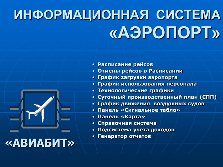 ИНФОРМАЦИОННАЯ СИСТЕМА «АЭРОПОРТ» «АВИАБИТ» • Расписание рейсов • Отмены рейсов в Расписании • График загрузки аэропорта • График использования персонала • Технологические графики • Суточный производственный план (СПП) • График движения воздушных судов • Панель «Сигнальное табло» • Панель «Карта» • Справочная система • Подсистема учета доходов • Генератор отчетов Одним из основных компонентов Информационной Системы «АЭРОПОРТ» является Расписание рейсов. Результаты планирования и корректировок Расписания, можно просмотреть в графическом виде и оценить по таким параметрам, как загрузка аэропорта и использование персонала. В процессе разработки Расписания система позволяет оценить наличие и достаточность людских и материальных ресурсов аэропорта для выполнения обслуживания рейсов. Для контроля за выполнением технологического процесса обслуживания по каждому рейсу в системе формируется Технологический График, который состоит из отдельных операций по обслуживанию ВС. Суточный производственный план обслуживания информационной системы «АЭРОПОРТ» наглядно и в реальном времени представляет все события, происходящие в аэропорту. Цветовой фон графических образов технологических операций сигнализирует о состоянии их выполнения: - ЗЕЛЕНЫЙ - выполнено - КРАСНЫЙ - опоздание - МАТОВЫЙ – блокировано - БЕЛЫЙ – еще не время - ЖЕЛТЫЙ– за 10 мин. до начала - СИНИЙ – идет Основным управляющим элементом системы является выполнение Панель «СИГНАЛЬНОЕ ТАБЛО». Здесь в реальном времени отражаются все состояния процесса обслуживания каждого рейса. Система позволяет настроить вывод информации в панель «СИГНАЛЬНОЕ ТАБЛО» индивидуально для каждого рабочего места. Это предусмотрено целью концентрации внимания каждого Вашему вниманиюспредставлено «СИГНАЛЬНОЕ ТАБЛО» пользователя только за технологическими операциями, выполнение Диспетчера службы организации пассажирских перевозок. которых он контролирует или непосредственно исполняет. Панель «Стоянки Воздушных Судов», так же как и При осуществлении оперативного контроляфайлами. здесь же панель «Карта», работает с графическими можно просмотреть сведения по любому ВС, их Места стоянок в системевсе можно определить, привязав находящемуся на стоянке. к реальным географическим координатам. Основные компоненты ИС «Аэропорт». Подсистема учета доходов. Система может Информационная система автоматически генерировать «Аэропорт» органично различные пакетов связывает комбинации Технологические услуг, всевозможные варианты Операции с выставлением оплаты от типов счетов в зависимости за Аэропортовые ВС, рейсов, Услуги. Категорий Заказчиков, перевозки CистемаВидов оплаты может и Видов сообщения и множества настраиваться и перенастрадругих иватьсяпараметров. в зависимости от С помощью данной требований и особенностей подсистемы автоматически работы конкретного Аэроформируется бухгалтерских порта. Эторяд обеспечивается документов, как Акты по посредством таких настраиваемых форме «А»оплаты и «С»,и счета шаблонов модулейна оплату услуг,с счет фактуры сопряжения СОП, -АТБ, ГСМ и и др. другими подразделениями Предприятия.