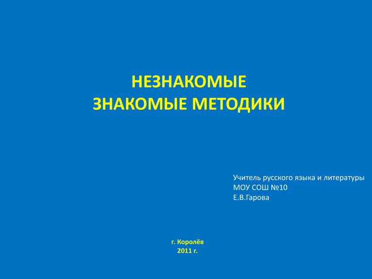 НЕЗНАКОМЫЕ ЗНАКОМЫЕ МЕТОДИКИ Учитель русского языка и литературы МОУ СОШ №10 Е.В.Гарова г. Королёв 2011 г. Основы Как известно, одним из самых сложных школьных предметов для большинства учащихся является русский язык. Затруднения при его изучении связаны во многом с логопедическими проблемами Логопедическое воздействие осуществляется различными методами, среди которых условно выделяются наглядные, словесные и практические. Наглядные методы направлены на обогащение содержательной стороны речи и обеспечивают взаимодействие двух сигнальных систем. Огромная роль в этом процессе принадлежит воспитателю. Словесные методы — на обучение пересказу, беседе, рассказу без опоры на наглядный материал и т.п. Практические методы используют при формировании речевых навыков путем широкого применения специальных упражнений, игр, инсценировок и т.д. Особое значение в логопедии придается использованию репродуктивных и продуктивных методов и их сочетанию с учетом специфики речевого нарушения. Репродуктивные методы эффективны в развитии имитационной способности детей, формировании навыков четкого произношения звукослоговых упражнений, при восприятии речевых образцов. Их роль особенно велика в формировании первоначальных навыков произношения звуков, коррекции нарушений голоса. Эффективность этих методов значительно увеличивается, если их использовать в контексте интересных для ребенка видов деятельности Продуктивные методы более широко используются при построении связных высказываний, различных видов рассказа, в творческих заданиях. Переход к использованию продуктивных методов каждый раз определяется логопедом и воспитателем в зависимости от конкретных задач коррекции нарушения и уровня сформированное необходимых предпосылок для перехода к самостоятельной речи. Причины неграмотного письма Ребенок с нормальным слухом, зрением и интеллектом может писать неграмотно из-за незрелости некоторых отделов мозга, отвечающих за двигательные функции рук, речевое внимание, зрительно-пространственную ориентацию. Именно это чаще всего и становится причиной низкого уровня грамотности, плохого почерка и, как следствие, неудовлетворительного поведения на уроках (Соболева, 2002). Кроме того, уровень грамотности зависит от взаимодействия больших полушарий головного мозга. Правое полушарие преимущественно отвечает за целостный образ, какого-либо предмета или слова, а левое — за его верное называние или написание в соответствии с правилами орфографии. Бывает так, что доминирует правое полушарие, а левое отстаёт в развитии. Именно поэтому довольно часто можно встретить активных школьников с ярким воображением, но абсолютно неграмотных! «Грамотность» (все отделы мозга , по А. Р. Лурия , условно разделены на три блока ) 1 блок 2 блок 3 блок активизация мозга развитие памяти ориентация фонематический слух программирование контроль зеркальное написание букв, ошибки в применении правил грамматики не умеют действовать по образцу: правило знают, а делают глупые ошибки, не могут соблюдать общие нормы поведения зрительное восприятие утомляемость : зевают, вертятся, роняют вещи. строят рожи, мешают другим дыхательная гимнастика , спец. массаж, двигательная коррекция Условия активизации работы мозга Структуры мозга, функциональная несформиро