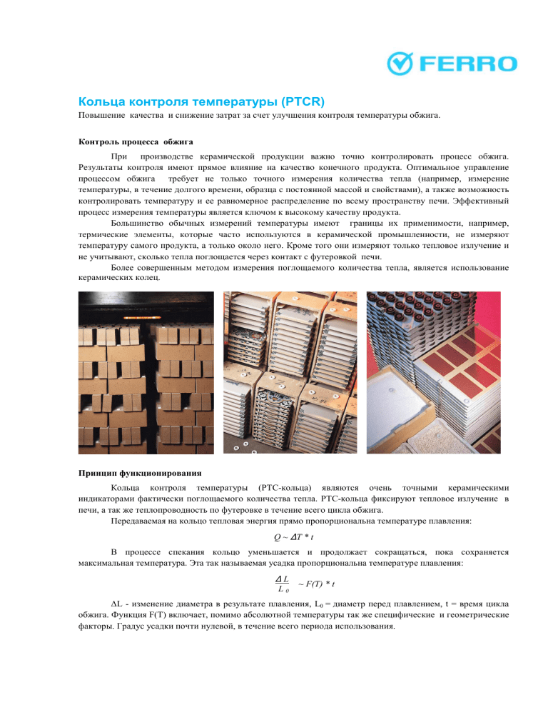 Кольца контроля температуры (PTCR) Повышение качества и снижение затрат за счет улучшения контроля температуры обжига. Контроль процесса обжига При производстве керамической продукции важно точно контролировать процесс обжига. Результаты контроля имеют прямое влияние на качество конечного продукта. Оптимальное управление процессом обжига требует не только точного измерения количества тепла (например, измерение температуры, в течение долгого времени, образца с постоянной массой и свойствами), а также возможность контролировать температуру и ее равномерное распределение по всему пространству печи. Эффективный процесс измерения температуры является ключом к высокому качеству продукта. Большинство обычных измерений температуры имеют границы их применимости, например, термические элементы, которые часто используются в керамической промышленности, не измеряют температуру самого продукта, а только около него. Кроме того они измеряют только тепловое излучение и не учитывают, сколько тепла поглощается через контакт с футеровкой печи. Более совершенным методом измерения поглощаемого количества тепла, является использование керамических колец. Принцип функционирования Кольца контроля температуры (РТС-кольца) являются очень точными керамическими индикаторами фактически поглощаемого количества тепла. PTC-кольца фиксируют тепловое излучение в печи, а так же теплопроводность по футеровке в течение всего цикла обжига. Передаваемая на кольцо тепловая энергия прямо пропорциональна температуре плавления: Q ~ )T * t В процессе спекания кольцо уменьшается и продолжает сокращаться, пока сохраняется максимальная температура. Эта так называемая усадка пропорциональна температуре плавления: )L L0 ~ F(T) * t ∆L - изменение диаметра в результате плавления, L0 = диаметр перед плавлением, t = время цикла обжига. Функция F(T) включает, помимо абсолютной температуры так же специфические и геометрические факторы. Градус усадки почти нулевой, в течение всего периода использования. Комбинация двух формул показывает, что величина сокращения кольца прямо пропорциональна общей сумме поглощенной теплоты: )L L0 ~Q Степень усадки, т.е. уменьшение диаметра кольца, измеряется аналоговым или цифровым микрометром. Таким образом, общая поглощенная теплота преобразовывается в измеряемую величину «Температура кольца». Строго говоря, это не «температура», а зависимая от времени и температуры величина. Температура кольца не показывает максимальную температуру обжига и не соответствует действительной температуре в печи, так как кольцо сохраняет поглощаемую теплоту в течение всего времени. Пересчет в температуру кольца. Измеренный диаметр кольца, с помощью таблицы, преобразуется в температуру кольца. Каждая преобразовательная таблица предназначена для определенной партии одного типа колец. Температура кольца это практическая единица измерения для целей сравнения. Например, можно сравнить измеренную величину тепла со стандартами и произвести коррекцию. Для того чтобы сделать сравнение разных циклов обжига нужно определить стандарт. Это достигается путем проведения серии обжигов с кольцами. Результаты необходимо сравнить с качеством продукции. Температура кольца, полученная при правильном обжиге продукции, может быть взята за эталон. Преимущества Пе