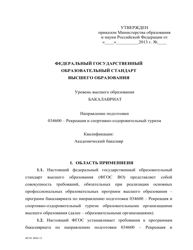 УТВЕРЖДЕН приказом Министерства образования и науки Российской Федерации от «____»__________2013 г. №____ ФЕДЕРАЛЬНЫЙ ГОСУДАРСТВЕННЫЙ ОБРАЗОВАТЕЛЬНЫЙ СТАНДАРТ ВЫСШЕГО ОБРАЗОВАНИЯ Уровень высшего образования БАКАЛАВРИАТ Направление подготовки 034600 – Рекреация и спортивно-оздоровительный туризм Квалификации: Академический бакалавр I. ОБЛАСТЬ ПРИМЕНИЕИЯ 1.1. Настоящий федеральный государственный образовательный стандарт высшего образования (ФГОС ВО) представляет совокупность требований, обязательных при реализации собой основных профессиональных образовательных программ высшего образования – программ бакалавриата по направлению подготовки 034600 – Рекреация и спортивно-оздоровительный туризм образовательными организациями высшего образования (далее – образовательными организациями). 1.2. Настоящий ФГОС устанавливает требования к программам бакалавриата по направлению подготовки 034600 – Рекреация и ФГОС ВПО-12 2 спортивно-оздоровительный присваивается туризм, квалификация по итогам «академический освоения бакалавр» которых (далее - программы с присвоением квалификации «академический бакалавр»). II. ИСПОЛЬЗУЕМЫЕ СОКРАЩЕНИЯ В настоящем стандарте используются следующие сокращения: ВО – высшее образование; ОК – общекультурные компетенции; ООП – основная образовательная программа ОПК – общепрофессиональные компетенции ПК – профессиональные компетенции ППК – профессионально-прикладные компетенции ФГОС ВО – федеральный государственный образовательный стандарт высшего образования; III. ХАРАКТЕРИСТИКА НАПРАВЛЕНИЯ ПОДГОТОВКИ 034600 – РЕКРЕАЦИЯ И СПОРТИВНО-ОЗДОРОВИТЕЛЬНЫЙ ТУРИЗМ 3.1. Высшее образование по программам бакалавриата в рамках данного направления подготовки может быть получено: 1) в образовательных организациях. Высшее образование по программам бакалавриата в рамках данного направления подготовки (в том числе инклюзивное образование инвалидов и лиц с ограниченными возможностями здоровья) может быть получено только в образовательных организациях. Получение высшего образования по программам бакалавриата в рамках данного направления подготовки в форме самообразования не допускается. ФГОС ВПО-12 3 3.2. Обучение по программам бакалавриата с присвоением квалификации «академический бакалавр» в образовательных организациях осуществляется в очной, очно-заочной или заочной формах. 3.3. Объем программы бакалавриата составляет 240 зачетных единиц (з.е.) вне зависимости от формы обучения, применяемых образовательных технологий, реализации программы несколькими организациями, осуществляющими образовательную деятельность, с использованием сетевой формы, реализации обучения по индивидуальному учебному плану, в том числе ускоренного обучения. 3.4. Срок получения образования по программе бакалавриата данного направления подготовки для очной формы обучения, включая каникулы, предоставляемые после прохождения государственной итоговой аттестации, независимо от применяемых образовательных технологий, составляет 4 года. Объем программы бакалавриата при очной форме обучения, реализуемый за один учебный год, составляет 60 з.е. 3.5. Срок получения образования по программе бакалавриата, реализуемой в очно-заочной или заочной форме обучения, независимо от применяемых образовательных технологий, должен быть увеличен на 1 