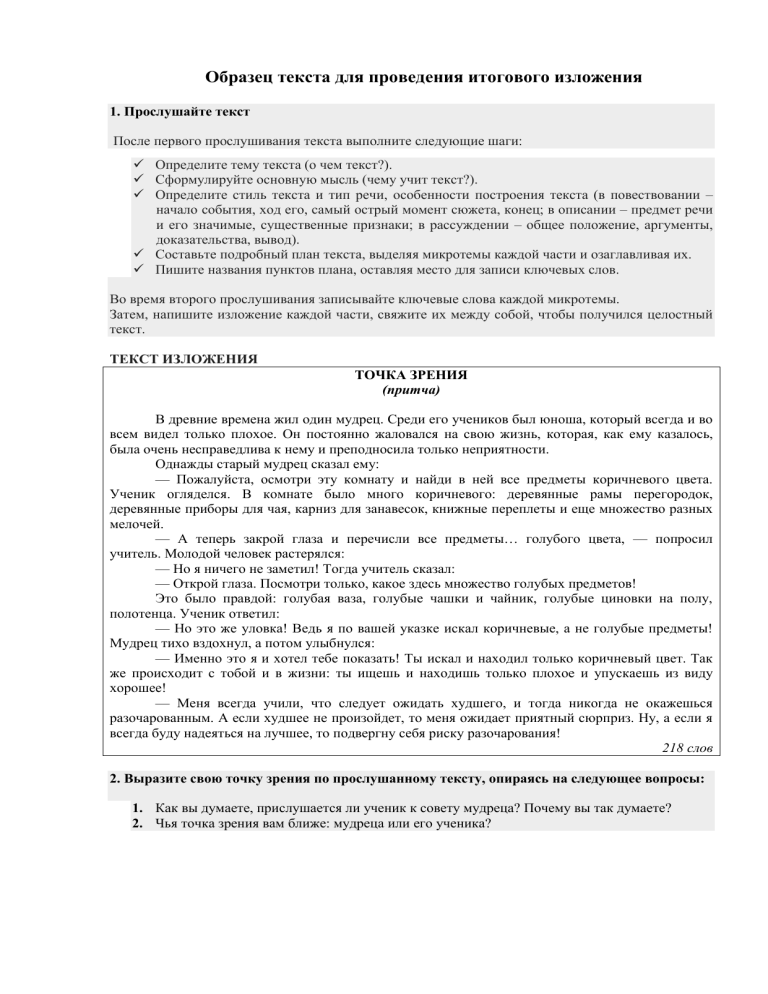 Образец текста для проведения итогового изложения 1. Прослушайте текст После первого прослушивания текста выполните следующие шаги: Определите тему текста (о чем текст?). Сформулируйте основную мысль (чему учит текст?). Определите стиль текста и тип речи, особенности построения текста (в повествовании – начало события, ход его, самый острый момент сюжета, конец; в описании – предмет речи и его значимые, существенные признаки; в рассуждении – общее положение, аргументы, доказательства, вывод). Составьте подробный план текста, выделяя микротемы каждой части и озаглавливая их. Пишите названия пунктов плана, оставляя место для записи ключевых слов. Во время второго прослушивания записывайте ключевые слова каждой микротемы. Затем, напишите изложение каждой части, свяжите их между собой, чтобы получился целостный текст. ТЕКСТ ИЗЛОЖЕНИЯ ТОЧКА ЗРЕНИЯ (притча) В древние времена жил один мудрец. Среди его учеников был юноша, который всегда и во всем видел только плохое. Он постоянно жаловался на свою жизнь, которая, как ему казалось, была очень несправедлива к нему и преподносила только неприятности. Однажды старый мудрец сказал ему: — Пожалуйста, осмотри эту комнату и найди в ней все предметы коричневого цвета. Ученик огляделся. В комнате было много коричневого: деревянные рамы перегородок, деревянные приборы для чая, карниз для занавесок, книжные переплеты и еще множество разных мелочей. — А теперь закрой глаза и перечисли все предметы… голубого цвета, — попросил учитель. Молодой человек растерялся: — Но я ничего не заметил! Тогда учитель сказал: — Открой глаза. Посмотри только, какое здесь множество голубых предметов! Это было правдой: голубая ваза, голубые чашки и чайник, голубые циновки на полу, полотенца. Ученик ответил: — Но это же уловка! Ведь я по вашей указке искал коричневые, а не голубые предметы! Мудрец тихо вздохнул, а потом улыбнулся: — Именно это я и хотел тебе показать! Ты искал и находил только коричневый цвет. Так же происходит с тобой и в жизни: ты ищешь и находишь только плохое и упускаешь из виду хорошее! — Меня всегда учили, что следует ожидать худшего, и тогда никогда не окажешься разочарованным. А если худшее не произойдет, то меня ожидает приятный сюрприз. Ну, а если я всегда буду надеяться на лучшее, то подвергну себя риску разочарования! 218 слов 2. Выразите свою точку зрения по прослушанному тексту, опираясь на следующее вопросы: 1. Как вы думаете, прислушается ли ученик к совету мудреца? Почему вы так думаете? 2. Чья точка зрения вам ближе: мудреца или его ученика?