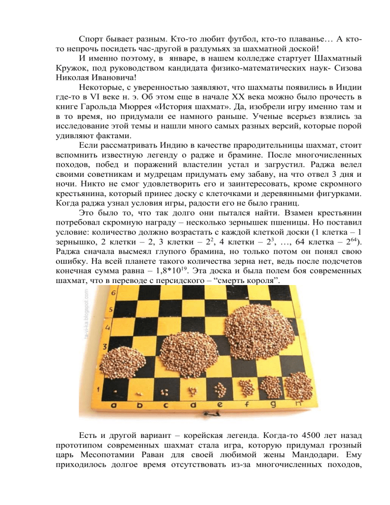 Спорт бывает разным. Кто-то любит футбол, кто-то плаванье… А ктото непрочь посидеть час-другой в раздумьях за шахматной доской! И именно поэтому, в январе, в нашем колледже стартует Шахматный Кружок, под руководством кандидата физико-математических наук- Сизова Николая Ивановича! Некоторые, с уверенностью заявляют, что шахматы появились в Индии где-то в VI веке н. э. Об этом еще в начале XX века можно было прочесть в книге Гарольда Мюррея «История шахмат». Да, изобрели игру именно там и в то время, но придумали ее намного раньше. Ученые всерьез взялись за исследование этой темы и нашли много самых разных версий, которые порой удивляют фактами. Если рассматривать Индию в качестве прародительницы шахмат, стоит вспомнить известную легенду о радже и брамине. После многочисленных походов, побед и поражений властелин устал и загрустил. Раджа велел своими советникам и мудрецам придумать ему забаву, на что отвел 3 дня и ночи. Никто не смог удовлетворить его и заинтересовать, кроме скромного крестьянина, который принес доску с клеточками и деревянными фигурками. Когда раджа узнал условия игры, радости его не было границ. Это было то, что так долго они пытался найти. Взамен крестьянин потребовал скромную награду – несколько зернышек пшеницы. Но поставил условие: количество должно возрастать с каждой клеткой доски (1 клетка – 1 зернышко, 2 клетки – 2, 3 клетки – 22, 4 клетки – 23, …, 64 клетка – 264). Раджа сначала высмеял глупого брамина, но только потом он понял свою ошибку. На всей планете такого количества зерна нет, ведь после подсчетов конечная сумма равна – 1,8*1019. Эта доска и была полем боя современных шахмат, что в переводе с персидского – “смерть короля”. Есть и другой вариант – корейская легенда. Когда-то 4500 лет назад прототипом современных шахмат стала игра, которую придумал грозный царь Месопотамии Раван для своей любимой жены Мандодари. Ему приходилось долгое время отсутствовать из-за многочисленных походов, поэтому его супруга часто грустила. Шахматы настолько заинтересовали всех жителей дворца, что они распространились по всему миру (Индия, Китай, Корея). Теперь точно установить это невозможно, ведь в то время под словом шахматы люди могли объединить разные игры: кости, нарды, чаупара или пачизи. У всех этих вариантов есть одно общее – квадратная или крестообразная доска. Нам остается только угадывать, что из них было первым. Шахматы на Руси К нам игра пришла в 820 году. Это был вариант арабского шатранджа под названием шахмат. Для благозвучия их стали называть привычным для всех словом – шахматы. Получается, что путь движения начинается в Персии, после чего они проникли на Кавказ и Хазарский каганат, а оттуда уже к нам. Если рассмотреть названия фигур, можно заметить разительное сходство с арабскими и персидскими названиями. Так, название слона и коня является арабским, а ферзь происходит от персидского слова фарзин. Но международная европейская терминология и вариация игры была привезена из Польши, в которую шахматы проникли через Италию. Поэтому начало шахмат на Руси датируется X-XI веком. Параллельно ига просочилась в Европу, где и приобрела вид современных шахмат. Но все-таки еще многие года в каждом городке и селении были свои особенности, правила и методики. Долгий путь шахмат Полноценно теория игры в шахматы начала развиваться лиш