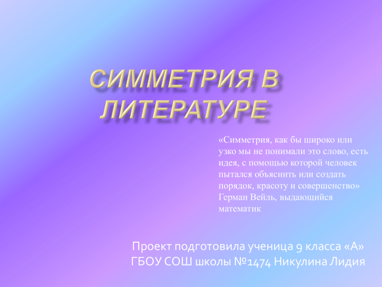 «Симметрия, как бы широко или узко мы не понимали это слово, есть идея, с помощью которой человек пытался объяснить или создать порядок, красоту и совершенство» Герман Вейль, выдающийся математик Проект подготовила ученица 9 класса «А» ГБОУ СОШ школы №1474 Никулина Лидия Понятие симметрии проходит через всю многовековую историю человеческого творчества.Симметрия – один из законов,обеспечивающих гармонию Вселенной. Симметрия - (греч. соразмерность, правильность, согласованность) в широком смысле — соответствие, неизменность, проявляемые при каких-либо изменениях, уравновешенное, гармоничное соотношение пропорций. Это закономерная повторяемость равных частей, слагающихся в фигуру. Симметрия в нашем представлении тесно связана с понятием красоты. Слово «симметрия» имеет два смысла: 1)пропорция, баланс – способ согласия многих частей для объединения их в целое; 2)равновесие. Существуют две группы симметрии: 1)симметрия положений, форм, структур (т.е. то, что можно непосредственно видеть); 2)симметрия физических явлений и законов природы. Симметрия - это пропорциональность, соразмерность в расположении частей целого в пространстве, полное соответствие (по расположению, величине) одной половины целого другой половине. Соразмерность - это отношение отдельных частей формы, связанных единым модулем(величиной),закономерная взаимосвязь. Пропорциональность – соразмерность этих частей (глаз относительно носа, удаленность губ от носа и т.д.),целостность всех частей формы. Симметричный не значит равный, а подобный чему-либо. Симметрия выражает принцип соответствия. Понятие симметрии встречается во многих областях человеческой жизни, в том числе в культуре, искусстве, в сфере научных знаний, в окружающем мире. Симметрия встречается в повторяющихся моделях социальных взаимоотношений. Симметричные взаимодействия людей говорят:«мы одинаковые»,а ассиметричные выражают мысль «я особый, лучший».Взаимоотношения строятся на основе симметрии, а властные отношения – на ассиметрии. Можно отметить, что симметрия присутствует также в алфавите. Так, в буквах О,Н,Ж,Х - горизонтальная и вертикальная симметрия. Вертикальная симметрия - А,М,Ш Горизонтальная – В,Е,С,Э Существуют также симметричные слова – палиндромы, которые читаются одинаково в двух направлениях (шалаш, казак, топот). И симметричные предложения, которые тоже читаются одинаково в разных направлениях - «А роза упала на лапу Азора» (А.Фет) Симметрия встречается в русских народных сказках. Это явление можно рассмотреть как зеркальную симметрию на примере любой сказки, в которой главным персонажем является Иван-дурак, несмышленый, глупый и неудачливый чудак, каким он показан в начале сказки. Но в конце - раскрывается его истинный характер. Он становится выше своих братьев, получив богатство, хорошее положение и жену. Таким образом, добро торжествует над злом. В «Сказке о царе Салтане» присутствует противопоставление красивой царевны-Лебедь ткачихе и поварихе.В трагедии Гёте «Фауст» Прекрасная Елена противопоставляется уродливой старухе Форкиаде, в то время как Елена становится выразителем красоты. Ткачиха, повариха и сватья бабабабариха. «Сказка о царе Салтане» Царевна-Лебедь. «Сказка о царе Салтане» «Поучение» Владимира Мономаха «Повесть о Петре и Февронии Муромских» «Если же на