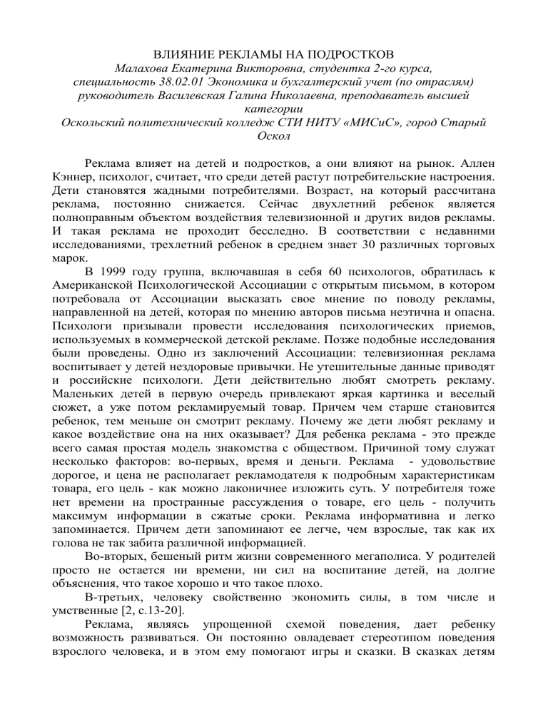 ВЛИЯНИЕ РЕКЛАМЫ НА ПОДРОСТКОВ Малахова Екатерина Викторовна, студентка 2-го курса, специальность 38.02.01 Экономика и бухгалтерский учет (по отраслям) руководитель Василевская Галина Николаевна, преподаватель высшей категории Оскольский политехнический колледж СТИ НИТУ «МИСиС», город Старый Оскол Реклама влияет на детей и подростков, а они влияют на рынок. Аллен Кэннер, психолог, считает, что среди детей растут потребительские настроения. Дети становятся жадными потребителями. Возраст, на который рассчитана реклама, постоянно снижается. Сейчас двухлетний ребенок является полноправным объектом воздействия телевизионной и других видов рекламы. И такая реклама не проходит бесследно. В соответствии с недавними исследованиями, трехлетний ребенок в среднем знает 30 различных торговых марок. В 1999 году группа, включавшая в себя 60 психологов, обратилась к Американской Психологической Ассоциации с открытым письмом, в котором потребовала от Ассоциации высказать свое мнение по поводу рекламы, направленной на детей, которая по мнению авторов письма неэтична и опасна. Психологи призывали провести исследования психологических приемов, используемых в коммерческой детской рекламе. Позже подобные исследования были проведены. Одно из заключений Ассоциации: телевизионная реклама воспитывает у детей нездоровые привычки. Не утешительные данные приводят и российские психологи. Дети действительно любят смотреть рекламу. Маленьких детей в первую очередь привлекают яркая картинка и веселый сюжет, а уже потом рекламируемый товар. Причем чем старше становится ребенок, тем меньше он смотрит рекламу. Почему же дети любят рекламу и какое воздействие она на них оказывает? Для ребенка реклама - это прежде всего самая простая модель знакомства с обществом. Причиной тому служат несколько факторов: во-первых, время и деньги. Реклама - удовольствие дорогое, и цена не располагает рекламодателя к подробным характеристикам товара, его цель - как можно лаконичнее изложить суть. У потребителя тоже нет времени на пространные рассуждения о товаре, его цель - получить максимум информации в сжатые сроки. Реклама информативна и легко запоминается. Причем дети запоминают ее легче, чем взрослые, так как их голова не так забита различной информацией. Во-вторых, бешеный ритм жизни современного мегаполиса. У родителей просто не остается ни времени, ни сил на воспитание детей, на долгие объяснения, что такое хорошо и что такое плохо. В-третьих, человеку свойственно экономить силы, в том числе и умственные [2, с.13-20]. Реклама, являясь упрощенной схемой поведения, дает ребенку возможность развиваться. Он постоянно овладевает стереотипом поведения взрослого человека, и в этом ему помогают игры и сказки. В сказках детям предлагаются решения того, что правильно, а что нет, как поступать в тех или иных ситуациях. Благодаря игре дети вырабатывают собственные сценарии поведения. Реклама в восприятии ребенка - синтез игры и сказки. Важное место в развитии ребенка занимают эстетические чувства: чувства прекрасного и безобразного, чувство гармонии, чувство ритма, чувство комического. В этом возрасте ребенок начинает ориентироваться в таких понятиях, как правда и ложь. Но, рекламные образы могут нарушить правильные представления ребенка о подобных понятиях. В связи с этим необх