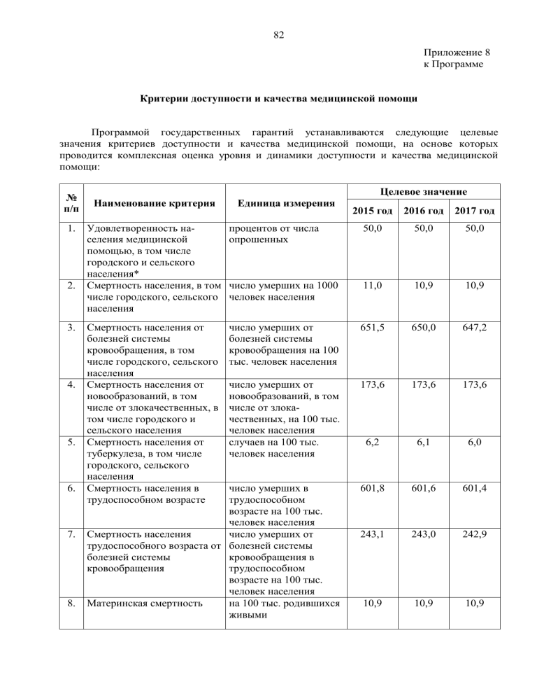 82 Приложение 8 к Программе Критерии доступности и качества медицинской помощи Программой государственных гарантий устанавливаются следующие целевые значения критериев доступности и качества медицинской помощи, на основе которых проводится комплексная оценка уровня и динамики доступности и качества медицинской помощи: № п/п 1. 2. 3. 4. 5. 6. 7. 8. Целевое значение Наименование критерия Единица измерения 2015 год 2016 год 2017 год Удовлетворенность населения медицинской помощью, в том числе городского и сельского населения* Смертность населения, в том числе городского, сельского населения процентов от числа опрошенных 50,0 50,0 50,0 число умерших на 1000 человек населения 11,0 10,9 10,9 Смертность населения от болезней системы кровообращения, в том числе городского, сельского населения Смертность населения от новообразований, в том числе от злокачественных, в том числе городского и сельского населения Смертность населения от туберкулеза, в том числе городского, сельского населения Смертность населения в трудоспособном возрасте число умерших от болезней системы кровообращения на 100 тыс. человек населения 651,5 650,0 647,2 число умерших от новообразований, в том числе от злокачественных, на 100 тыс. человек населения случаев на 100 тыс. человек населения 173,6 173,6 173,6 6,2 6,1 6,0 число умерших в трудоспособном возрасте на 100 тыс. человек населения Смертность населения число умерших от трудоспособного возраста от болезней системы болезней системы кровообращения в кровообращения трудоспособном возрасте на 100 тыс. человек населения Материнская смертность на 100 тыс. родившихся живыми 601,8 601,6 601,4 243,1 243,0 242,9 10,9 10,9 10,9 83 на 1000 родившихся живыми 7,0 6,8 6,6 10. Смертность детей в возрасте на 1000 человек на0-4 лет селения соответствующего возраста 11. Смертность детей в возрасте на 100 тыс. человек 0-17 лет населения соответствующего возраста 1,94 1,93 1,93 60 59 59 12. Доля пациентов, больных процент злокачественными новообразованиями, состоящих на учете с момента установления диагноза 5 лет и более, в общем числе пациентов со злокачественными новообразованиями, состоящих на учете 13. Обеспеченность населения на 10 тыс. человек врачами, в том числе населения, включая оказывающими городское и сельское медицинскую помощь в население амбулаторных и стационарных условиях, в государственных областных и муниципальных медицинских организациях 14. Обеспеченность населения на 10 тыс. человек средним медицинским населения, включая персоналом, в том числе городское и сельское оказывающим медицинскую население помощь в амбулаторных и стационарных условиях 15. Средняя длительность дней лечения в медицинской организации, оказывающей медицинскую помощь в стационарных условиях 16. Эффективность дней деятельности медицинских организаций на основе оценки выполнения функции врачебной должности, показателей рационального и целевого использования коечного фонда: среднегодовая занятость койки 53,1 53,2 53,3 37,1 37,4 37,6 109,9 110,4 110,8 11,7 11,6 11,6 331 332 332 9. Младенческая смертность 84 17. Доля расходов на оказание процент медицинской помощи в условиях дневных стационаров в общих расходах на территориальную программу 18. Доля расходов на оказание процент медицинской помощи в амбулаторных условиях в неотложной форме в общих расходах на территориальную программу 19. Доля расходов на оказание процент паллиативной медицинской помощи 