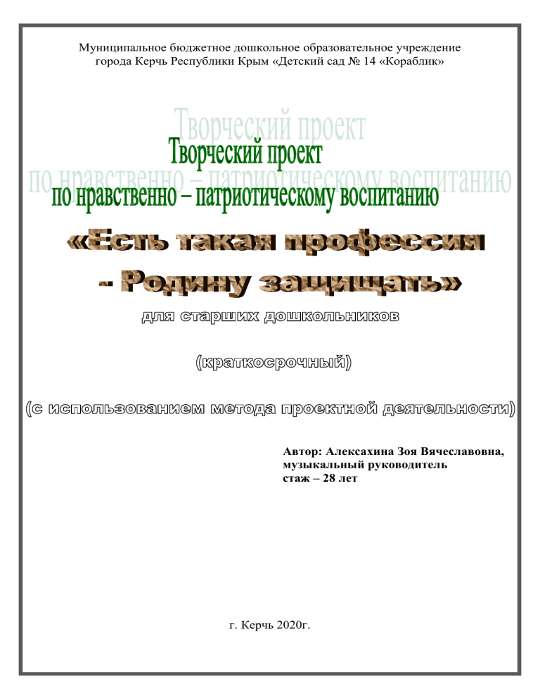 Муниципальное бюджетное дошкольное образовательное учреждение города Керчь Республики Крым «Детский сад № 14 «Кораблик» Автор: Алексахина Зоя Вячеславовна, музыкальный руководитель стаж – 28 лет г. Керчь 2020г. Актуальность проекта: В силу последних перемен все более заметной стала утрата нашим обществом традиционного российского патриотического сознания. В связи с этим очевидна неотложность решения острейших проблем воспитания патриотизма в работе с детьми дошкольного возраста. Исторически сложилось так, что любовь к Родине, патриотизм во все времена в Российском государстве были чертой национального характера. Не менее важным условием нравственно-патриотического воспитания детей является тесная взаимосвязь по данному вопросу с родителями. Взаимодействие с родителями способствует бережному отношению к традициям, сохранению семейных связей. В настоящее время эта работа актуальна и особенно трудна, требует большого такта и терпения, так как в молодых семьях вопросы воспитания патриотизма, гражданственности не считаются важными и, зачастую, вызывают лишь недоумение. Цель проекта: формирование чувства патриотизма у детей старшего дошкольного возраста; приобщение родителей к участию в жизни детского сада. Задачи проекта: дать знания детям о Российской армии, уточнить их представления о родах войск; развивать у детей познавательную активность, творческие способности; продолжать воспитывать у детей патриотические чувства к Родине, гордость за нашу историю; развивать и обогащать речь детей, повышать эрудицию и интеллект; проводить работу с родителями, привлекая их к патриотическому воспитанию детей в семье. Участники проекта: музыкальный руководитель, дети старшего дошкольного возраста, родители воспитанников, педагоги групп. Предполагаемый результат: повышение знаний у детей о Российской армии. проявление у детей интереса к армии, уважения к защитникам Отечества. стремление детей к совершенствованию физических качеств, к укреплению здоровья. стремление детей отражать свои знания, впечатления, мысли и чувства в играх, в исполнении песен, в чтении стихов. повышение заинтересованности родителей в формировании чувства патриотизма у детей. Реализация проекта: февраль 2016 года. Этапы проекта: I этап. Подготовительный. Разработка проекта. Донести до участников проекта важность данной проблемы. Подобрать методическую, научно-популярную и художественную литературу, иллюстративный материал по данной теме. Продумывание творческих заданий для детей и родителей. Подобрать материалы, игрушки, атрибуты для игровой, театрализованной деятельности. Подготовка к празднику, посвященному дню защитника Отечества. II этап. Выполнение проекта. Проведение с детьми бесед о российской армии, о защитниках нашей Родины. Проведение подвижных, дидактических, сюжетно-ролевых игр, спортивного развлечения. Чтение художественной литературы детям (заучивание стихов). Рассматривание иллюстраций, разучивание песен, танцевальных композиций, театрализованных сценок, просмотр фрагментов видеофильмов и презентаций. III этап. Результаты. Проведение патриотического утренника «23 февраля – Есть такая профессия Родину защищать»; Приобщение родителей к участию в жизни детского сада. Продуктивная деятельность: оформление выставки «Военная техни
