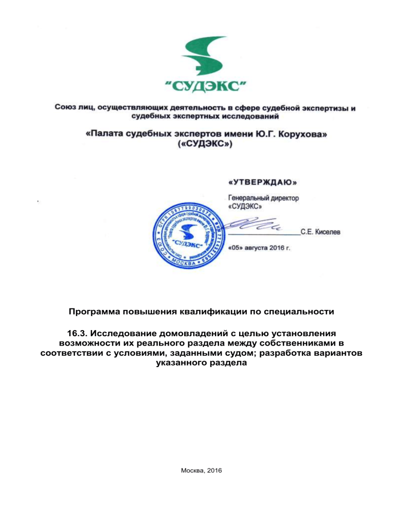 Программа повышения квалификации по специальности 16.3. Исследование домовладений с целью установления возможности их реального раздела между собственниками в соответствии с условиями, заданными судом; разработка вариантов указанного раздела Москва, 2016 Программа повышения квалификации по специальности 16.3. Исследование домовладений с целью установления возможности их реального раздела между собственниками в соответствии с условиями, заданными судом; разработка вариантов указанного раздела1 Настоящая программа предназначена для самостоятельной подготовки (в течение одного года) судебных экспертов, имеющих высшее образование и специализирующихся в области исследования строительных объектов и территории, функционально связанной с ними, в том числе с целью проведения их оценки. Курс обучения состоит из общих и специальных дисциплин. Самостоятельное изучение курса предусматривает освоение общих дисциплин «Основы криминалистики» и «Основы судебной экспертизы» по программам, общим для всех экспертных специальностей. Программа изучения специальных дисциплин составлена с учетом необходимости освоения экспертами теоретических и методических основ производства судебных строительно-технических экспертиз и вопросов профилактической деятельности судебного эксперта-строителя. I. Общая часть Тема 1. Теоретические и методические основы судебной строительно-технической экспертизы (ССТЭ) 1. Специальные знания судебного эксперта-строителя и специалиста, их структура и содержание. 2. Специфические черты деятельности судебного эксперта-строителя и специалиста. Их компетенция и компетентность. Процессуальная и ведомственная регламентации деятельности судебного эксперта-строителя и специалиста. 3. Понятия предмета, объекта и задачи ССТЭ. Взаимосвязь содержания этих понятий. 4. Задачи ССТЭ: классификационные (установление принадлежности строительных объектов, их отдельных фрагментов, продукции промышленности строительных материалов и изделий к определенному классу, роду, виду, группе); диагностические (установление технического состояния строительного объекта и его отдельных фрагментов, соответствия характеристик продукции строительного производства современным требованиям либо требованиям определенного периода времени); ситуалогические (определение последовательности, продолжительности и характера процессов, явлений, событий и действий, ставших предметом уголовного расследования либо судебного разбирательства; установление взаимного расположения объектов экспертизы в ходе натурных исследований); нормативно-технические (установление соответствия требованиям специальных правил (какой-либо норме) действий (бездействия при необходимости их выполнения) лиц – фигурантов по уголовному, гражданскому или арбитражному делу, либо результатов их деятельности, например, продукции строительного производства); каузальные (установление наличия и вида причинных связей между отступлениями от требований специальных правил (норм) и наступившими последствиями); персонофицирующие (установление лица (круга лиц), в обязанности которого (которых) входило обеспечение соблюдения требований специальных правил (норм) на определенном участке производства строительных работ либо эксплуатации строительных объектов); пре