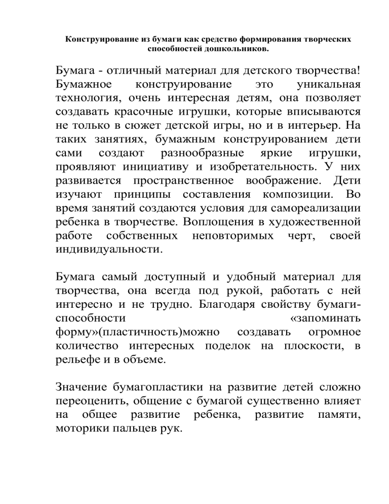 Конструирование из бумаги как средство формирования творческих способностей дошкольников. Бумага - отличный материал для детского творчества! Бумажное конструирование это уникальная технология, очень интересная детям, она позволяет создавать красочные игрушки, которые вписываются не только в сюжет детской игры, но и в интерьер. На таких занятиях, бумажным конструированием дети сами создают разнообразные яркие игрушки, проявляют инициативу и изобретательность. У них развивается пространственное воображение. Дети изучают принципы составления композиции. Во время занятий создаются условия для самореализации ребенка в творчестве. Воплощения в художественной работе собственных неповторимых черт, своей индивидуальности. Бумага самый доступный и удобный материал для творчества, она всегда под рукой, работать с ней интересно и не трудно. Благодаря свойству бумагиспособности «запоминать форму»(пластичность)можно создавать огромное количество интересных поделок на плоскости, в рельефе и в объеме. Значение бумагопластики на развитие детей сложно переоценить, общение с бумагой существенно влияет на общее развитие ребенка, развитие памяти, моторики пальцев рук. Ещё Василий Александрович Сухомлинский говорил: «Ум ребенка находится на кончиках его пальцев» ,поэтому любая работа с бумагой (складывание, вырезание, скручивание)дает возможность проявить свою индивидуальность, развивает творческое воображение и мышление, помогает приобщить ребенка к миру прекрасного, помогает формировать навыки конструирования, способность к самостоятельности и опыт работы в коллективе. Ребенок знакомится с бумагой с 2-3 лет(это выполнение простых аппликаций).В среднем и старшем возрасте 4-5 летние дети уже способны выполнять простые операции по вырезанию по шаблону, применять технику скручивания жгутов и шариков, и выполнять простые базовые фигуры оригами, осваивать работу с ножницами и в обрывной технике. Детям 6-7 лет при подготовке к обучению в школе особенно полезно заниматься бумагопластикой, т.к. рука ребенка готовится к письму. Рекомендуется чаще использовать ножницы, выполнять поделки из цветной или белой бумаги, картона и салфеток, использовать различную фактуру бумаги. Осваивать способность в чтении схем для сборки фигурок оригами, умение составлять композицию. Во время продуктивной деятельности мы применяем различные техники работы с бумагой: 1) Простая аппликация (наклеивание готовых деталей из бумаги на картонную основу) 2) Обрывная аппликация(мозаика из кусочков бумаги) 3) Объемная аппликация (скручивание жгутов, шариков) 4) Торцевание (контурное,плоскостное,объемное) 5) Папье-маше (с фр. «жеваная бумага»-масса с клеем пва(маски, муляжи,игрушки,тарелочки) 6) Оригами(Древнее китайское искусство складывания фигурок из бумаги—Это цепочка превращений исходного листа от начала до конца работы, это игровая технология, своеобразный бумажный конструктор, при помощи которого можно развить в ребенке способности к пространственному мышлению и устойчивости внимания, развить память и творческое воображение. Мы разработали пособие к занятиям по оригами, в котором доступно и наглядно показаны схемы основных базовых форм, при помощи которых можно научить быстро и легко собирать простые фигурки. Дети с удовольствием пользуются такими 