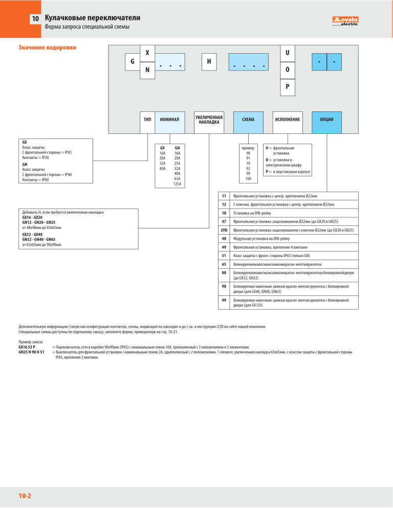 10 Кулачковые переключатели Форма запроса специальной схемы Значение кодировки GG X X N • • • U H • • • • • • O P ТИП GX Класс защиты: С фронтальной стороны = IP65 Контакты = IP20 GN Класс защиты: С фронтальной стороны = IP40 Контакты = IP00 НОМИНАЛ GX 16A 20A 32A 40A УВЕЛИЧЕННАЯ НАКЛАДКА GN 16A 20A 25A 32A 40A 63A 125A пример: 90 91 10 92 99 100 11 Добавить H, если требуется увеличенная накладка GX16 - GX20 GN12 - GN20 - GN25 от 48x48мм до 65x65мм GX32 - GX40 GN32 - GN40 - GN63 от 65x65мм до 90x90мм СХЕМА ИСПОЛНЕНИЕ ОПЦИИ U = фронтальная установка O = установка в электрическом шкафу. P = в пластиковом корпусе Фронтальная установка с центр. креплением Ø22мм 12 С ключом, фронтальная установка с центр. креплением Ø22мм 18 Установка на DIN-рейку 47 Фронтальная установка защелкиванием Ø22мм (до GX20 и GN25) 29D Фронтальная установка защелкиванием с ключом Ø22мм (до GX20 и GN25) 48 Модульная установка на DIN-рейку 4V Фронтальная установка, крепление 4 винтами 51 Класс защиты с фронт. стороны IP65 (только GN) 65 Блокируемаянавеснымзамкомкрасно-желтаярукоятка 88 Блокируемаянавеснымзамкомкрасно-желтаярукояткасблокировкойдвери (до GX32, GN32) 98 Блокируемая навесным замком красно-желтая рукоятка с блокировкой двери (для GX40, GN40, GN63) 99 Блокируемая навесным замком красно-желтая рукоятка с блокировкой двери (для GX125) Дополнительную информацию (такую как конфигурация контактов, схемы, индикация на накладке и до.) см. в инструкции I230 на сайте нашей компании Специальные схемы доступны по отдельному заказу; заполните форму, приведенную на стр. 10-21. Пример заказа GX16 53 P GN25 H 90 U 51 10-2 = Переключатель сети в коробке 90x90мм (IP65) с номинальным током 16А, трехполюсный с 3 положениями и 3 элементами. = Выключатель для фронтальной установки с номинальным током 2A, однополюсный с 2 положениями, 1 элемент, увеличенная накладка 65x65мм, с классом защиты с фронтальной стороны IP65, крепление 2 винтами. 10 Кулачковые переключатели Форма запроса специальной схемы 12 11 1 10 2 D A C B 9 1 4 5 8 9 12 13 16 17 20 21 24 25 28 29 32 33 36 37 40 41 44 45 48 2 3 6 7 10 11 14 15 18 19 22 23 26 27 30 31 34 35 38 39 42 43 46 47 3 8 4 7 6 5 Символ накладки поз. 7 C 8 10 9 10 D 11 12 1 A 2 3 4 B 5 6 Фронтальная накладка 1 X X X X 2 X Перекрывающиеся контакты X X Замкнутый контакт в 2 или более положениях Разомкнутый контакт Замкнутый контакт Автовозврат КОРПУС: Квадратный - GX Круглый - GN ИСПОЛНЕНИЕ: Фронтальная установка Установка с задней стороны В пластиковом корпусе Другое .................................... РУКОЯТКА: Стандартная 2 винтами Красно-желтая ручка 4 винтами КРЕПЛЕНИЕ: Номинальный ток ............... Специальная ............................... Защелкиванием Кол-во:.................. Название организации и контактное лицо: ........................................................................................................ .............................................................................................................................................................................. 40A - макс. номинальный ток для серии GX. Стандартной отделке соответствует фронтальная накладка серого цвета и градуировка 0-12 и ручка черного цвета. Другие типы считаются специальными исполнениями. См. также инструкцию I230 на нашем сайте www.LovatoElectric.ru. 10-3 10 Кулачковые переключатели Серия GN Исполнение U, фронтальная установка. Переключатели сети. Переключатели без положения “0” Код заказа Номиналь Размеры К-во Вес ный ток в фронт. по катего. AC1 накладки упак. [A] [мм] шт. [кг] 48 48 1 0,078 1 0,081 48 65 1 0,090 1 0,183 65 65 1 0,194 1 0,224 1 0,095 20 48 48 1 0,098 25 48 1 0,121 7 GN32 52 U 32 1 0,232 7 GN40 52 U 40 1 0,246 7 GN63 52 U 63 65 65 65 1 0,302 7 GN125 52 U 125 90 1 0,798 ПЕРЕКЛЮЧАТЕЛИ СЕТИ. Однополюсные - с 1 элементом - схема 51. 7 GN12 51 U 16 7 GN20 51 U 20 1 7 GN25 51 U 0 2 25 7 GN32 51 U