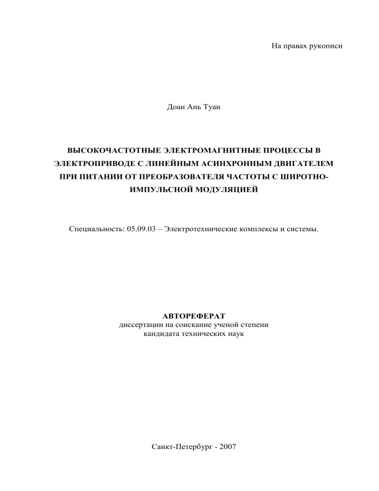 На правах рукописи Доан Ань Туан ВЫСОКОЧАСТОТНЫЕ ЭЛЕКТРОМАГНИТНЫЕ ПРОЦЕССЫ В ЭЛЕКТРОПРИВОДЕ С ЛИНЕЙНЫМ АСИНХРОННЫМ ДВИГАТЕЛЕМ ПРИ ПИТАНИИ ОТ ПРЕОБРАЗОВАТЕЛЯ ЧАСТОТЫ С ШИРОТНОИМПУЛЬСНОЙ МОДУЛЯЦИЕЙ Специальность: 05.09.03 – Электротехнические комплексы и системы. АВТОРЕФЕРАТ диссертации на соискание ученой степени кандидата технических наук Санкт-Петербург - 2007 2 Работа выполнена в Санкт-Петербургском государственном электротехническом университете «ЛЭТИ» им. В.И. Ульянова (Ленина) Научный руководитель доктор технических наук, профессор, засл. деятель науки РФ Коськин Ю.П. Официальные оппоненты: доктор технических наук, профессор Ковчин С.А. кандидат технических наук, доцент Позняк И.В. Ведущая организация – ОАО «Силовые машины» филиал «Электросила» в СанктПетербурге. Защита диссертации состоится «___ »_______2007 года в часов на заседании диссертационного совета Д 212.238.05 Санкт-Петербургского государственного электротехнического университета «ЛЭТИ» им. В.И. Ульянова (Ленина) по адресу: 197376, Санкт-Петербург, ул. Проф. Попова, 5. С диссертацией можно ознакомиться в библиотеке университета. Автореферат разослан «___»_______2007 г. Ученый секретарь диссертационного совета Дзлиев С.В. 3 ОБЩАЯ ХАРАКТЕРИСТИКА РАБОТЫ Актуальность темы. Большая часть энергосберегающих технологий в мире в настоящее время разрабатывается на основе применения асинхронных электроприводов с частотным управлением. В качестве преобразователей частоты (ПЧ) широко используются ПЧ с широтно-импульсной модуляцией (ШИМ) напряжения. Применение линейных асинхронных двигателей (ЛАД) в электроприводах возвратно-поступательного движения обеспечивает упрощение кинематической схемы привода, повышение надежности, снижение механических потерь и ряд других преимуществ. Применение ПЧ-ШИМ в асинхронных линейных электроприводах (АЛЭП) сопровождается возникновением в системе ПЧ-ШИМ – кабель – ЛАД высокочастотных электромагнитных процессов (ВЧЭП), обусловленных несинусоидальностью и импульсами напряжения на выходе ПЧ и имеющих частоту 104 – 106 Гц. При наличии в системе ВЧЭП актуальной становится проблема электромагнитной совместимости ПЧ и статорных обмоток ЛАД. В качестве критериев совместимости обычно рассматриваются перенапряжения, дополнительные потери энергии, старение изоляции и надежность. Анализ опубликованных трудов применительно к указанной проблеме, а также опыт, приобретенный автором при выполнении НИР в СПбГЭТУ «ЛЭТИ» в период 2004 – 2007 гг., позволяют считать, что до самого последнего времени в электротехнике остаются актуальными и нерешенными задачи, связанные с моделированием и анализом ВЧЭП в АЛЭП с ПЧ-ШИМ, созданием методик расчетного и экспериментального определения высокочастотных параметров (ВЧП) и показателей эффективности функционирования АЛЭП. Актуальность темы подтверждается запросами промышленных предприятий и, в частности, договорами №6343/РАПС-48 от 01.04.2003 и №6575/РАПС-53 от 25.05.2006, с учетом которых решались задачи при подготовке диссертации. Цель диссертационной работы – определение и анализ параметров и характеристик высокочастотных электромагнитных процессов в асинхронном линейном электроприводе при широтно-импульсной модуляции напряжения. Объектом исследования являются электроприводы на основе линейных асинхронных двигателей, 