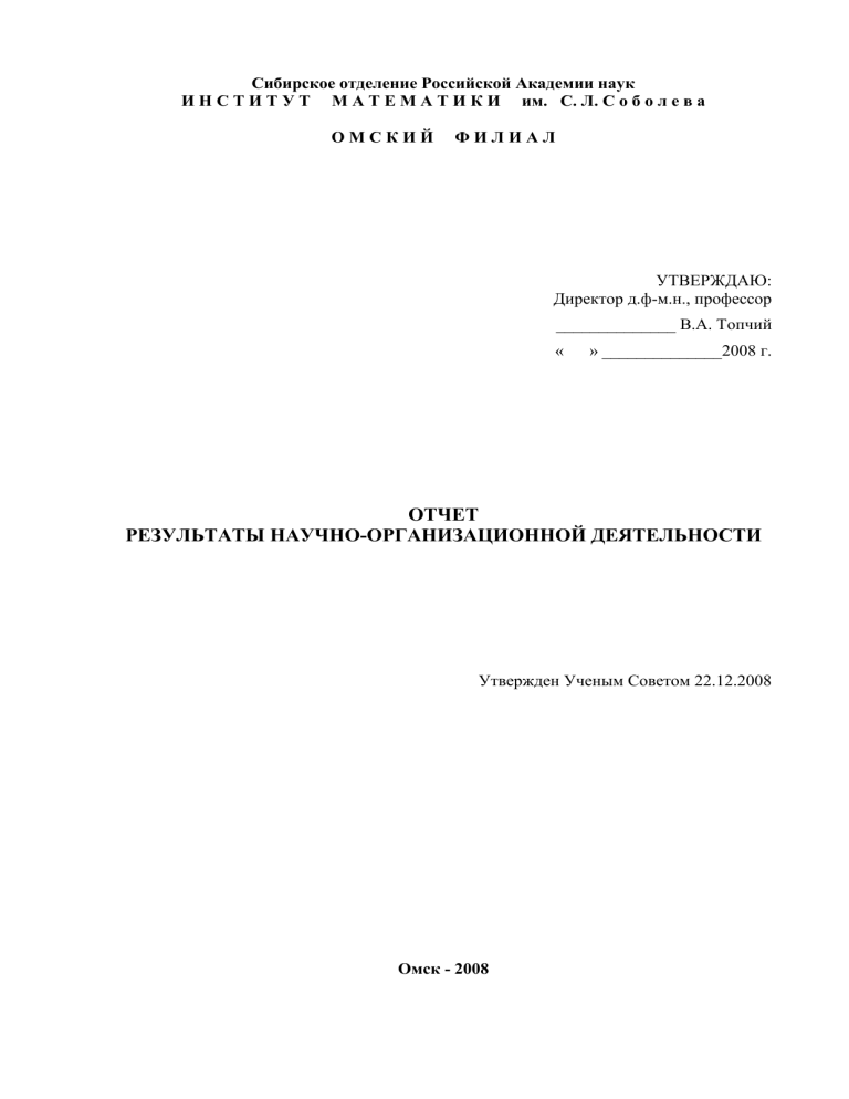 Сибирское отделение Российской Академии наук И Н С Т И Т У Т М А Т Е М А Т И К И им. С. Л. С о б о л е в а ОМСКИЙ ФИЛИАЛ УТВЕРЖДАЮ: Директор д.ф-м.н., профессор ______________ В.А. Топчий « » ______________2008 г. ОТЧЕТ РЕЗУЛЬТАТЫ НАУЧНО-ОРГАНИЗАЦИОННОЙ ДЕЯТЕЛЬНОСТИ Утвержден Ученым Советом 22.12.2008 Омск - 2008 2 РЕФЕРАТ Отчет содержит 26 стр. текста и 115 названий публикаций. В отчете представлены результаты фундаментальных и прикладных исследований и разработок, проведенных в 2008 г. Омским филиалом Института математики им. С.Л. Соболева СО РАН. Дана краткая информация о научно-организационной деятельности в СО РАН, в Омском регионе и в рамках международных контактов. Ключевые слова: комбинаторная алгебра, теория вероятностей, математическое моделирование, начально-краевые задачи гидродинамики, методы оптимизации, информационные модели. Директор д.ф.-м.н., профессор Валентин Алексеевич Топчий т. (3812) 236567, admin@ofim.oscsbras.ru Ученый секретарь Валентина Александровна Планкова т. (3812) 247041, plankova@ofim.oscsbras.ru http://ofim.oscsbras.ru 3 ОГЛАВЛЕНИЕ I. ВВЕДЕНИЕ .............................................................................................................................. 4 II. ИТОГИ НАУЧНЫХ ИССЛЕДОВАНИЙ ............................................................................. 5 II. ИТОГИ НАУЧНЫХ ИССЛЕДОВАНИЙ ............................................................................. 5 2.1. Важнейшие научные результаты ............................................................................... 5 2.2. Научная работа лабораторий ...................................................................................... 6 III. НАУЧНО-ОРГАНИЗАЦИОННАЯ ДЕЯТЕЛЬНОСТЬ ................................................... 12 3.1. Проекты, имеющие поддержку на международном, федеральном и региональном уровнях ....................................................................................................... 12 3.2. Характеристика международных научных связей и совместной деятельности с зарубежными научными учреждениями ..................................................................... 14 3.3. Участие в работе научных мероприятий ................................................................ 15 3.4. Работа в ВУЗах ............................................................................................................. 16 3.6. Список научных публикаций .................................................................................... 18 IV. СПРАВОЧНАЯ ИНФОРМАЦИЯ ..................................................................................... 26 4.1. Почетные звания, премии, стипендии .................................................................... 26 4.2. Основные количественные показатели 2008г. ....................................................... 26 4.3. Участие в работе конференций, совещаний и т.д. ................................................. 26 4.4. Научные публикации сотрудников по годам ........................................................ 26 4 I. ВВЕДЕНИЕ Структурные подразделения Лаборатория комбинаторных и вычислительных методов алгебры и логики Лаборатория теоретико-вероятностных методов Лаборатория математического моделирования в механике Лаборатория моделирования сложных систем Лаборатория методов преобразования и представления информации Лаборатория дискретной оптимизации Центр информационного обслуживания научных исследований Основные задания к плану научно-исследовательских работ Института математики им. С.Л. Соболева Сибирского отделения Российской Академии наук НИР ИМ СО РАН: ПСО № 40 от 12.02.07. 1.1.1.1. Исследования в области некоммутативной алгебры, рук. – Мазуров В.Д., исп. – Ремесленников В.Н., Есып Е.С., Даниярова Э.Ю., Лопатин А.А., Берестовский В.Н., Носков Г.А., Рыбалов А.Н., 2007-2011 гг. НИР ОФ ИМ СО РАН: ПСО № 40 от 12.02.07. 1.1.3.2. Стохастические модели биологических систем, рук. – Топчий В.А., исп. – Перцев Н.В., Клоков С.А., Гольтяпин В.В.