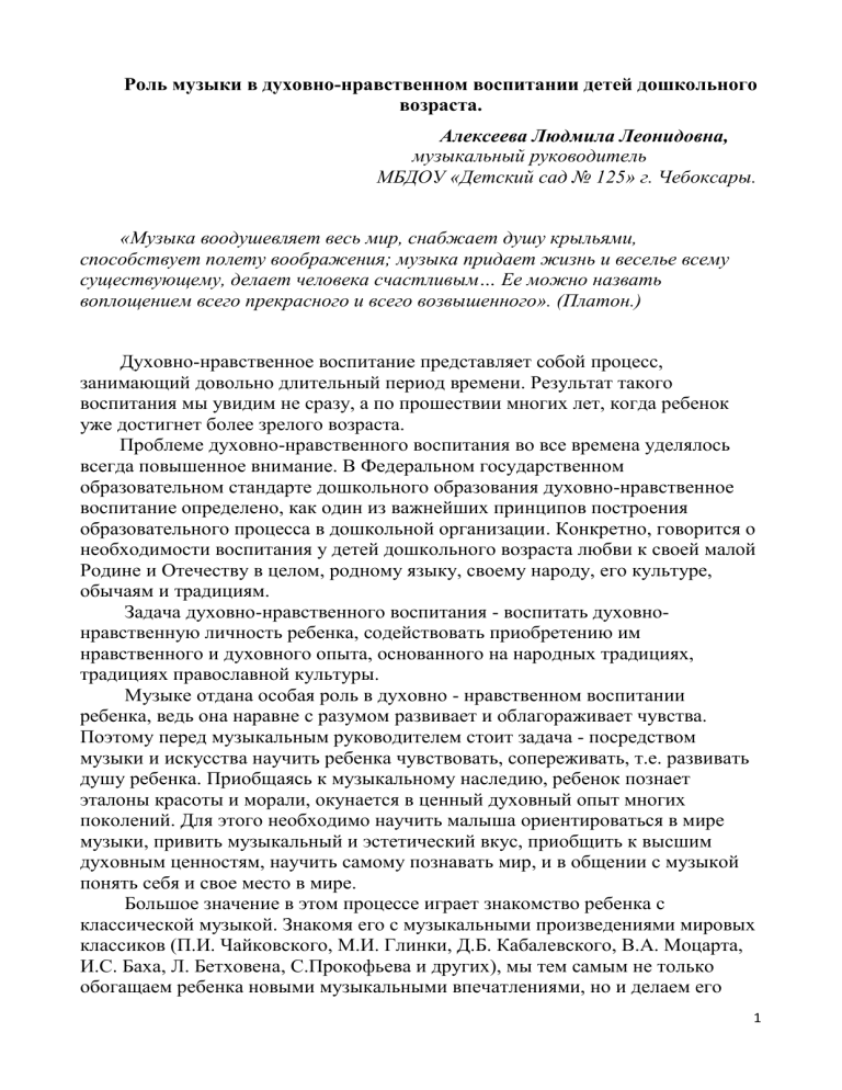 Роль музыки в духовно-нравственном воспитании детей дошкольного возраста. Алексеева Людмила Леонидовна, музыкальный руководитель МБДОУ «Детский сад № 125» г. Чебоксары. «Музыка воодушевляет весь мир, снабжает душу крыльями, способствует полету воображения; музыка придает жизнь и веселье всему существующему, делает человека счастливым… Ее можно назвать воплощением всего прекрасного и всего возвышенного». (Платон.) Духовно-нравственное воспитание представляет собой процесс, занимающий довольно длительный период времени. Результат такого воспитания мы увидим не сразу, а по прошествии многих лет, когда ребенок уже достигнет более зрелого возраста. Проблеме духовно-нравственного воспитания во все времена уделялось всегда повышенное внимание. В Федеральном государственном образовательном стандарте дошкольного образования духовно-нравственное воспитание определено, как один из важнейших принципов построения образовательного процесса в дошкольной организации. Конкретно, говорится о необходимости воспитания у детей дошкольного возраста любви к своей малой Родине и Отечеству в целом, родному языку, своему народу, его культуре, обычаям и традициям. Задача духовно-нравственного воспитания - воспитать духовнонравственную личность ребенка, содействовать приобретению им нравственного и духовного опыта, основанного на народных традициях, традициях православной культуры. Музыке отдана особая роль в духовно - нравственном воспитании ребенка, ведь она наравне с разумом развивает и облагораживает чувства. Поэтому перед музыкальным руководителем стоит задача - посредством музыки и искусства научить ребенка чувствовать, сопереживать, т.е. развивать душу ребенка. Приобщаясь к музыкальному наследию, ребенок познает эталоны красоты и морали, окунается в ценный духовный опыт многих поколений. Для этого необходимо научить малыша ориентироваться в мире музыки, привить музыкальный и эстетический вкус, приобщить к высшим духовным ценностям, научить самому познавать мир, и в общении с музыкой понять себя и свое место в мире. Большое значение в этом процессе играет знакомство ребенка с классической музыкой. Знакомя его с музыкальными произведениями мировых классиков (П.И. Чайковского, М.И. Глинки, Д.Б. Кабалевского, В.А. Моцарта, И.С. Баха, Л. Бетховена, С.Прокофьева и других), мы тем самым не только обогащаем ребенка новыми музыкальными впечатлениями, но и делаем его 1 внутренний мир богаче, чище и ярче. Не менее важным для воспитания духовно-нравственной личности является и знакомство ребенка с фольклором, который всегда был и остается самым простым, доступным и понятным материалом для детей: начиная с колыбельных песен и заканчивая удалой пляской.В России духовнонравственное воспитание всегда способствовало становлению человека на основе православной культуры, фольклора. В детском саду, начиная с раннего возраста, начинается знакомство с наиболее простыми, а затем и более сложными формами фольклора. Сначала ребенок слушает и подпевает потешки, колыбельные, народные прибаутки, подражая музыкальному руководителю, затем воспроизводит звуки на шумовых инструментах: погремушке, бубне, колокольчике. В более старшем возрасте ребенок уже овладевает приемами игры на деревянных ложках, трещотке, рубеле; исполняет различные по характе