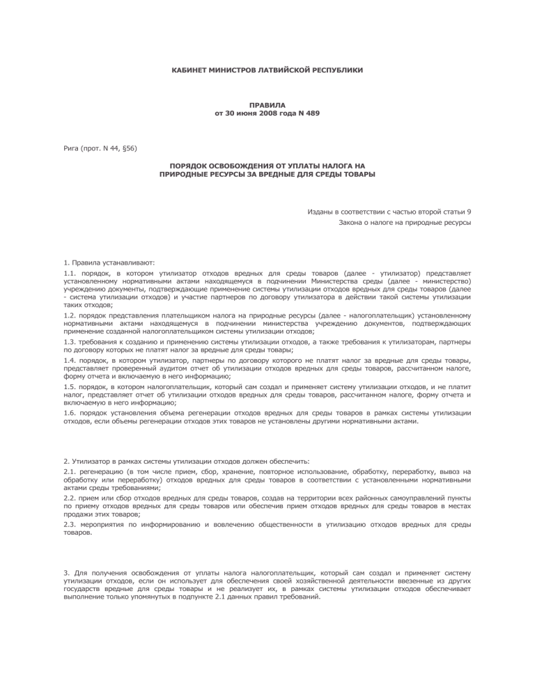 КАБИНЕТ МИНИСТРОВ ЛАТВИЙСКОЙ РЕСПУБЛИКИ ПРАВИЛА от 30 июня 2008 года N 489 Рига (прот. N 44, §56) ПОРЯДОК ОСВОБОЖДЕНИЯ ОТ УПЛАТЫ НАЛОГА НА ПРИРОДНЫЕ РЕСУРСЫ ЗА ВРЕДНЫЕ ДЛЯ СРЕДЫ ТОВАРЫ Изданы в соответствии с частью второй статьи 9 Закона о налоге на природные ресурсы 1. Правила устанавливают: 1.1. порядок, в котором утилизатор отходов вредных для среды товаров (далее - утилизатор) представляет установленному нормативными актами находящемуся в подчинении Министерства среды (далее - министерство) учреждению документы, подтверждающие применение системы утилизации отходов вредных для среды товаров (далее - система утилизации отходов) и участие партнеров по договору утилизатора в действии такой системы утилизации таких отходов; 1.2. порядок представления плательщиком налога на природные ресурсы (далее - налогоплательщик) установленному нормативными актами находящемуся в подчинении министерства учреждению документов, подтверждающих применение созданной налогоплательщиком системы утилизации отходов; 1.3. требования к созданию и применению системы утилизации отходов, а также требования к утилизаторам, партнеры по договору которых не платят налог за вредные для среды товары; 1.4. порядок, в котором утилизатор, партнеры по договору которого не платят налог за вредные для среды товары, представляет проверенный аудитом отчет об утилизации отходов вредных для среды товаров, рассчитанном налоге, форму отчета и включаемую в него информацию; 1.5. порядок, в котором налогоплательщик, который сам создал и применяет систему утилизации отходов, и не платит налог, представляет отчет об утилизации отходов вредных для среды товаров, рассчитанном налоге, форму отчета и включаемую в него информацию; 1.6. порядок установления объема регенерации отходов вредных для среды товаров в рамках системы утилизации отходов, если объемы регенерации отходов этих товаров не установлены другими нормативными актами. 2. Утилизатор в рамках системы утилизации отходов должен обеспечить: 2.1. регенерацию (в том числе прием, сбор, хранение, повторное использование, обработку, переработку, вывоз на обработку или переработку) отходов вредных для среды товаров в соответствии с установленными нормативными актами среды требованиями; 2.2. прием или сбор отходов вредных для среды товаров, создав на территории всех районных самоуправлений пункты по приему отходов вредных для среды товаров или обеспечив прием отходов вредных для среды товаров в местах продажи этих товаров; 2.3. мероприятия по информированию и вовлечению общественности в утилизацию отходов вредных для среды товаров. 3. Для получения освобождения от уплаты налога налогоплательщик, который сам создал и применяет систему утилизации отходов, если он использует для обеспечения своей хозяйственной деятельности ввезенные из других государств вредные для среды товары и не реализует их, в рамках системы утилизации отходов обеспечивает выполнение только упомянутых в подпункте 2.1 данных правил требований. 4. Для получения освобождения от уплаты налога налогоплательщик, который первым реализует на территории Латвийской Республики вредные для среды товары только коммерсантам и который сам создал и применяет систему утилизации отходов, в рамках системы утилизации отходов обеспечивает: 4.1. выполнение упомянутых в подпун