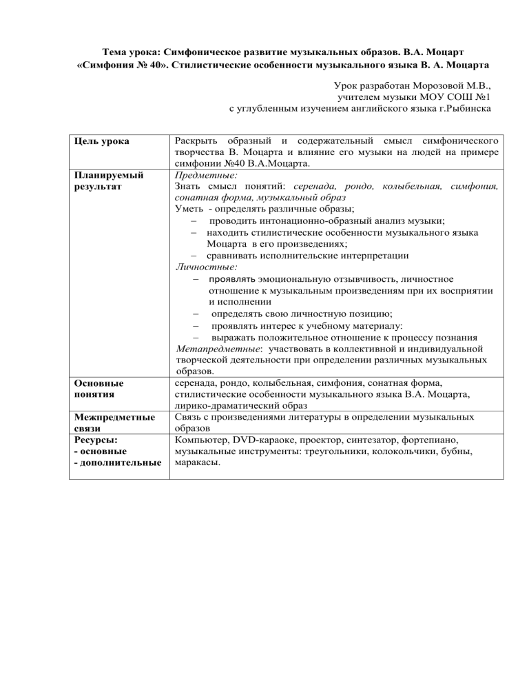 Тема урока: Симфоническое развитие музыкальных образов. В.А. Моцарт «Симфония № 40». Стилистические особенности музыкального языка В. А. Моцарта Урок разработан Морозовой М.В., учителем музыки МОУ СОШ №1 с углубленным изучением английского языка г.Рыбинска Цель урока Планируемый результат Основные понятия Межпредметные связи Ресурсы: - основные - дополнительные Раскрыть образный и содержательный смысл симфонического творчества В. Моцарта и влияние его музыки на людей на примере симфонии №40 В.А.Моцарта. Предметные: Знать смысл понятий: серенада, рондо, колыбельная, симфония, сонатная форма, музыкальный образ Уметь - определять различные образы; проводить интонационно-образный анализ музыки; находить стилистические особенности музыкального языка Моцарта в его произведениях; сравнивать исполнительские интерпретации Личностные: проявлять эмоциональную отзывчивость, личностное отношение к музыкальным произведениям при их восприятии и исполнении определять свою личностную позицию; проявлять интерес к учебному материалу: выражать положительное отношение к процессу познания Метапредметные: участвовать в коллективной и индивидуальной творческой деятельности при определении различных музыкальных образов. серенада, рондо, колыбельная, симфония, сонатная форма, стилистические особенности музыкального языка В.А. Моцарта, лирико-драматический образ Связь с произведениями литературы в определении музыкальных образов Компьютер, DVD-караоке, проектор, синтезатор, фортепиано, музыкальные инструменты: треугольники, колокольчики, бубны, маракасы. № Этапы проведения урока Деятельность учеников Деятельность учителя Задания для учащихся, выполнение которых приведёт к достижению запланированных результатов Учитель начинает урок с песни о весне, чтобы поднять эмоциональный тон у учащихся и настроить на творчество В.А. Моцарта. Какие чувства и эмоции вызвала у вас эта песня? Назовите композитора, чья музыка ассоциируются у любого человека с весной, солнцем, несет свет, надежду на лучшее?: «Вечный солнечный свет в музыке, имя тебе …Моцарт»,− восклицал А.Г. Рубинштейн. Создаёт условия для возникновения у учеников внутренней потребности включения в учебную деятельность А вам нравится музыка Моцарта? А почему? А. С. Пушкин в своей Маленькой трагедии писал «В печали весел, а в веселье печален». Как вы думаете, подходит ли это высказывание к музыке Моцарта? Дать ответ на этот вопрос нам поможет сама музыка – музыка Моцарта. Это и будет темой нашего урока: Мир музыкальных образов Моцарта. Исполнение песни «Весеннее танго» В. Миляева Владеть навыками вокально-хорового музицирования Проявлять эмоциональную отзывчивость, личностное отношение к исполняемой песне Сравнить высказывания Понимать значимость музыки творчестве писателей поэтов Высказывать собственные суждение о музыке Моцарта 1. Мотивирование к учебной деятельности Цель: заинтересовать детей через определение личной значимости, практической направленности, социальной ситуации и т.д. Учащиеся исполняют песню «Весеннее танго» В. Миляева 2. Формулирование темы урока, постановка цели Цели: подведение детей к формулированию конкретной, достижимой, понятной цели Учащиеся сравнивают высказывания и пытаются определить, какая же музыка Моцарта Планируемые результаты Личностн