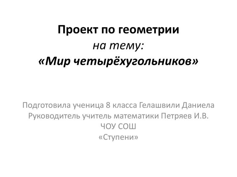 Проект по геометрии на тему: «Мир четырёхугольников» Подготовила ученица 8 класса Гелашвили Даниела Руководитель учитель математики Петряев И.В. ЧОУ СОШ «Ступени» Природа говорит языком математики: буквы этого языка – математические фигуры, треугольники, четырёхугольники. Г. Галилей – великий итальянский физик, механик, астроном Немного из истории Термин «ПАРАЛЛЕЛОГРАММ» греческого происхождения был выведен Евклидом. Понятие параллелограмма и некоторые его свойства были известны ещё пифагорейцам. В «Началах» Евклида доказывается теорема о том, что в параллелограмме противоположные стороны равны и противоположные углы равны, а диагональ разделяет его пополам. Евклид не упоминает о том, что точка пересечения диагоналей делит их пополам. Он не рассматривает ни прямоугольника, ни ромба. Полная теория параллелограммов была разработана к концу средних веков и появилась в учебниках лишь в XVII веке. Все теоремы о параллелограммах основываются непосредственно или косвенно на аксиоме параллельности Евклида. Немного из истории «ТРАПЕЦИЯ» - слово греческое, означавшее в древности «столик» (по-гречески «трапедзион», что означает столик «обеденный столик»). В «Началах» термин «трапеция» применяется не в современном, а в другом смысле: любой четырёхугольник (не параллелограмм). «Трапеция» в нашем смысле встречается впервые у древнегреческого математика Посидония. Лишь в XVIII веке это слово приобретает современный смысл. Предположение о том, что средняя линия трапеции равна полу сумме её оснований, было известно древним египтянам, оно содержится в папирусе Ахмеса и фигурирует в виде инскрипции на стенах храма Эдфу в Верхнем Египте. Это предложение было также известно вавилонским землемерам, оно содержится и в трудах Герона Александрийского. Немного из истории Термин «КВАДРАТ» происходит от латинского «квадратум» («Квадрате» - сделать четырёхугольным). Первый четырёхугольник, с которым познакомилась геометрия, был квадрат. Немного из истории Вычислением площадей фигур занимались ещё в древности. Примерно 4-5 тыс. лет назад вавилоняне умели определять площадь прямоугольника и трапеции в квадратных единицах. Квадрат издавна служил эталоном при измерении площадей благодаря многим своим замечательным свойствам: равные стороны, равные и прямые углы, симметричность и общее совершенство формы. А в древнем Китае мерой площади был прямоугольник. Немного из истории Древние египтяне 4000 лет назад пользовались почти теми же приемами, что и мы, для измерения площади прямоугольника и трапеции: для трапеций сумма параллельных сторон делилась пополам и умножалась на высоту. Для вычисления площади четырёхугольника со сторонами а, b, с, d (рис.1) применялась формула , т.е. умножались полу суммы противоположных сторон. Эта формула верна только для прямоугольника. С её помощью можно вычислить приближённо площадь таких четырёхугольников, у которых углы близки к прямым. Немного из истории В своих «Началах» Евклид не употреблял слово «площадь», так как он под самим словом «фигура» понимал часть плоскости, ограниченную той или иной замкнутой линией. Евклид не выражал результат измерения площади числом, а сравнивал площади разных фигур между собой. Слово «РОМБ», как и параллелограмм, греческого происхождения, оно означает вращающееся тело. В «Нач