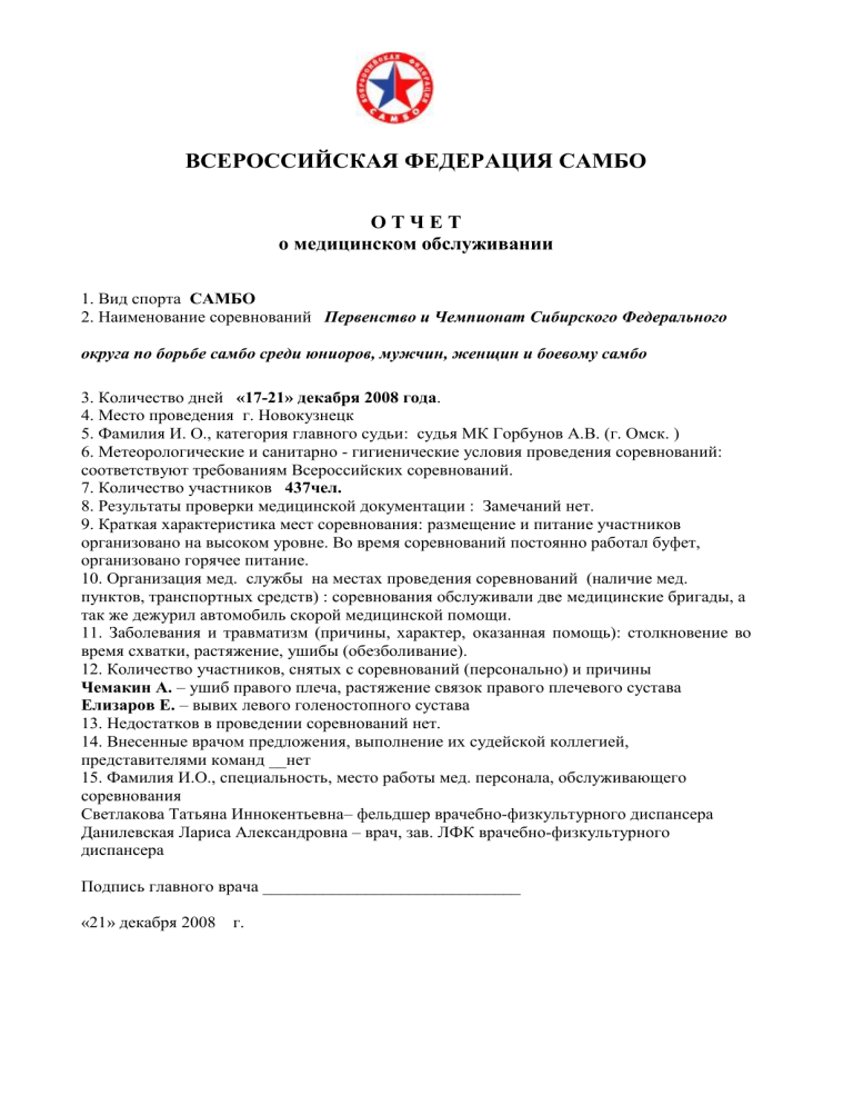ВСЕРОССИЙСКАЯ ФЕДЕРАЦИЯ САМБО ОТЧЕТ о медицинском обслуживании 1. Вид спорта САМБО 2. Наименование соревнований Первенство и Чемпионат Сибирского Федерального округа по борьбе самбо среди юниоров, мужчин, женщин и боевому самбо 3. Количество дней «17-21» декабря 2008 года. 4. Место проведения г. Новокузнецк 5. Фамилия И. О., категория главного судьи: судья МК Горбунов А.В. (г. Омск. ) 6. Метеорологические и санитарно - гигиенические условия проведения соревнований: соответствуют требованиям Всероссийских соревнований. 7. Количество участников 437чел. 8. Результаты проверки медицинской документации : Замечаний нет. 9. Краткая характеристика мест соревнования: размещение и питание участников организовано на высоком уровне. Во время соревнований постоянно работал буфет, организовано горячее питание. 10. Организация мед. службы на местах проведения соревнований (наличие мед. пунктов, транспортных средств) : соревнования обслуживали две медицинские бригады, а так же дежурил автомобиль скорой медицинской помощи. 11. Заболевания и травматизм (причины, характер, оказанная помощь): столкновение во время схватки, растяжение, ушибы (обезболивание). 12. Количество участников, снятых с соревнований (персонально) и причины Чемакин А. – ушиб правого плеча, растяжение связок правого плечевого сустава Елизаров Е. – вывих левого голеностопного сустава 13. Недостатков в проведении соревнований нет. 14. Внесенные врачом предложения, выполнение их судейской коллегией, представителями команд __нет 15. Фамилия И.О., специальность, место работы мед. персонала, обслуживающего соревнования Светлакова Татьяна Иннокентьевна– фельдшер врачебно-физкультурного диспансера Данилевская Лариса Александровна – врач, зав. ЛФК врачебно-физкультурного диспансера Подпись главного врача ______________________________ «21» декабря 2008 г.
