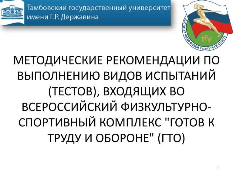 МЕТОДИЧЕСКИЕ РЕКОМЕНДАЦИИ ПО ВЫПОЛНЕНИЮ ВИДОВ ИСПЫТАНИЙ (ТЕСТОВ), ВХОДЯЩИХ ВО ВСЕРОССИЙСКИЙ ФИЗКУЛЬТУРНОСПОРТИВНЫЙ КОМПЛЕКС "ГОТОВ К ТРУДУ И ОБОРОНЕ" (ГТО) 1 Челночный бег 3 x 10 м. Челночный бег проводится на любой ровной площадке с твердым покрытием, обеспечивающим хорошее сцепление с обувью. На расстоянии 10 м прочерчиваются 2 параллельные линии - "Старт" и "Финиш". Участник, не наступая на стартовую линию, принимает положение высокого старта. По команде "Марш!" (с одновременным включением секундомера) участник бежит до финишной линии, касается линии рукой, возвращается к линии старта, касается ее и преодолевает последний отрезок без касания линии финиша рукой. Секундомер останавливают в момент пересечения линии "Финиш". Участники стартуют по 2 человека. 2 Бег на 30, 60, 100 м. Бег проводится по дорожкам стадиона или на любой ровной площадке с твердым покрытием. Бег на 30 м выполняется с высокого старта, бег на 60 и 100 м - с низкого или высокого старта. Участники стартуют по 2 - 4 человека. Бег на 1; 1,5; 2; 3 км. Бег на выносливость проводится по беговой дорожке стадиона или любой ровной местности. Максимальное количество участников забега - 20 человек. 3 Смешанное передвижение Смешанное передвижение состоит из бега, переходящего в ходьбу в любой последовательности. Проводится по беговой дорожке стадиона или любой ровной местности. Максимальное количество участников забега - 20 человек. 4 Прыжок в длину с места толчком двумя ногами. Прыжок в длину с места толчком двумя ногами выполняется в секторе для горизонтальных прыжков. Место отталкивания должно обеспечивать хорошее сцепление с обувью. Участник принимает исходное положение (далее - ИП): ноги на ширине плеч, ступни параллельно, носки ног перед линией измерения. Одновременным толчком двух ног выполняется прыжок вперед. Мах руками разрешен. Измерение производится по перпендикулярной прямой от линии измерения до ближайшего следа, оставленного любой частью тела участника. Участнику предоставляются три попытки. В зачет идет лучший результат. Ошибки: 1) заступ за линию измерения или касание ее; 2) выполнение отталкивания с предварительного подскока; 3) отталкивание ногами разновременно. 5 Прыжок в длину с разбега Прыжок в длину с разбега выполняется в секторе для горизонтальных прыжков. Измерение производится по перпендикулярной прямой от места отталкивания до ближайшего следа, оставленного любой частью тела участника. Участнику предоставляются три попытки. В зачет идет лучший результат. 6 Подтягивание из виса лежа на низкой перекладине Подтягивание на низкой перекладине выполняется из ИП: вис лежа лицом вверх хватом сверху, кисти рук на ширине плеч, голова, туловище и ноги составляют прямую линию, пятки могут упираться в опору высотой до 4 см. Высота грифа перекладины для участников I - III ступеней - 90 см. Высота грифа перекладины для участников IV - IX ступеней - 110 см. Для того чтобы занять ИП, участник подходит к перекладине, берется за гриф хватом сверху, приседает под гриф и, держа голову прямо, ставит подбородок на гриф перекладины. После чего, не разгибая рук и не отрывая подбородка от перекладины, шагая вперед, выпрямляется так, чтобы голова, туловище и ноги составляли прямую линию. Помощник судьи подставляет опору под ноги участника. После этого участник выпрямляет руки и занимает ИП. Из ИП участни