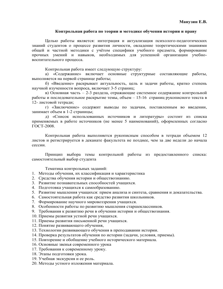 Манузин Е.В. Контрольная работа по теории и методике обучения истории и праву Целью работы является: интеграция и актуализация психолого-педагогических знаний студентов о процессе развития личности, овладение теоретическими знаниями общей и частной методики с учётом специфики учебного предмета, формирование прочных умений и навыков, необходимых для успешной организации учебновоспитательного процесса. Контрольная работа имеет следующую структуру: а) «Содержание» включает основные структурные составляющие работы, выполняется на первой странице работы; б) «Введение» раскрывает актуальность, цель и задачи работы, кратко степень научной изученности вопроса, включает 3-5 страниц; в) Основная часть – 2-3 раздела, отражающие системное содержание контрольной работы и последовательное раскрытие темы, объем – 15-16 страниц рукописного текста в 12- листовой тетради; г) «Заключение» содержит выводы по задачам, поставленным во введении, занимает объем в 1-2 страницы; д) «Список использованных источников и литературы» состоит из списка применяемых в работе источников (не менее 5 наименований), оформленных согласно ГОСТ-2008. Контрольная работа выполняется рукописным способом в тетради объемом 12 листов и регистрируется в деканате факультета не позднее, чем за две недели до начала сессии. Принцип выбора темы контрольной работы из предоставленного списка: самостоятельный выбор студента Тематика контрольных заданий: 1. Методы обучения, их классификация и характеристика 2. Средства обучения истории и обществознанию. 3. Развитие познавательных способностей учащихся. 4. Подготовка учащихся к самообразованию. 5. Развитие мышления учащихся: прием анализа и синтеза, сравнения и доказательства. 6. Самостоятельная работа как средство развития школьников. 7. Формирование научного мировоззрения учащихся. 8. Особенности работы по развитию мышления старшеклассников. 9. Требования к развитию речи в обучении истории и обществознания. 10. Приемы развития устной речи учащихся. 11. Приемы развития письменной речи учащихся. 12. Понятие развивающего обучения, 13. Технологии развивающего обучения в преподавании истории. 14. Проверка результатов обучения по истории (задачи, условия, приемы). 15. Повторение и обобщение учебного исторического материала. 16. Основные звенья современного урока 17. Требования к современному уроку. 18. Этапы подготовки урока. 19. Учебная экскурсия и ее роль. 20. Методы устного изложения материала. 21. Использование наглядных методов в обучении истории и обществознания. 22. Роль художественной литературы в преподавании истории и обществознания. 23. Определение целей урока. 24. Календарно-тематическое и поурочное планирование. 25. Анализ и самоанализ урока. 26. Учебник истории, его структура и роль. 27. Факультативные курсы в школе. 28. Работа с историческим источником на уроке. 29. Учебные пособия на уроке истории и обществознания. 30. Этапы развития методики преподавания. 31. Базовый учебный план. План школы. 32. Связь методики обучения с другими науками33. Концепция современного исторического образования. 34. Цели исторического образования 35. Структура исторических знаний. 36. Практические методы обучения истории. 37. Источники исторических знаний. 38. Приемы и средства изложения главных исторических фактов. 39. Формирование системы исторических понятий. 40. Урок 