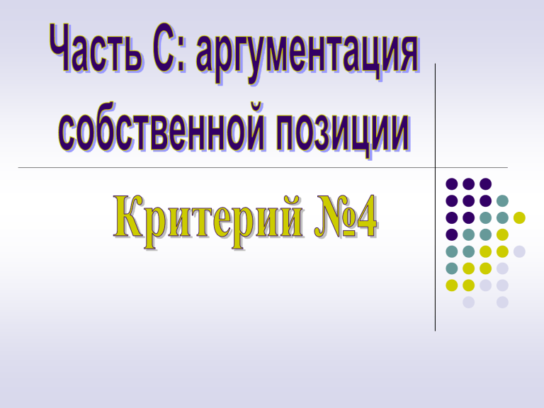 Аргументация собственной позиции № Критерии проверки и оценки сочинения Баллы 4. Экзаменуемый выразил своё мнение по сформулированной им проблеме, поставленной автором текста (согласившись или не согласившись с 3 позицией автора), аргументировал его (привёл не менее 2х аргументов, один из которых взят из художественной, публицистической или научной литературы Экзаменуемый выразил своё мнение по сформулированной им проблеме, поставленной автором текста (согласившись или не согласившись с позицией автора), аргументировал его (привёл не менее 2-х аргументов, опираясь на знания, жизненный опыт), или привёл только 1 аргумент из художественной, публицистической или научной литературы 2 Аргументация собственной позиции Экзаменуемый выразил своё мнение по сформулированной им проблеме, поставленной автором текста (согласившись или не согласившись с позицией автора), аргументировал его (привёл 1 аргумент), опираясь на знания, жизненный опыт Экзаменуемый сформулировал своё мнение по проблеме, поставленной автором текста (согласившись или не согласившись с позицией автора), но не привёл аргументов, или мнение экзаменуемого заявлено лишь формально (например: «Я согласен / не согласен с автором»), или мнение экзаменуемого вообще не отражено в работе 1 0 выразить в сочинении своё мнение по сформулированной проблеме, согласившись или не согласившись с позицией автора. В своём ответе вы должны привести два аргумента, опираясь на знания, жизненный или читательский опыт. Недостаточно лишь формально заявить о своём мнении: Я согласен (не согласен) с автором. Ваша позиция, даже если она совпадает с авторской, должна быть сформулирована в отдельном предложении. (Образец: Таким образом, автор стремится донести до читателя мысль о том, что природа уже давно нуждается в помощи каждого из нас. Я полностью согласен с автором и тоже считаю, что человечество должно пересмотреть своё потребительское отношение к природе.) Ваша позиция должна быть подкреплена двумя аргументами. В этой части работы вы должны строго следовать правилам построения текста - рассуждения. Аргументация — это приведение доказательств, объяснений, примеров для обоснования какой-либо мысли перед слушателями (читателями) или собеседником. Аргументы — это доказательства, приводимые в поддержку тезиса: факты, примеры, утверждения, объяснения —всё, что может подтвердить тезис. Важным элементом аргументации являются иллюстрации, т. е. примеры, поддерживающие аргумент. Рассмотрим пример иллюстрирования тезиса: Речь человека — это показатель его интеллектуального и нравственного развития. Аргумент 1 Действительно, порой речь «скажет» о человеке больше, чем лицо, одежда и многое другое. Иллюстрации к аргументу 1 Например, среди моих близких друзей нет таких, чья речь была бы пересыпана грубыми словами. Я убеждён, что каждое такое слово несёт в себе «отрицательный заряд». Да и кому хотелось бы услышать от близкого человека что-либо оскорбляющее слух? Аргумент 1 Правоту автора подтверждает и опыт художественной литературы. Не случайно писатели всегда рассматривали речь персонажа как важнейший способ его характеристики. Иллюстрации к аргументу 2 Вспомним хотя бы Порфирия Головлёва — героя романа М.Е. Салтыкова-Щедрина «Господа Головлёвы». Иудушка (таково его прозвище!) вовсе не скв